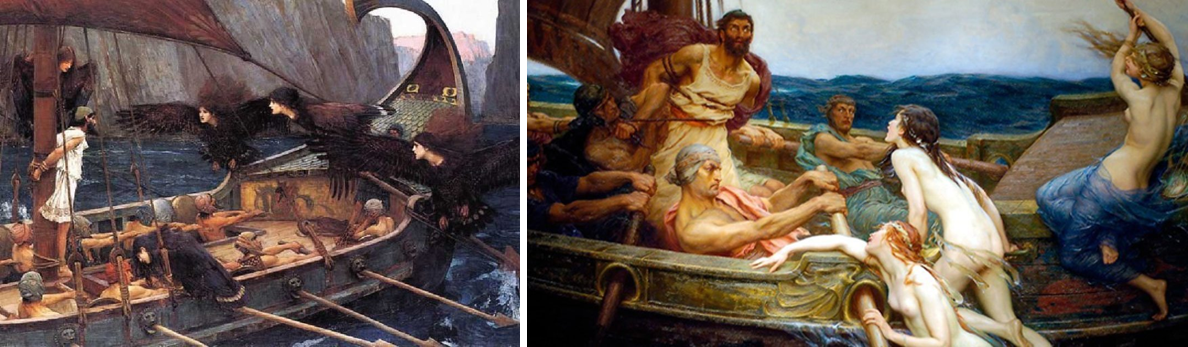명화 속 세이렌의 묘사. 반인반조 혹은 인어의 모습이며, 오디세우스를 유혹하는 장면이 자주 그려집니다.