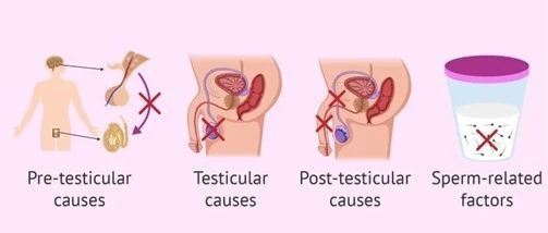그림. 남성의 다양한 불임 원인(출처-https://www.invitra.com/en/male-sterility/). 고환 이전(Pre-testicular)의 원인으로는 유전자 이상이나 호르몬 문제가 있을 것이고, 고환 자체의 기형도 문제가 될 수 있으며, 고환 이후(Post-testicular) 문제로는 정관의 이상 등으로 인한 정자 전달이 불가능한 상황 등이 있습니다. 그리고 정자 자체의 수가 적거나 비정상 활동성을 보이는 것도 남성 불임의 원인이 됩니다.