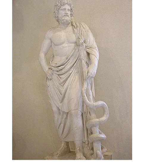 그림. 의술의 신인 아스클레피오스와 그를 상징하는 뱀이 휘감긴 지팡이. 아스클레피오스는 뱀을 때려죽이긴(?) 했지만, 어쨌든 뱀에게서 약초를 이용한 치유 능력을 배우게 됩니다.