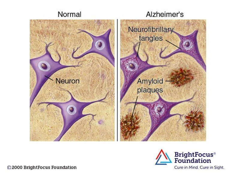 알츠하이머병의 병리(좌-정상, 우-알츠하이머병). 알츠하이머병의 경우, 뇌의 신경세포 주위에 베타아밀로이드가 축적되거나, 신경 세포 내에 타우 단백질이 축적되는 모습이 관찰됨.