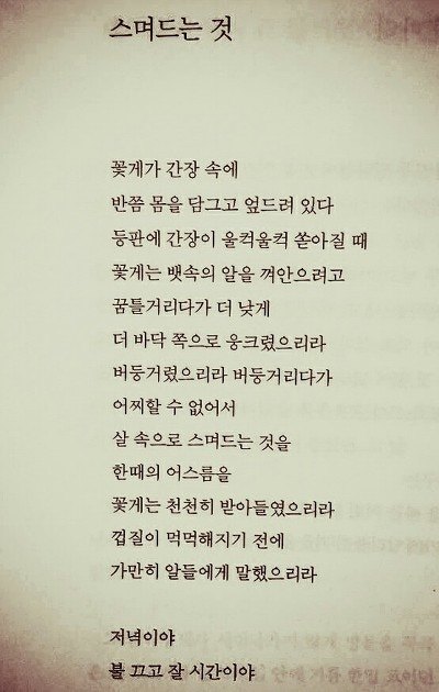그런데 내가 툴사에서 얘기한 최애시는 그 두 명의 작품이 아니었다. 석헌의 울컥한 모습을 보니 나도 감동적인 시를 얘기하고 싶었다. 당시는 누구 시인지 기억이 안 났지만 나중에 보니 안도현 시인이었다. 원제는 <스며드는 것>이었으나 내가 기억하는 제목은 <간장게장>이었다. 나는 그 시의 앞부분을 거의 기억하지 못했다. 상황묘사만 했을 뿐이다.