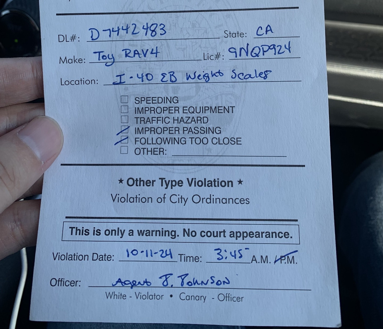 짐 검사를 마저 마친 경찰관이 최종적으로 우리에게 건넨 딱지엔 <Improper Passing: 부적절한 추월>, <Following too close: 차 간 간격 밀접>의 ‘죄명’이 체크되어 있었다. 그리고 단지 <경고>라며 별도 벌금 등의 부과는 없었다. 우리가 추월 차선으로 주행을 하고 있었던 것은 맞지만 제한속도를 크게 넘은 것도 아닌데 위의 <죄명>을 고려하니 더욱 이해되지 않았다. 특히 전원 짐검사를 한 것은 더더욱 이해가 안 되는 부분이었다.