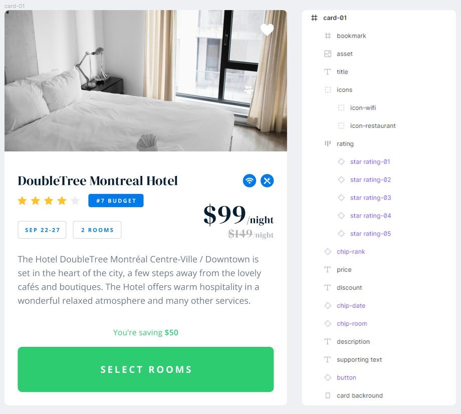 피그마 커뮤니티에서 구한 카드 템플릿텍스트 만으로는 추상적일 것 같아 예시 사진을 준비했다. 레이어의 쌓는 구조는 위에서부터 아래로, 왼쪽에서부터 오른쪽으로 시선이 먼저 닿는 기준으로 쌓는다. 팀원이 레이어명을 보고 특정 레이어가 카드 속 어떤 요소에 해당하는지 짚을 수 있는 정도를 목표로 하고 이름을 짓는다. 레이어 이름은 최대한 겹치지 않도록 쓴다. 'chip'같이 동일한 컴포넌트지만 안에 다른 정보를 표시하고 있다면 하이픈(-)을 붙인 후 해당하는 하위 정보를 써준다. 'star rating'처럼 완전히 반복되는 요소는 뒤에 숫자를 달아 구분해 준다.