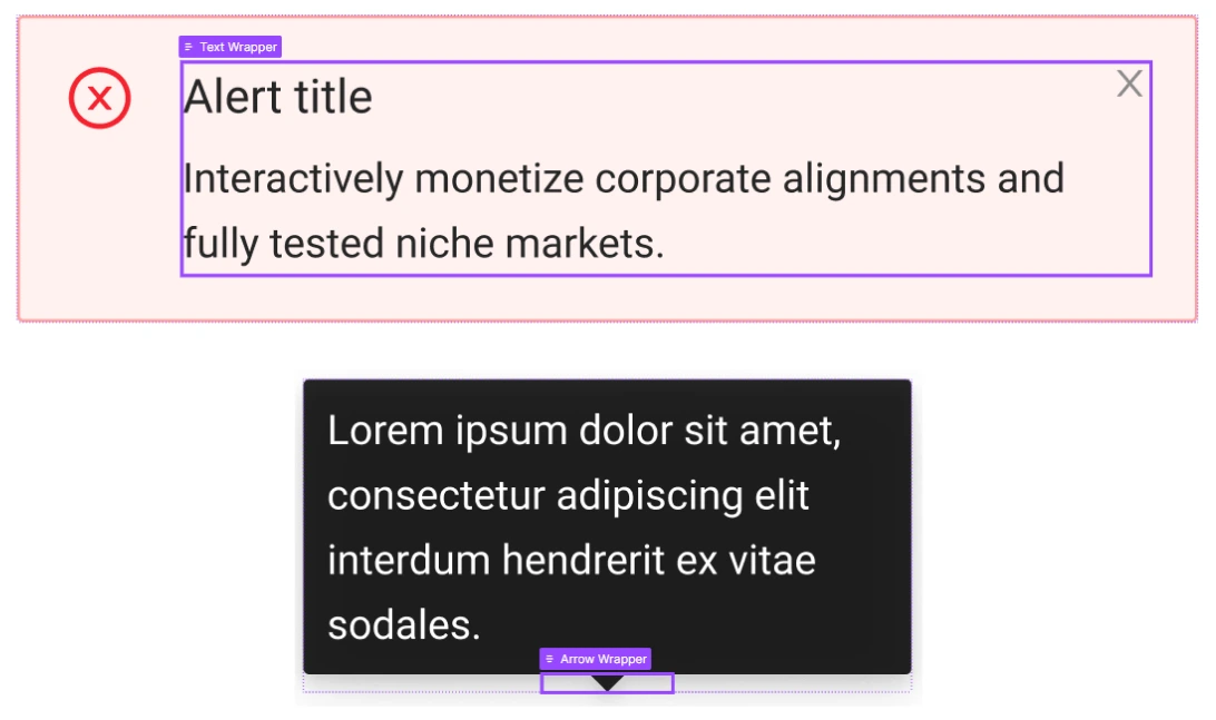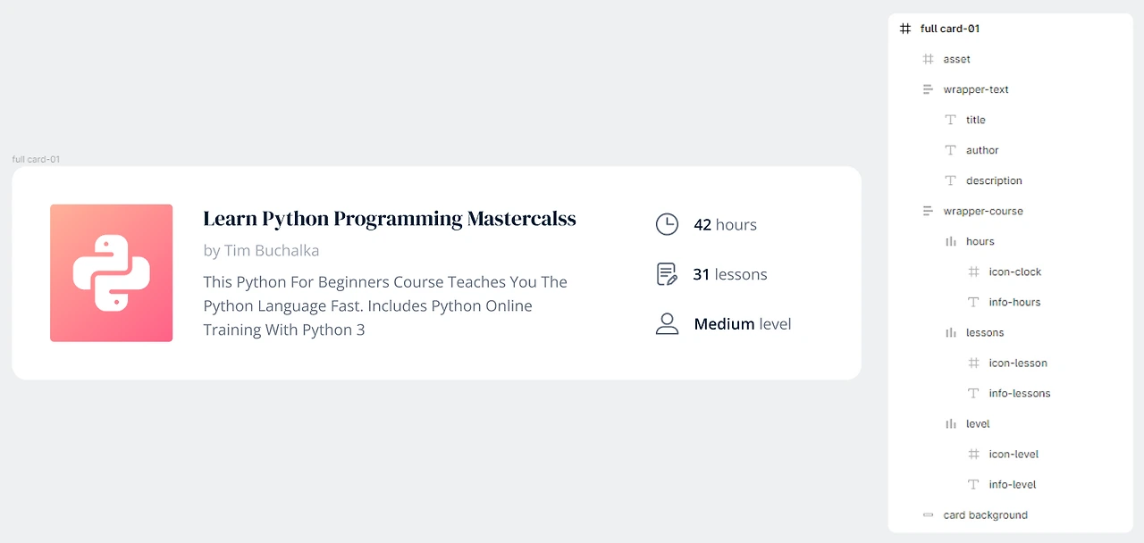 피그마 커뮤니티에서 구한 카드 템플릿정렬을 맞추기 위해서 요소들을 Auto layout으로 묶어주는 경우가 자주 있는데 이 경우에도 이름 짓기가 참 애매해진다. 여러 디자인 시스템 문서를 참고한 후 'wrapper'가 가장 어울린다고 생각해 그렇게 이름을 지었다.