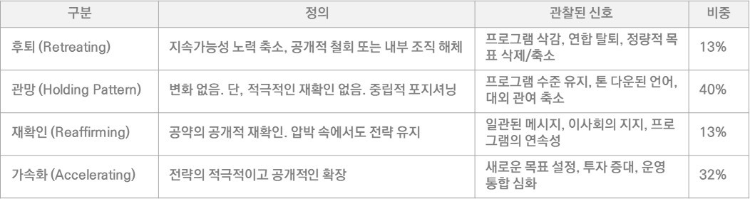 위 표에서 우리가 주목해야 할 현상은 '그린허싱'의 확산입니다. 지속가능성 프로그램을 유지하거나 확장하는 기업은 대다수이지만, 이를 대외적으로 재확인하는 기업은 소수였습니다. 정치적 표적이 되는 것을 피하기 위해 기업들은 이제 '하는 것'을 멈춘 것이 아니라, 대외적으로 '말하는 것'을 멈추었습니다.