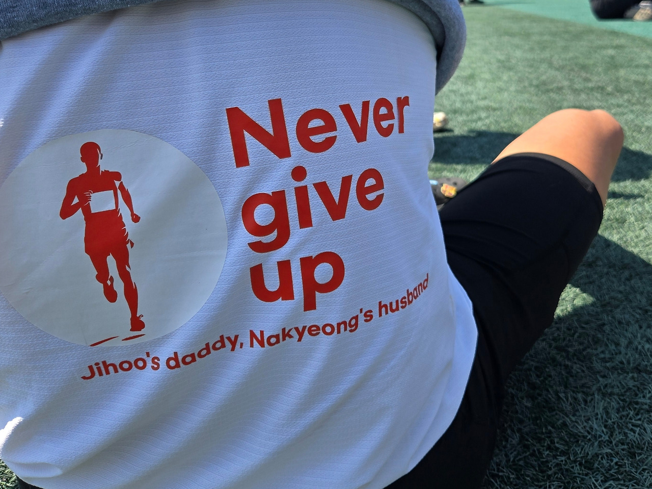 37km 지점, 힘듦이 절정에 다 달았을 즈음 터덜터덜 걷는 듯 뛰고 있는데 이름 모르는 누군가들이 배번에 적힌 이름을 보며 "○○○ 화이팅!!"하며 응원해 주고 어떤 이들은 등 뒤에 적힌 문구를 외쳐주었다. "Never give up 지후아빠, 나경이 남편!" 감동스러운 순간이다.