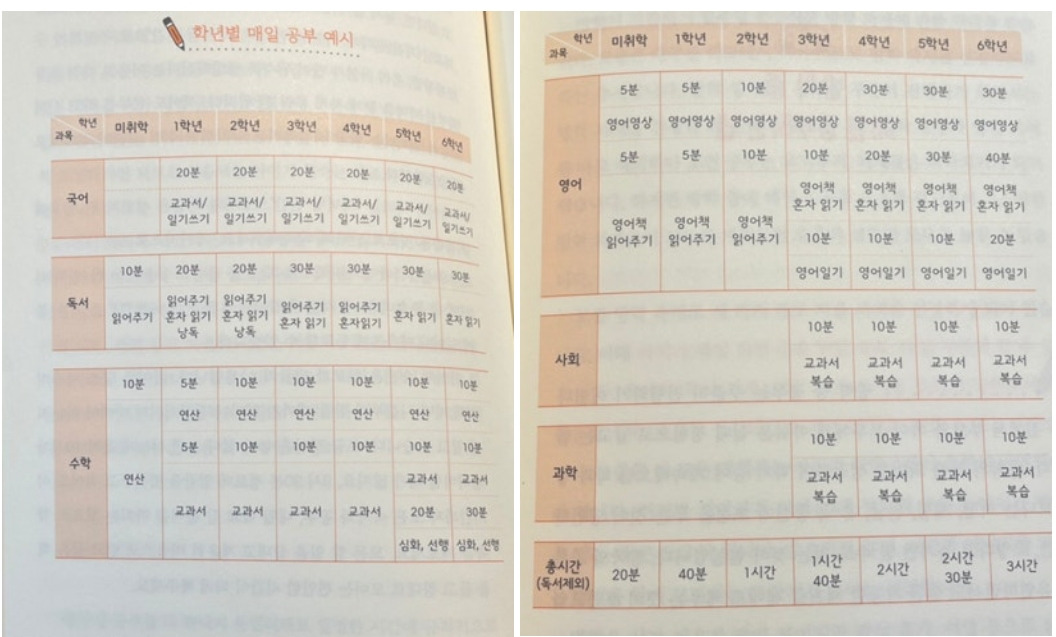 습관을 잡을 때는 가볍게 시작해 서서히 시간과 양을 늘려가야 한다는 것도 기억에 남아요. 아이가 초등학생이 되면 무리한 계획 때문에 불필요하게 시간과 에너지를 낭비하지 않도록 선생님이 제시한 예시 스케줄을 참고하려고 해요.