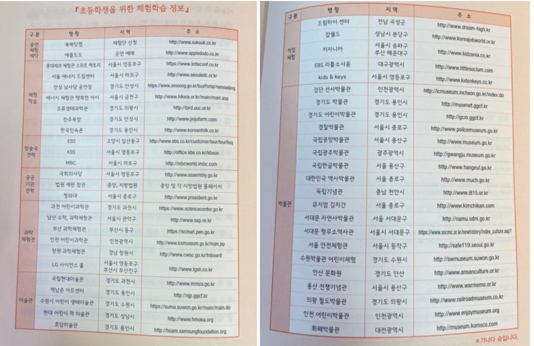 초등 시기에 다양한 직업을 간접적으로 경험하는 것이 좋은데, 흔히 가는 체험관보다는 직접 직업 현장을 방문하는 것을 추천하시더라고요. 선생님도 한 달에 한 번 가정 체험학습을 신청해 주요 방송국, 지방 법원, 국회의사당, 대형병원 등을 열심히 돌아다니셨다고 해요. 아이들이 초등학생이 되면 저도 아래 표를 참고해 부지런히 다니려고 해요.