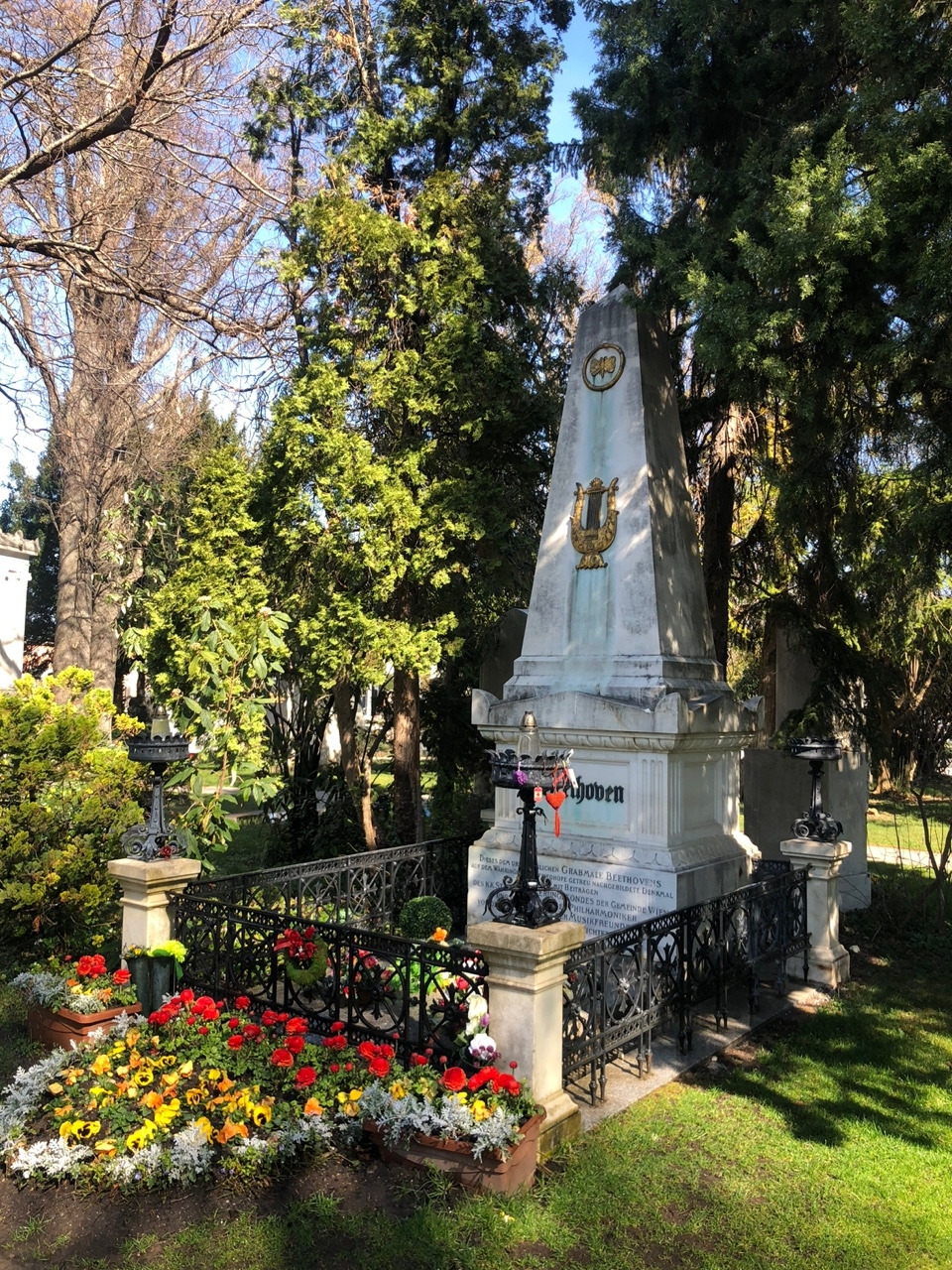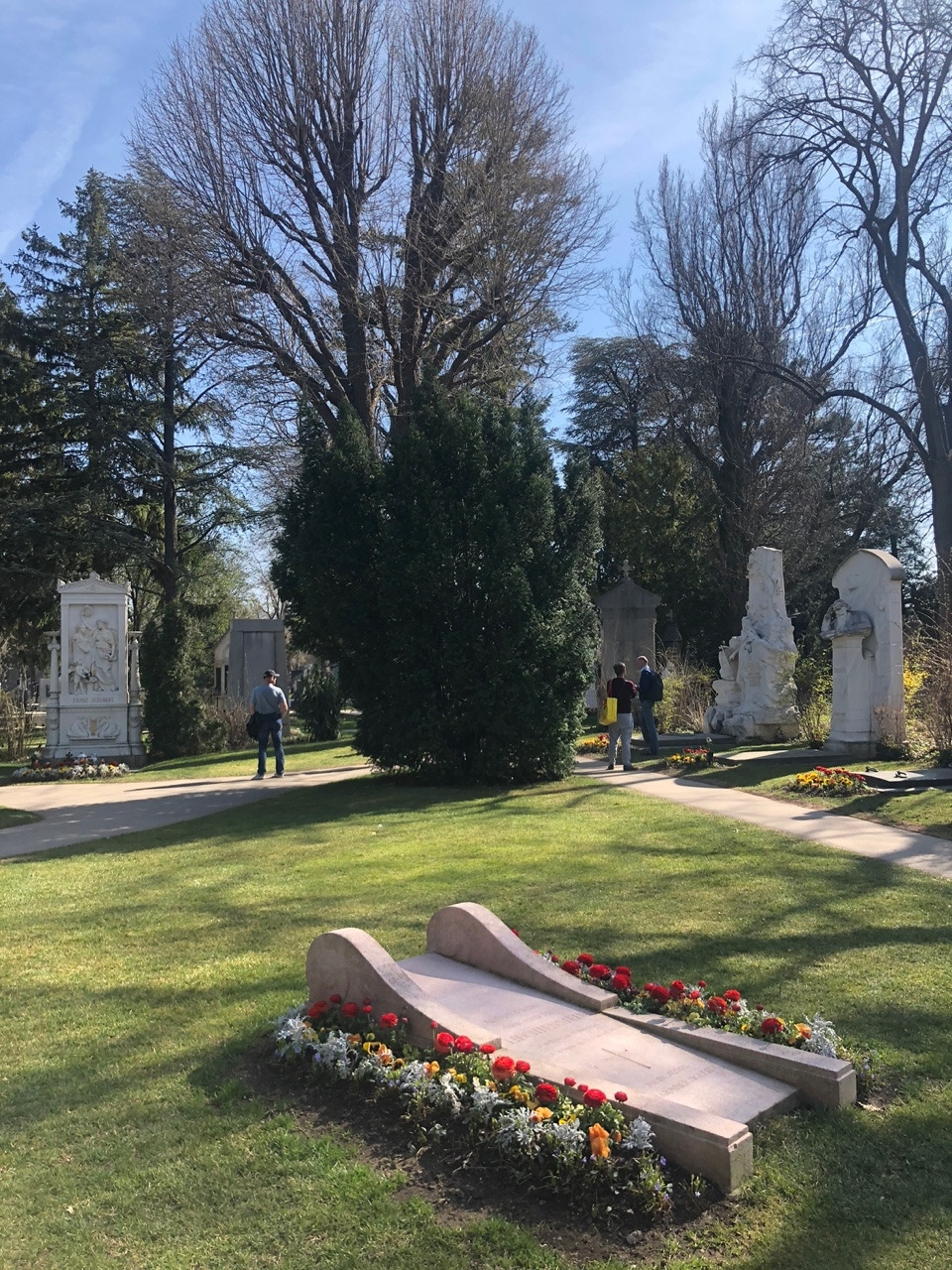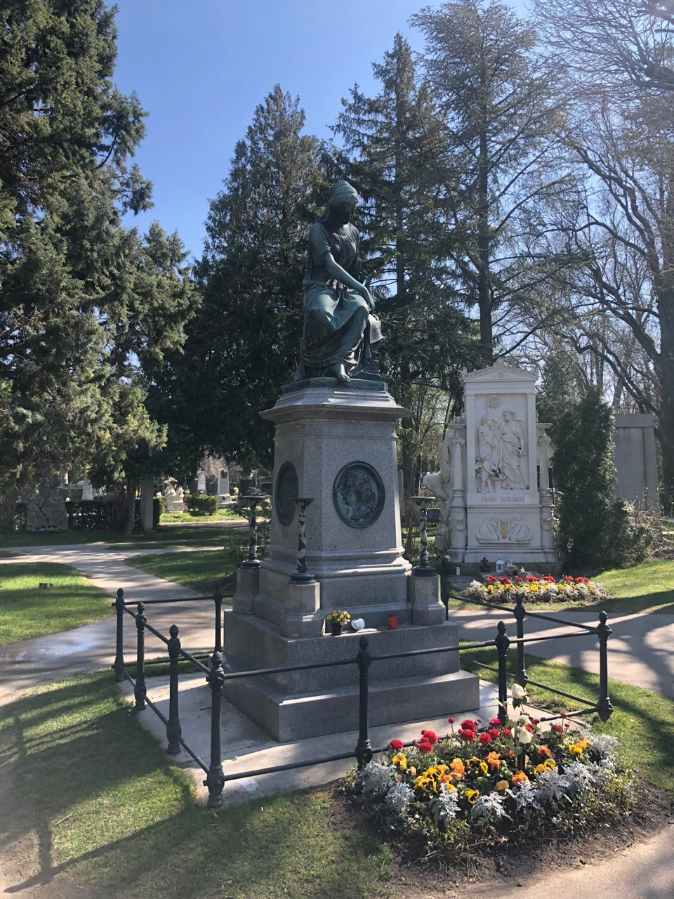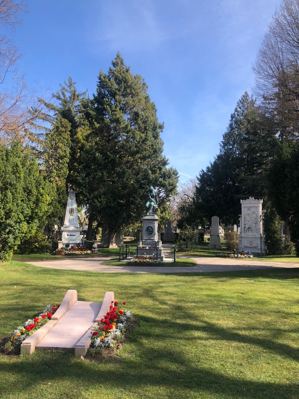 베토벤의 묘에는 황금색 나비와 하프가 인상적이고, 아마 공원 관리인일 테지만 붉은, 노란색의 꽃들이 묘의 엄숙함과 무거움이 아닌 아니라 마치 공원 같은 밝음을 선사한다. 슈베르트의 묘에는 음악의 신 뮤즈가 월계관을 선사하는 조각이 되어 있다. 브람스의 묘가 특이하다. 뭔가 작품을 창조해 내기 위해 고뇌하는 예술가의 혼이 깃든 것 같은 느낌이다. 마지막으로 '아름답고 푸른 도나우강'으로 유명한 요한 슈트라우스 묘에는 예의 그 장난기 한 가득한 얼굴이 새겨진 모습이 눈에 띈다. 요한 슈트라우스의 묘는 시내 슈타트 파크에 있는 금색의 바이올린 켜는 요한 슈트라우스 동상의 얼굴을 떠올리게 한다.