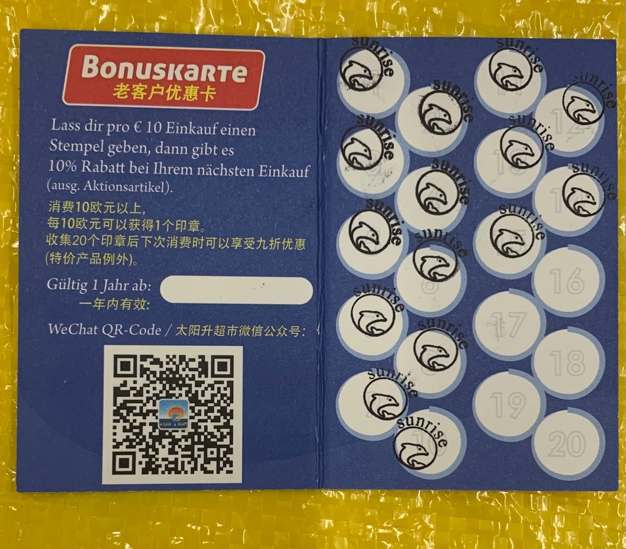 이 가게는 쿠폰 제도를 운영하고 있다. 10유로당 도장 한 개를 찍어주는데 20개를 모으면, 그 다음번 구매(한번)에 대해 10%를 할인해 준다. 그래서 스탬프 20개를 모으면 집에 물건 쟁여두듯이 최대한 많이 사서 할인을 받으면 금전적으로 유리하다.