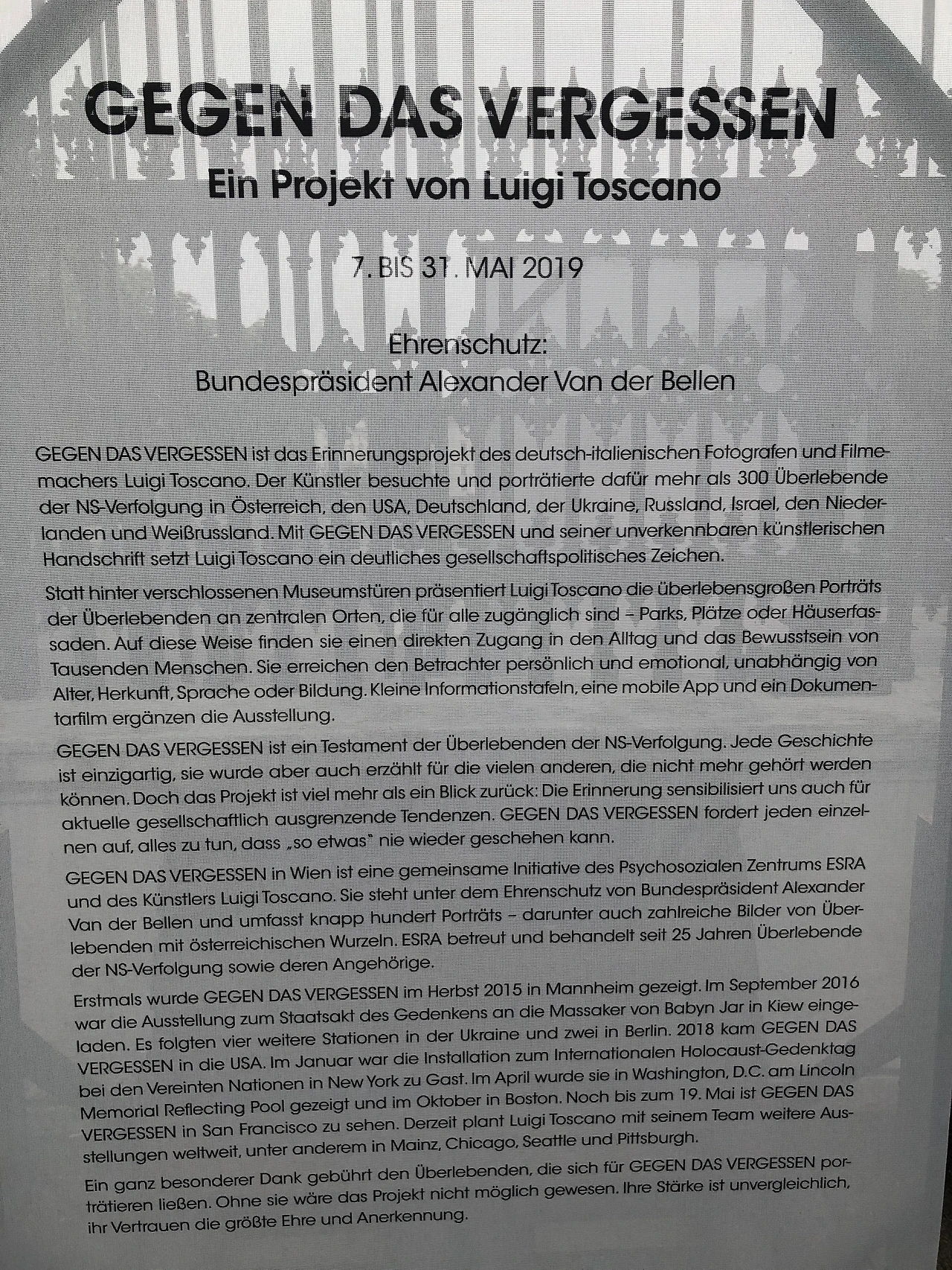 루이지 토스카노라는 사진작가의 기념 프로젝트로, 오스트리아, 미국, 우크라이나, 러시아, 이스라엘, 네덜란드, 벨라루스에서 300명 이상의 나치 박해 생존자들을 직접 만나 찍은 사진들이었다. 그냥 사람이 자연적으로 나이 들어 언젠가는 자연인으로서의 모델들도, 또 그들이 겪어야 했던 나치의 박해도 잊힐 테지만, 작가는 그 잊음을 거부하고 나치의 박해라는 역사적 사실을 늘 기억해야 한다는 메시지를 우리에게 전해주려고 했을 것 같다.