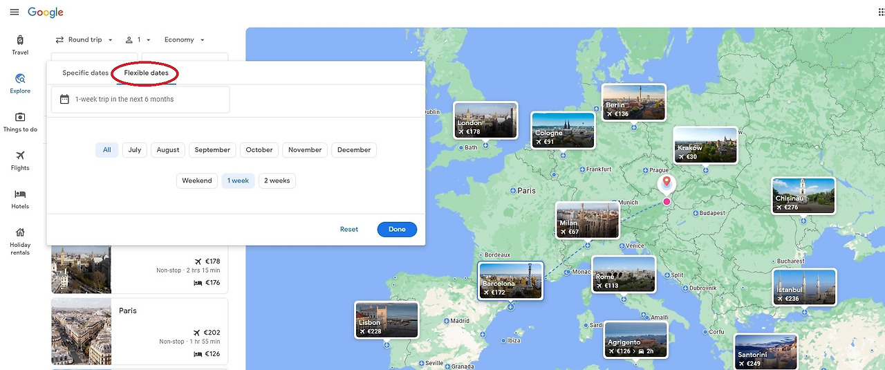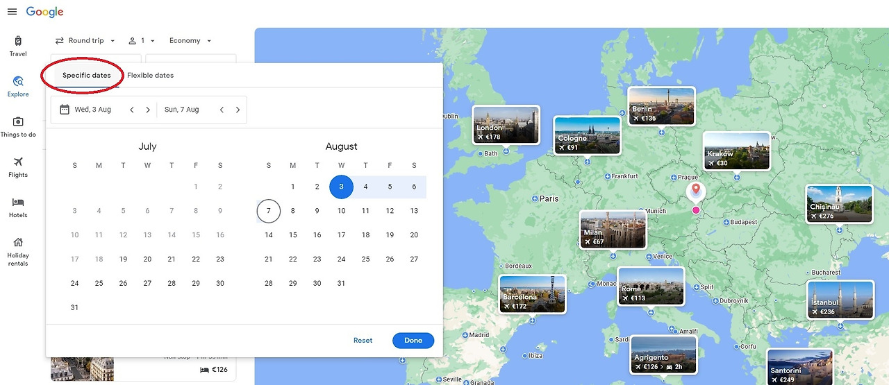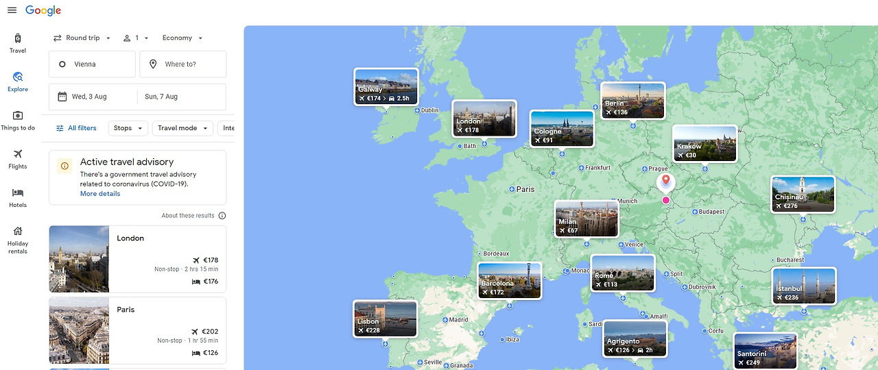 대부분은 구글 flights에서 날짜, 시간, 목적지를 넣고 비행 일정을 검색할 것이다. 그러나 구글 flights나 Skyscanner에서는 Explorer 기능을 제공한다. Explorer 기능은 내가 원하는 날짜와 시간을 넣거나, 아니면 예를 들어 8월 중 한 달 여행 이렇게 조건을 주면 지도에 여행지마다의 요금을 보여준다. 짧게 여행 가는 사람들은 이 기능이 크게 도움이 안 될 수 있지만, 유럽에서 오래 거주하는 사람들에게는 유용한 기능이다. 특히 어딘가 목적지를 정하지 않은 상태에서 여행 갈 짬이 나서 어디론가 가고 싶은 생각이 들 때 큰 도움이 된다.