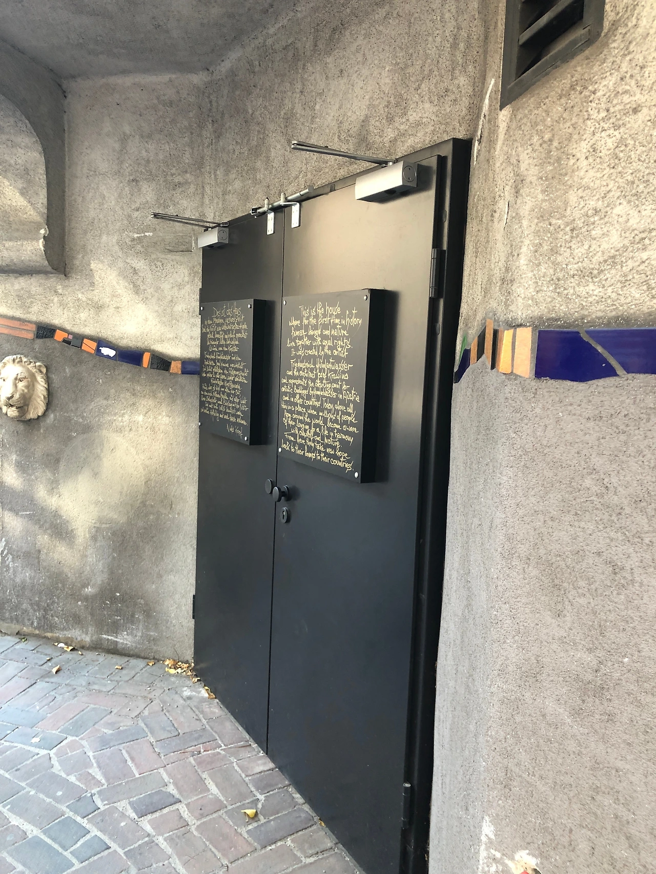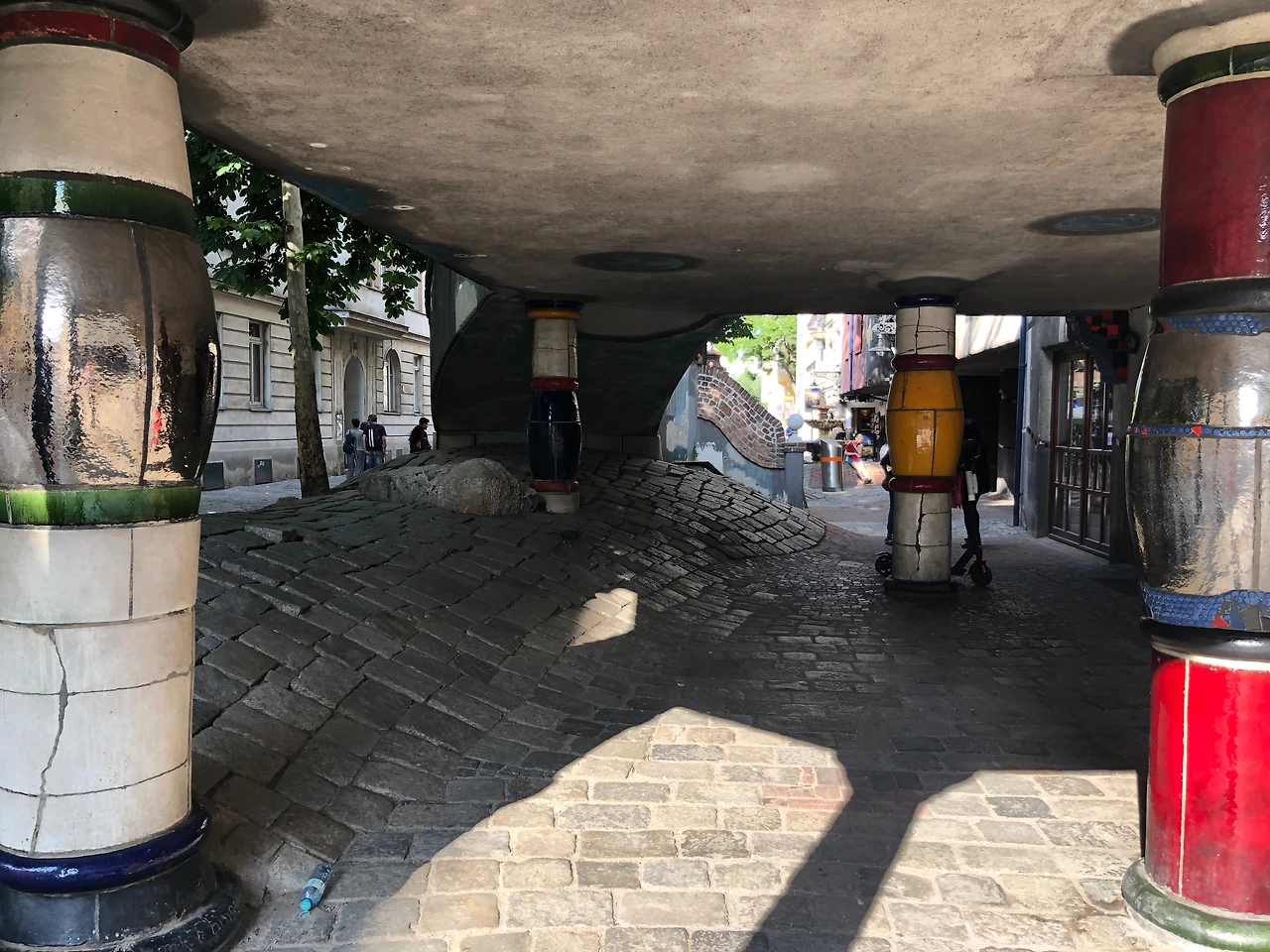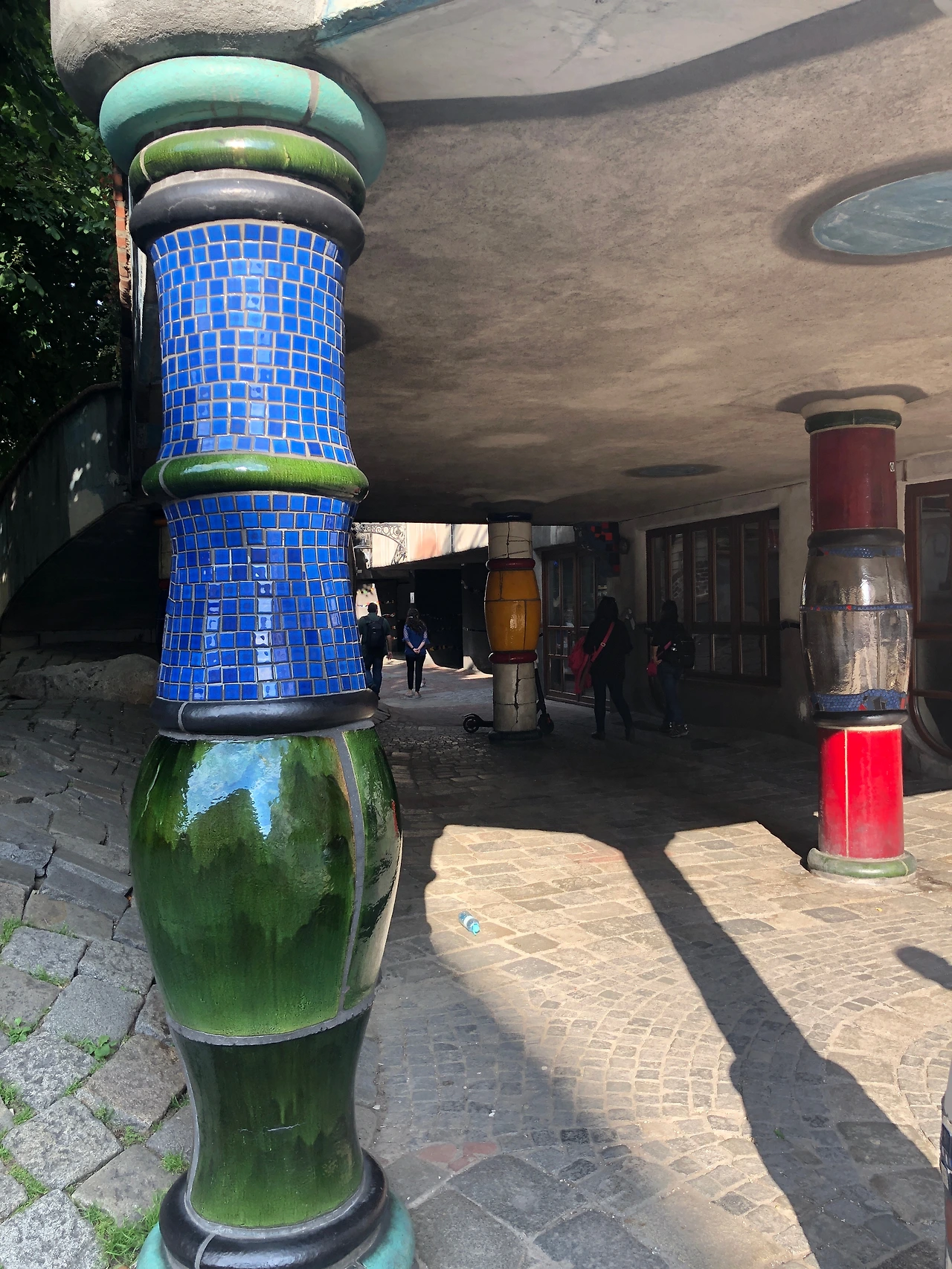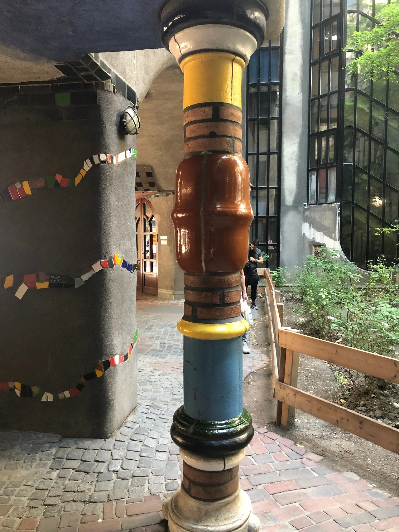 훈데르트 바서 건축물에서 공통적으로 볼 수 있는 디자인이다. 원색의 형형색색 알록달록한 타일을 붙인 기둥. 직선은 찾아보기 어렵다.
