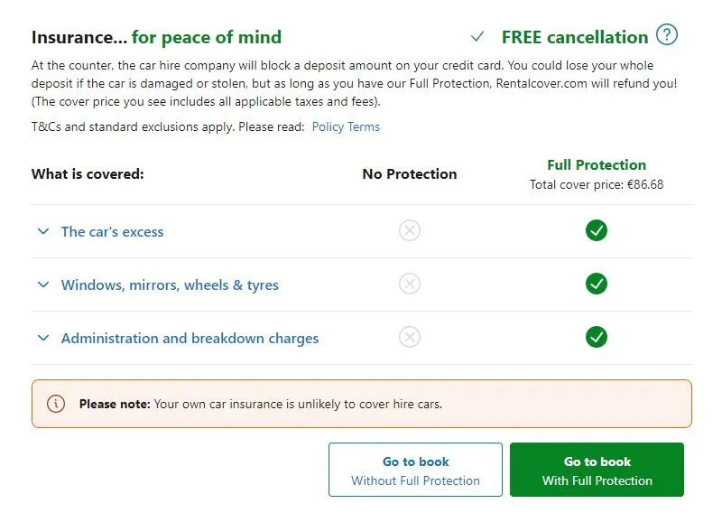 이렇게 여행 예약 사이트에서 제공하는 보험은 보통 알리안츠 같은 제3자 보험사가 중간에 끼어서 저렴하게 별도의 보험을 제공하는 것이다. 그래서 가격이 렌터카 회사에서 직접 보험에 드는 것보다는 상대적으로 비용이 저렴하다. 그러나 한 가지 잊지 말아야 할 점이 있다. 분명 보험은 Full protection으로 돼 있어서 당연히 사고가 나면 자기 부담금 외에는 전적으로 보험사가 보험처리를 해 주는 것으로 생각하는데, 자세하게 어딘가에 적혀 있을 조그만 글씨의 보험 조건을 보면 보험처리 금액 한도가 있는 경우가 많다. 차 사고가 나면 풀 커버리지라 하더라도 예를 들어 3만 유로까지만 커버된다라는 문구가 어딘가에 숨어 있을 수 있다. 대부분은 사고가 잘 나지 않기 때문이 이 부분을 그냥 지나치게 된다.