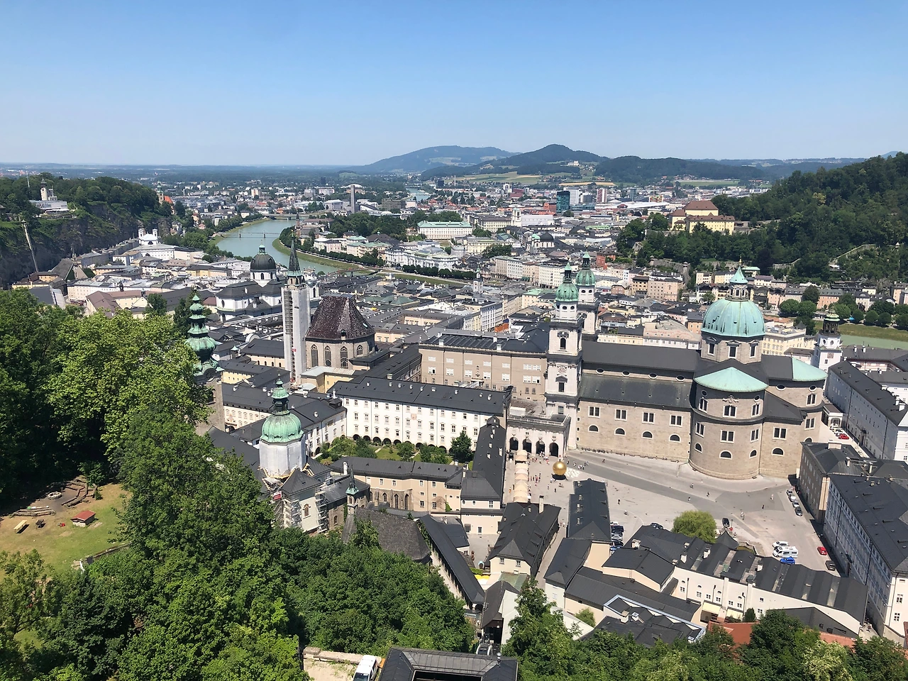 푸니쿨라, 현지어로는 페스퉁스 반(Festungs Bahn)을 타고 올라가서 조금만 걸으면 잘츠부르크 시내가 한눈에 들어온다. 잘자흐강, 모차르트가 세례를 받은 바로크 양식의 잘츠부르크 대성당, 사운드 오브 뮤직에서 폰 트랩 대령 가족이 공연 후 탈출하면서 숨었던 페터 성당 묘지 등이 보인다.