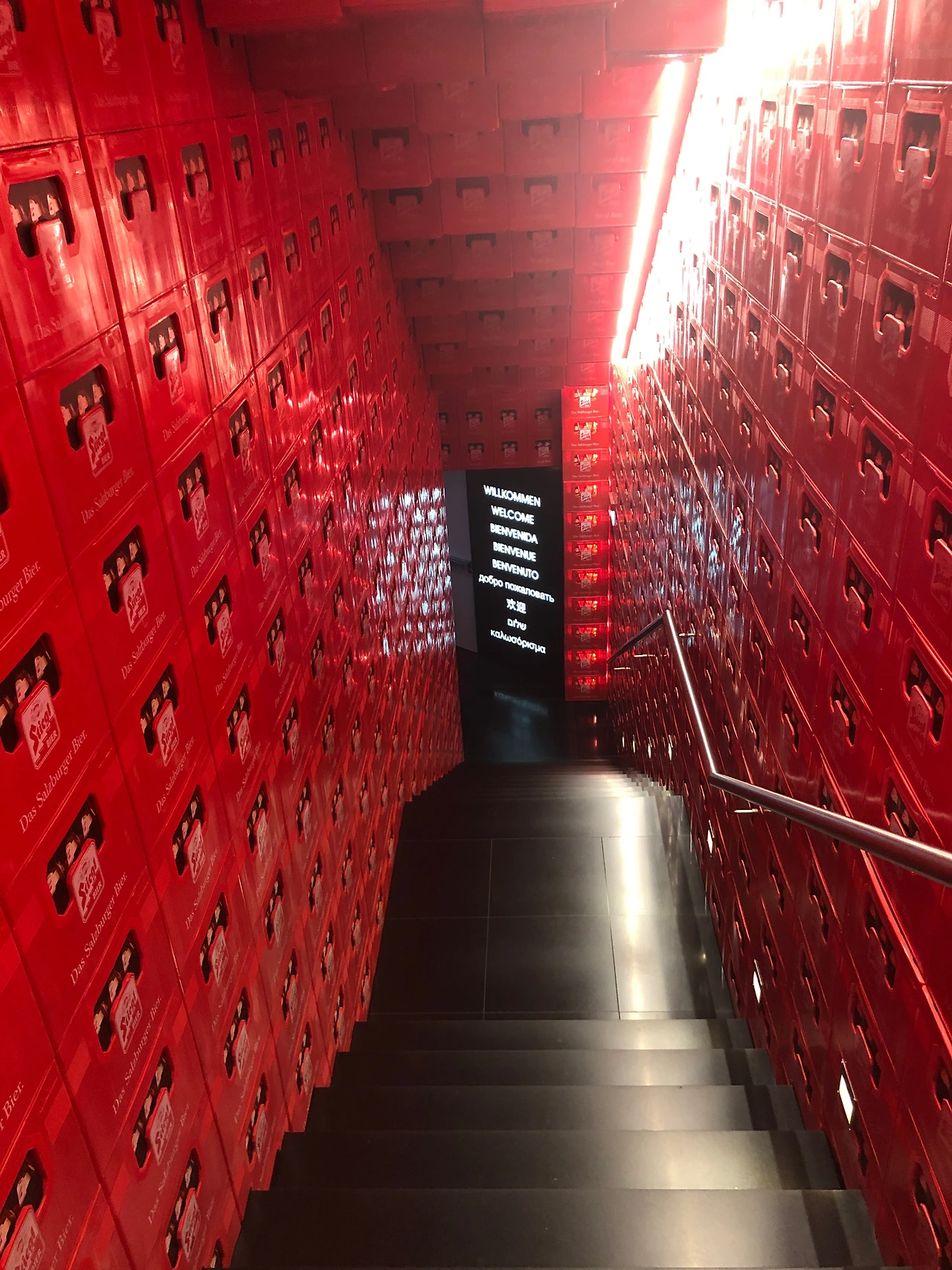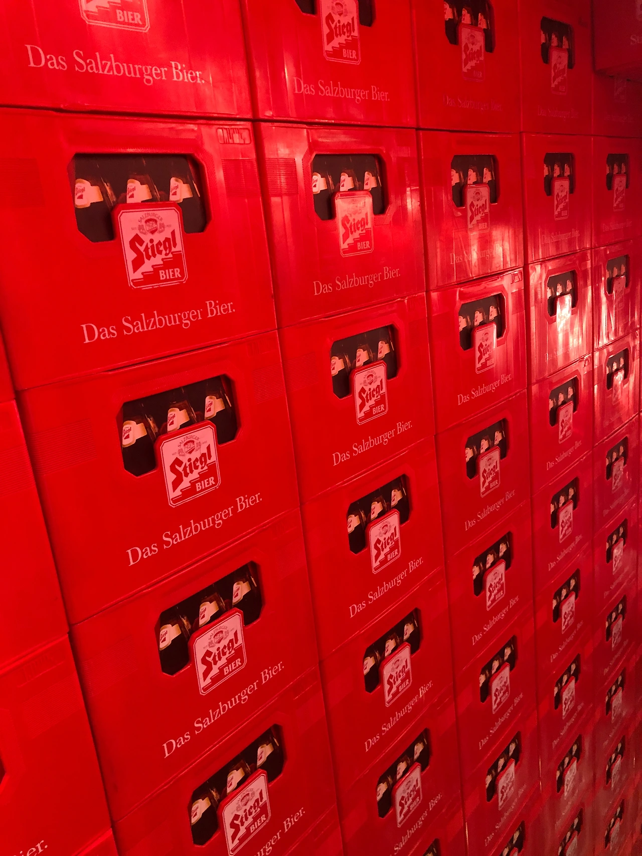 건물 입구에 들어서면 '잘츠부르크 비어 Das Salzburger Bier'라는 문구와 함께 특유의 색인 빨간색이 눈을 현란하게 할 정도의 맥주 박스들이 벽을 이루고 있다. 이때까지만 해도 기대감이 컸다.