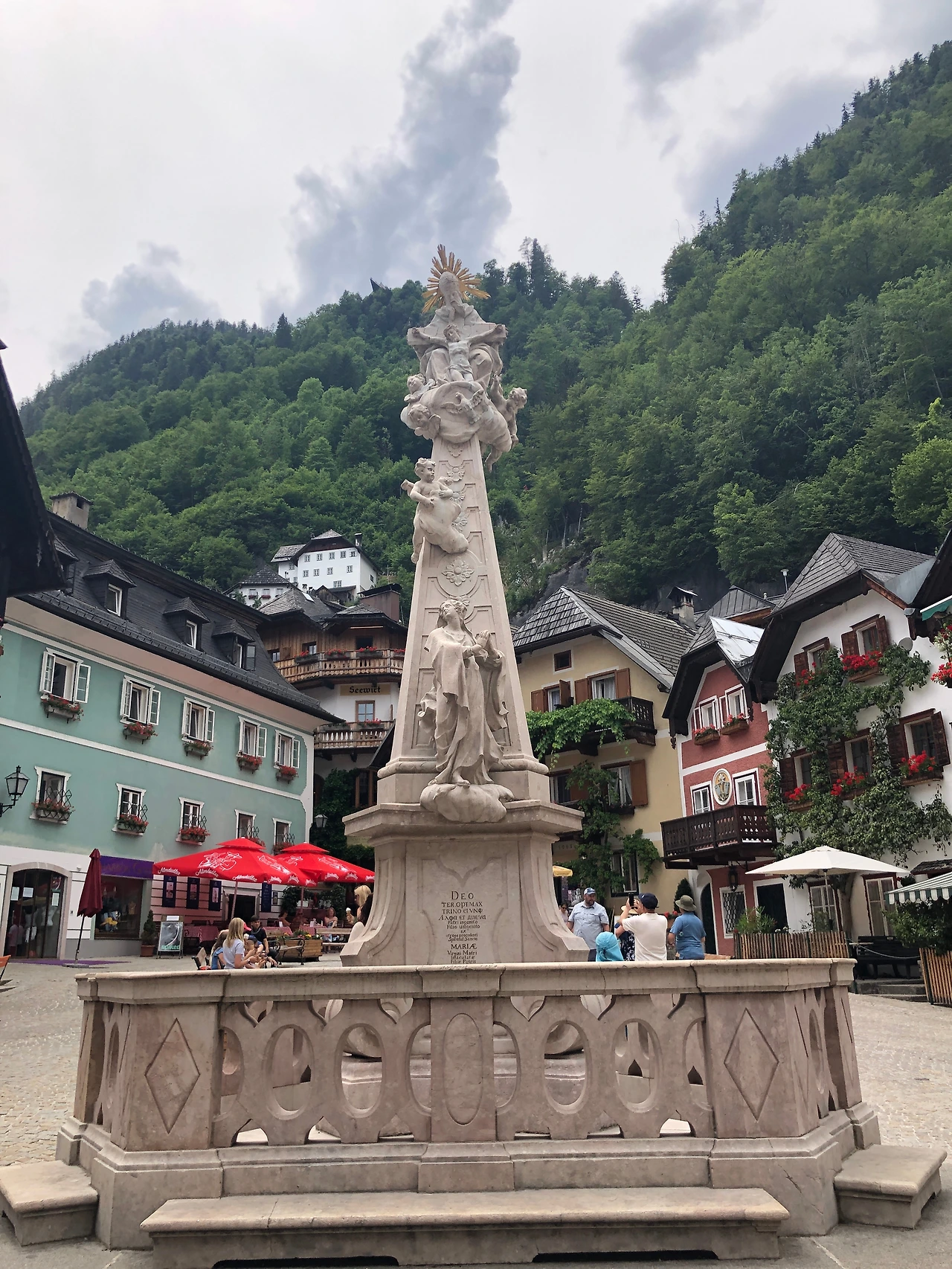 마르크크 광장이라고 불리는 할슈타트 마을 중앙광장에는 기념탑이 하나 있다. 마치 비엔나 그라벤 거리에 있는 삼위일체탑과 비슷하게 생겼다. 유럽 어느 도시를 가더라도 볼 수 있는 삼위일체탑은 보통은 중세 시대 페스트를 종식시킨 것을 기념하는 탑으로서의 의미를 지내고 있는데,