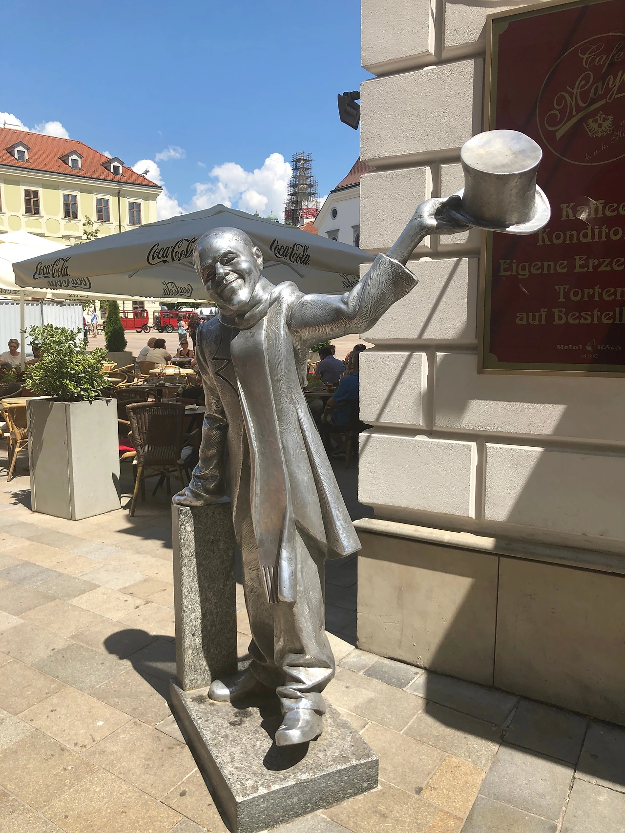19~20세기에 브라티슬라바에 실존했던 인물의 동상이라고 한다. 원래 이름은 이그나즈 라마르(Ignaz Lamar)인데, 광장에서 웃으면서 사람들에게 인사하며 꽃을 나눠줬다고 한다. 그런데 웃는 얼굴에 보이는 슬픔에는 이유가 있다고 한다. 결혼 당일날 신부가 멀리 떠나버렸고, 그 돌아오지 않는 신부를 기다리고 있기 때문이라고 한다. 그 얘기를 들으니 저 웃음이 웃음처럼 느껴지지 않고 더 큰 슬픔처럼 보이는 것은 왜 일까.
