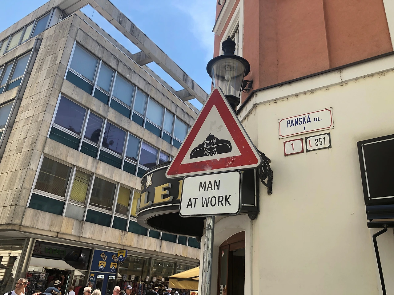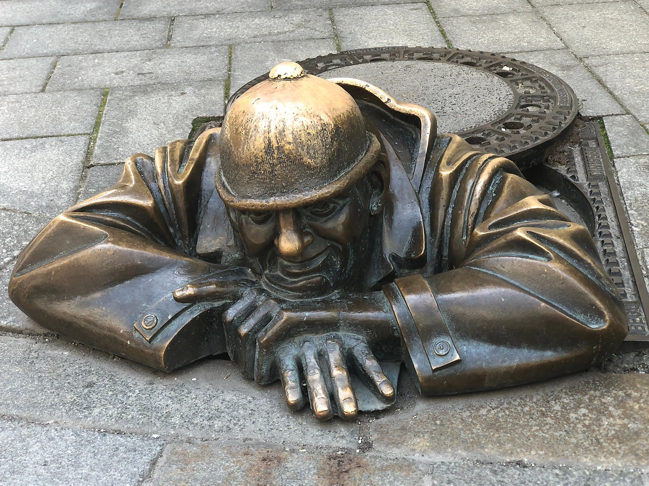추밀이라는 이름의 동상. 브라티슬라바에서 가장 유명세를 타고 있는 동상이다. 뒤에 서 있는 입간판에는 Man at Work라고 적혀 있다. 맨홀 뚜껑을 열고 그 아래에서 작업하다 잠시 신선한 공기도 쐴 겸 팔을 지지하고 턱을 괴며 쉬고 있는 모습이 마치 좀 전에 작업하다 올라와서 숨을 고르고 있는 느낌을 준다.