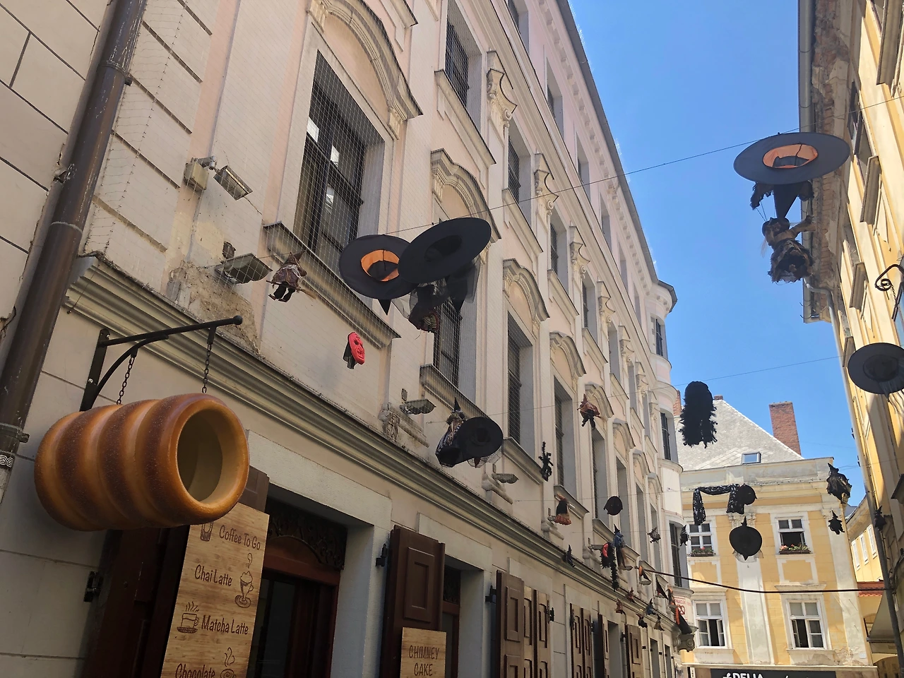 약의 무게를 달던 저울, 고대 그리스신화에서 병을 치료하는 능력이 있던 것으로 믿어졌던 뱀. 그리고 녹십자. 영락없는 약국이다. 그리고는 시내 여기저기를 들러본다. 체코에서 많이 봤던 굴뚝빵, 뚜르들로 가게도 보인다. 그 옆에 마법사 보자를 줄줄이 늘어놓은 것은 어떤 연유일까 궁금해 하면서 걷는다.