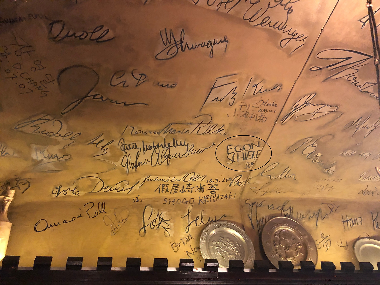 마크 트웨인룸의 네 벽면과 천장에는 서명으로 가득하다. 그런데 네 벽면 중 한 면은 투명 아크릴 판으로 보호하고 있다. 그 네 벽면과 천장에서 우리가 아는 사람들의 서명을 찾아보는 것이 이 식당이 주는 묘미의 하나이다. 모차르트의 서명이 보인다. 그 왼쪽으로는 베토벤의 B자가 흡사 버섯 모양으로 시작하는 베토벤의 서명이 있다. 가운데 위에는 Suppe라는 유명한 지휘가의 서명도 있다. 또 다른 벽면에는 미국의 정치평론가 마크 트웨인도 있고, 에곤 쉴레, 마가렛 대처, 줄리아노 파바로티도 있다. 그런데 유독 한글로 된 이름도 둘 보인다. 하나는 그 옛날 국회의원이었던 장영달 의원, 그리고 김진태라는 이름이다. 김진태는 누구인지 확인은 되지 않는데, 지금 강원도지사일까?