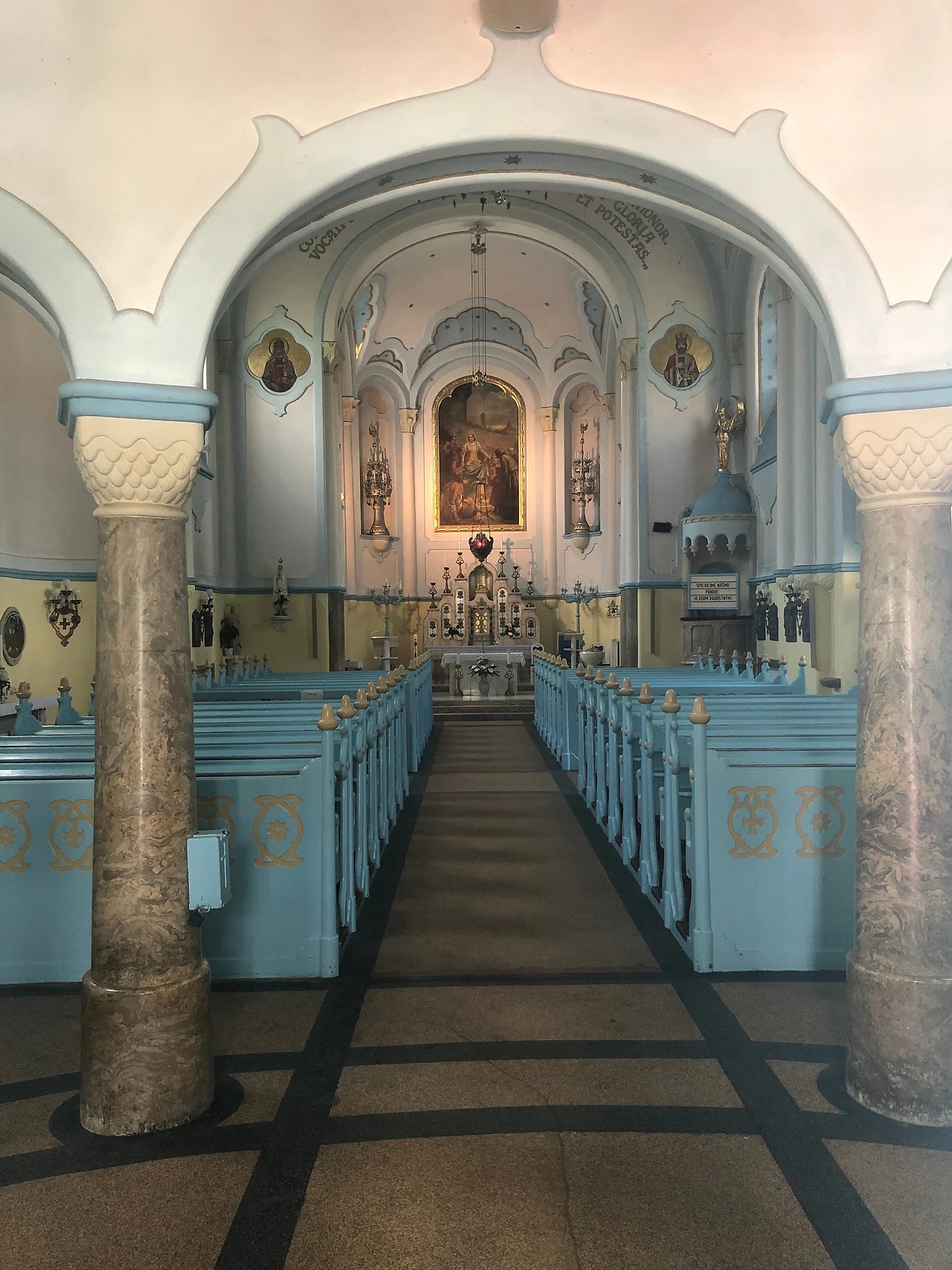 내부로는 들어갈 수가 없지만, 문 창살 틈으로 보면 미사보는 의자도 벽면도 모두 하늘색으로 '깔맞춤'한 것을 볼 수 있다.