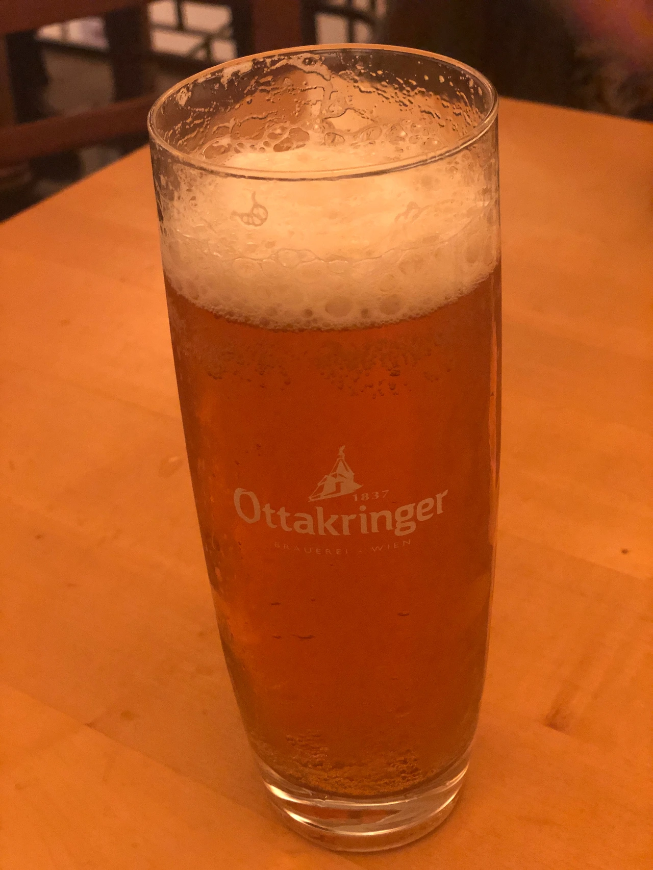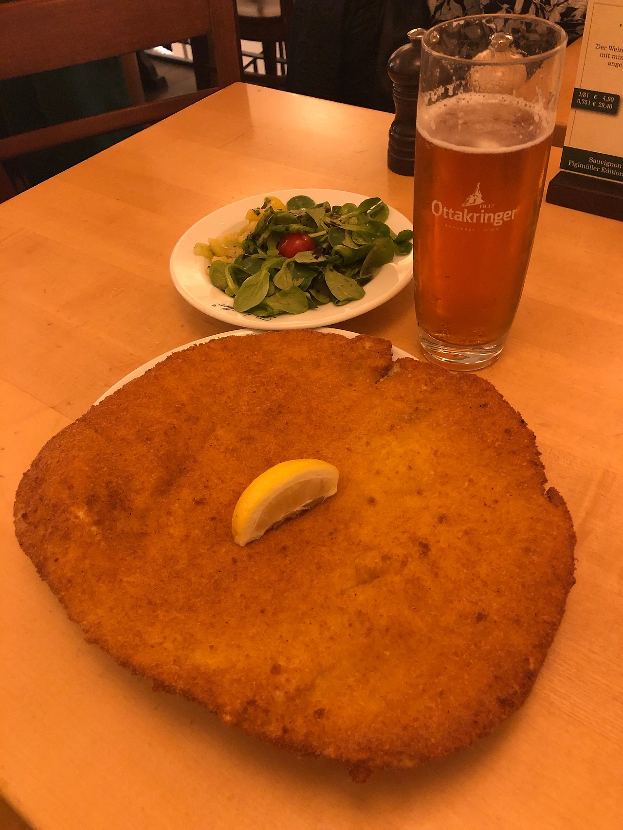 슈니첼 맛집이라 다른 메뉴에는 눈길을 주지 않고 슈니첼만 주문했다. 슈니첼 전문점답게 이 집의 추천 메뉴(house specialty)는 슈니첼이었고, 슈니첼과 함께 스타리아 지방의 호박씨 오일을 곁들인 감자 샐러드를 추천한다 해서 같이 주문하고는 그래도 로컬 맥주는 한잔 해야지 싶어 오타크링어(Ottaklinger) 생맥주 한잔을 주문했다. 잠시 후에 슈니첼이 나온 것을 보고는 '이게 머선 일이고?' 싶었다. 슈니첼의 크기가 얼마나 큰지 아래에 있는 접시가 감당을 못할 정도였다. 커도 너무 크다. '과연 혼자 이걸 다 먹을 수 있을까?' 하는 생각을 맨 먼저 들게 만들 정도의 압도적인 크기다. 시원한 오타크링어 맥주와 슈니첼, 그리고 간간히 감자 샐러드를 먹으면서 슈니첼을 즐겼다. 느낌은 슈니첼은 슈니첼일 뿐이라는 생각이었다. 그냥 크기가 클 뿐 무언가 감동적인 맛이나 흥미로운 스토리텔링을 주는 식당은 아니란 생각이 들었다.