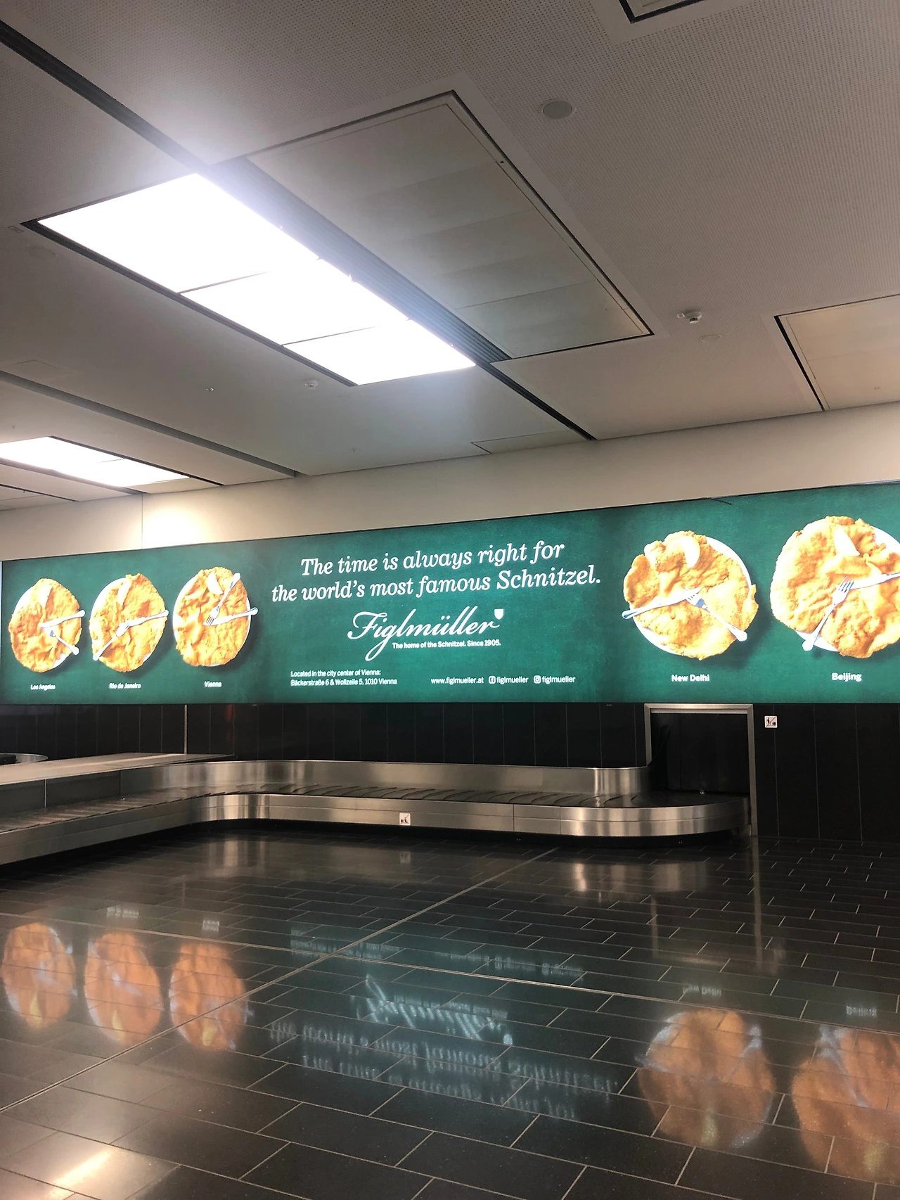 비엔나 공항에 도착한 후에 짐을 찾는 baggage claim에서 화물로 부친 짐이 나오는 컨베이어 벨트 뒤로 피글 밀러 광고판이 눈에 띈다. 1905년부터 영업한 슈니첼의 집(home of the Schunitzel seit 1905)이다.