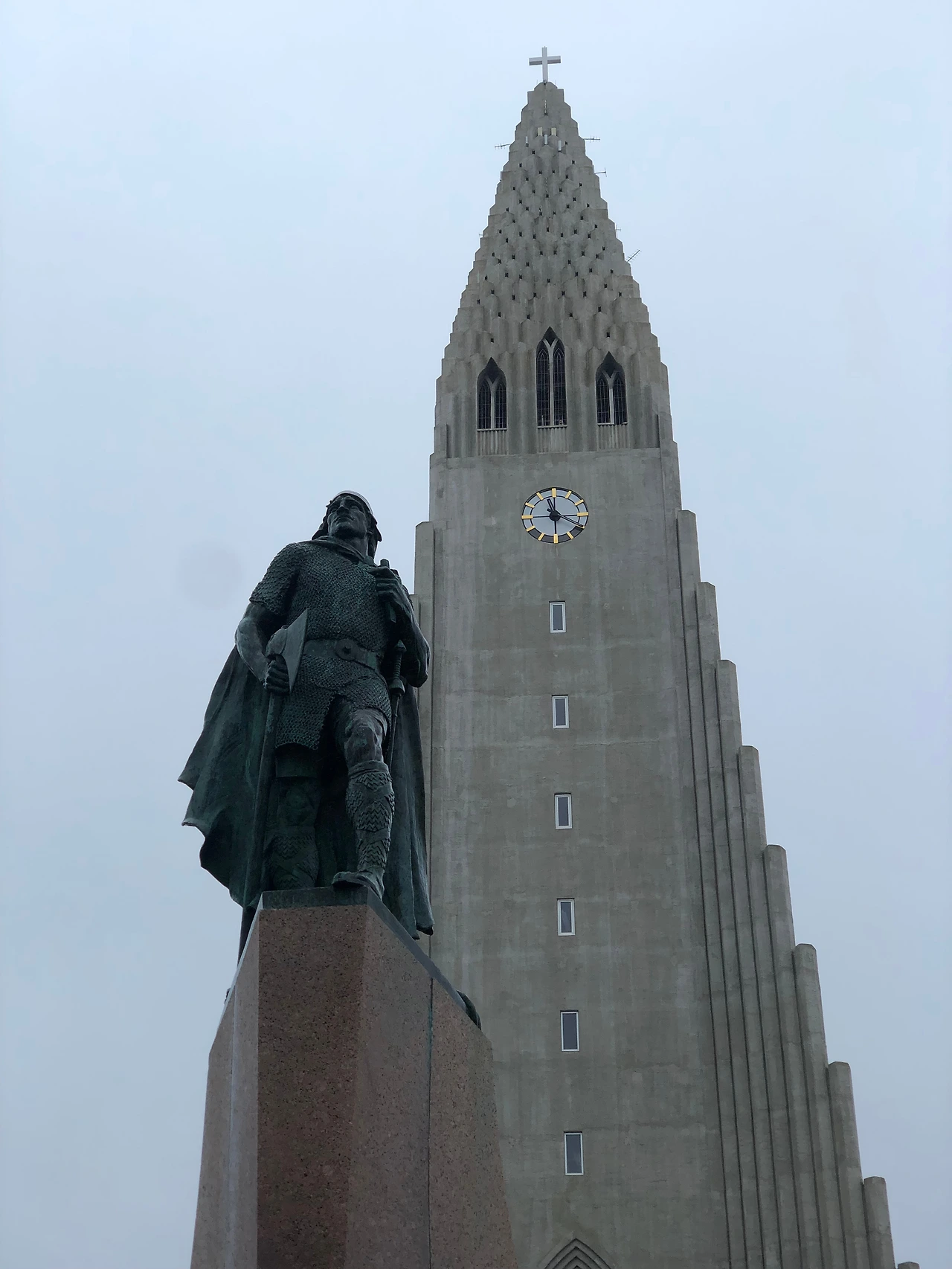 교회 앞에는 레이프 에이릭손의 동상이 서 있다. 우리는 대부분 세계사 책에서 북아메리카 대륙으로 처음 탐험하고 발견한 것이 콜럼버스라고 알고 있지만, 실제로는 바이킹 시대였던 1000년 경 북아메리카 대륙을 최초로 발견한 유럽인 탐험가이다. 오른쪽에는 긴 도끼를, 왼손에는 칼을 차고 먼 미지의 땅으로 지금이라고 출발하려는 모습이다. 에이릭손은 탐험 정신에 경의를 표한다.