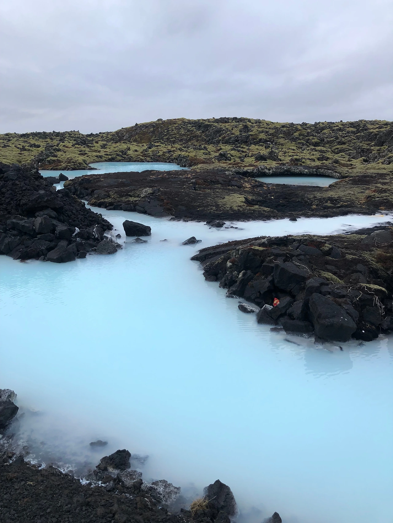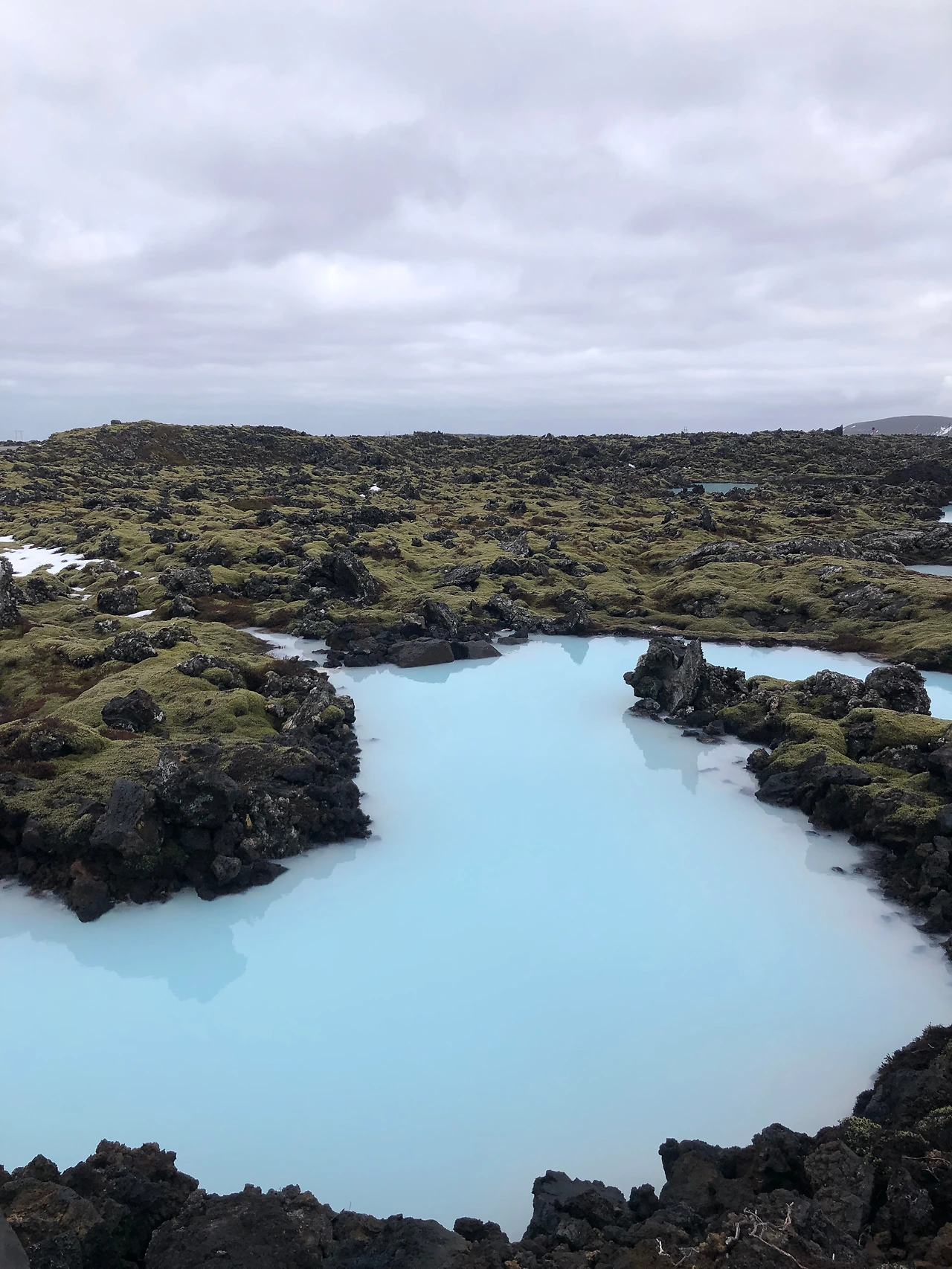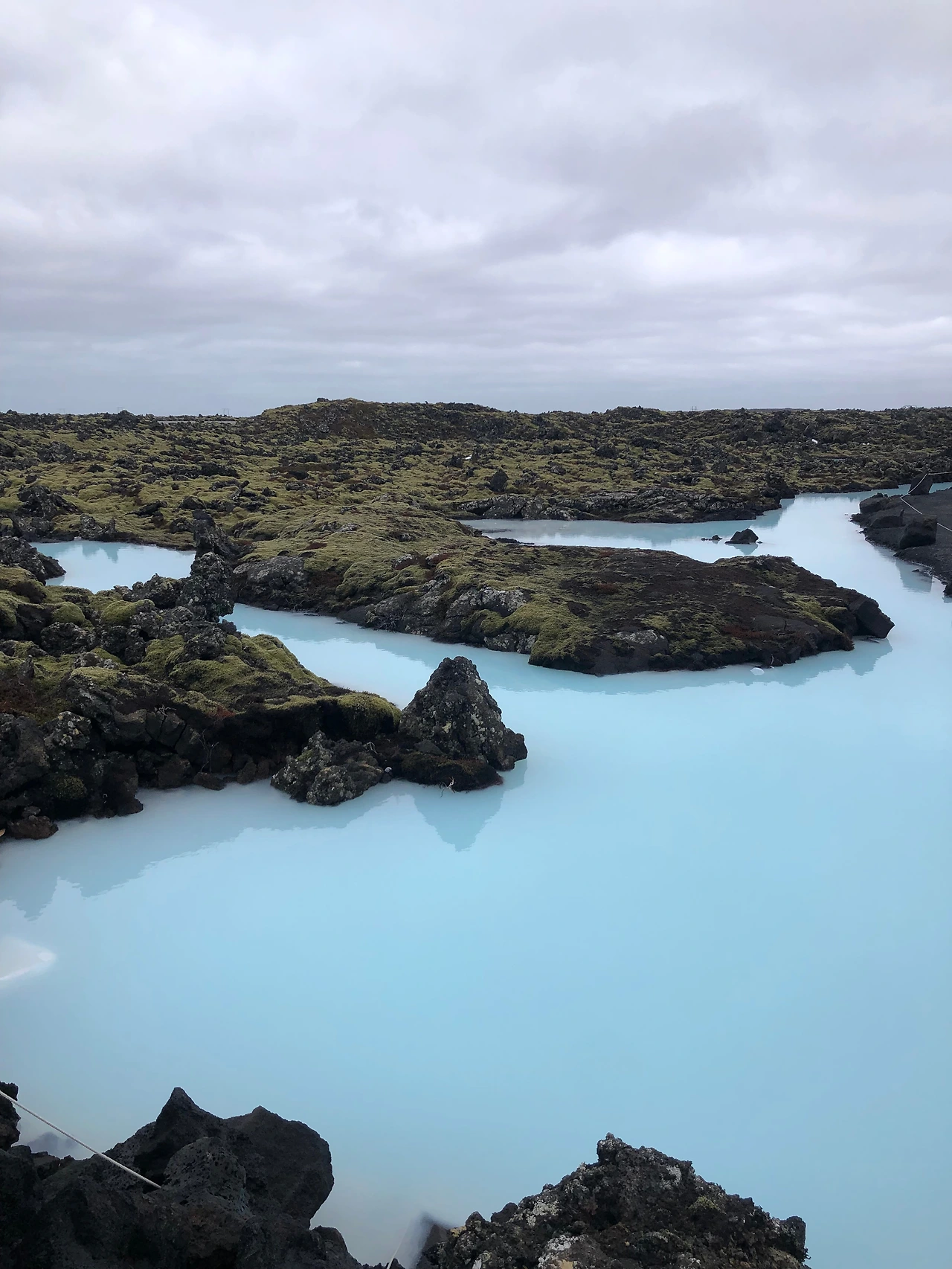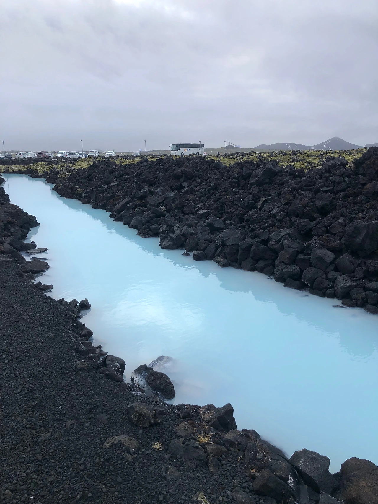 블루라군 주차장에서 정문까지 가려면 이끼 덮인 바위 길 사이를 지나가야 한다. 그 길 옆에는 온천 밖에 있는 물을 볼 수 있다. 그 물 색깔은 바닷물에 우유를 타 놓은 듯 연한 파스텔톤 하늘색인데, 이 세상의 색이 아닌 듯싶다. 온천 후 돌아 나오면서 봐도 되지만 잠깐 길을 벗어나 파스텔톤의 물빛을 보면 온천에 대한 기대감이 더욱더 커진다.