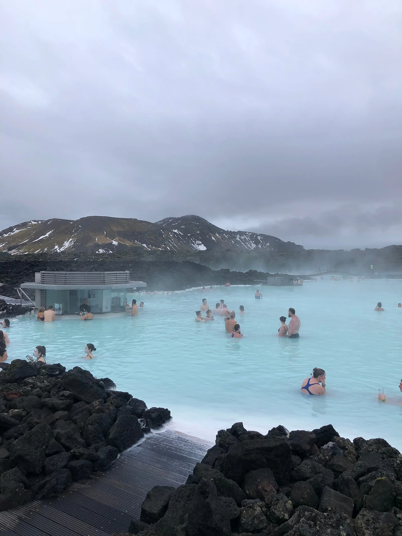 블루라군의 전경은 굳이 설명이 필요 없을 것 같다. 유럽에서의 온천은 대부분 물이 35도 내외로 미지근한 물이라 그 안에서 몇 시간을 있어도 큰 부담이 없다. 그냥 따뜻한 수영장의 느낌이다. 블루라군도 대부분의 스팟은 그렇지만, 입구에서 멀리 떨어진 오른쪽 지역은 우리나라 온천처럼 뜨끈뜨끈해서 소위 몸을 지질 수 있다. 그러나 뜨거워서 그런지 오래 있기는 힘들다.