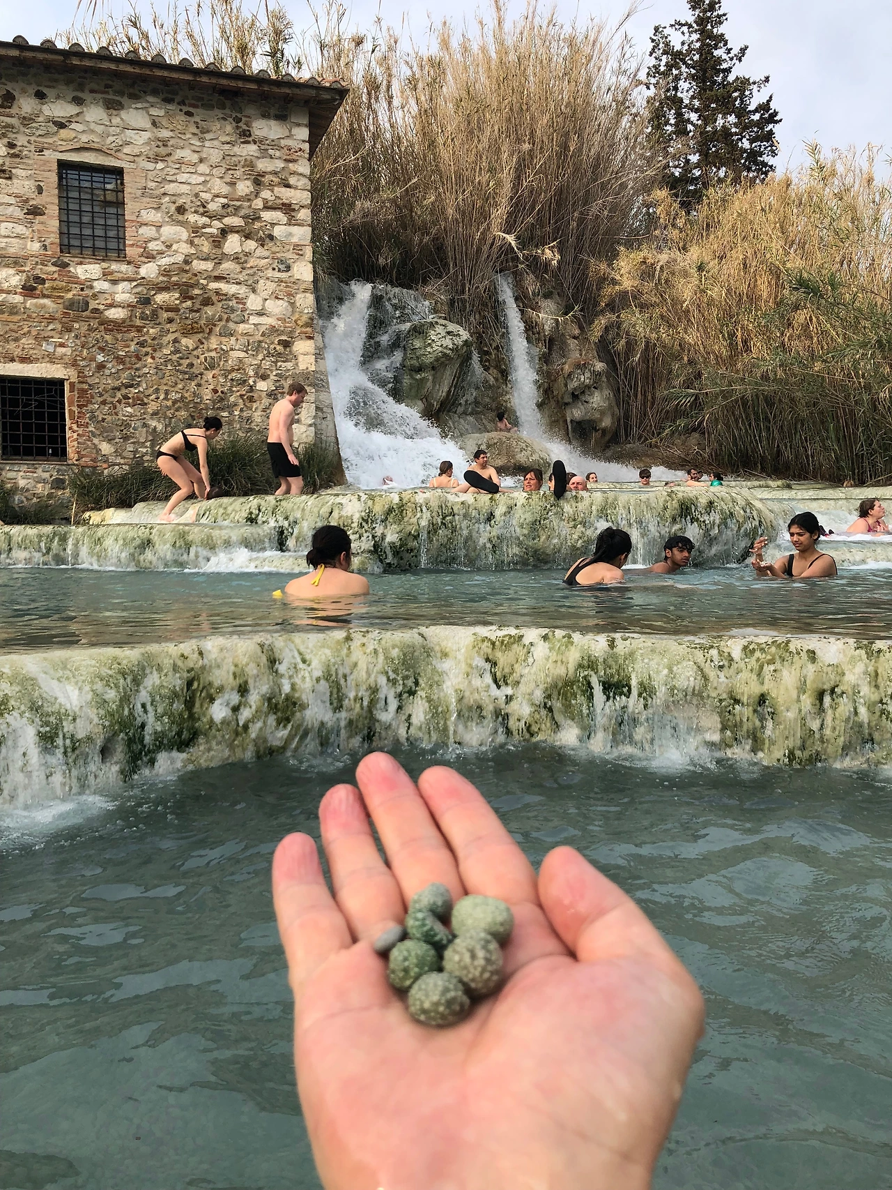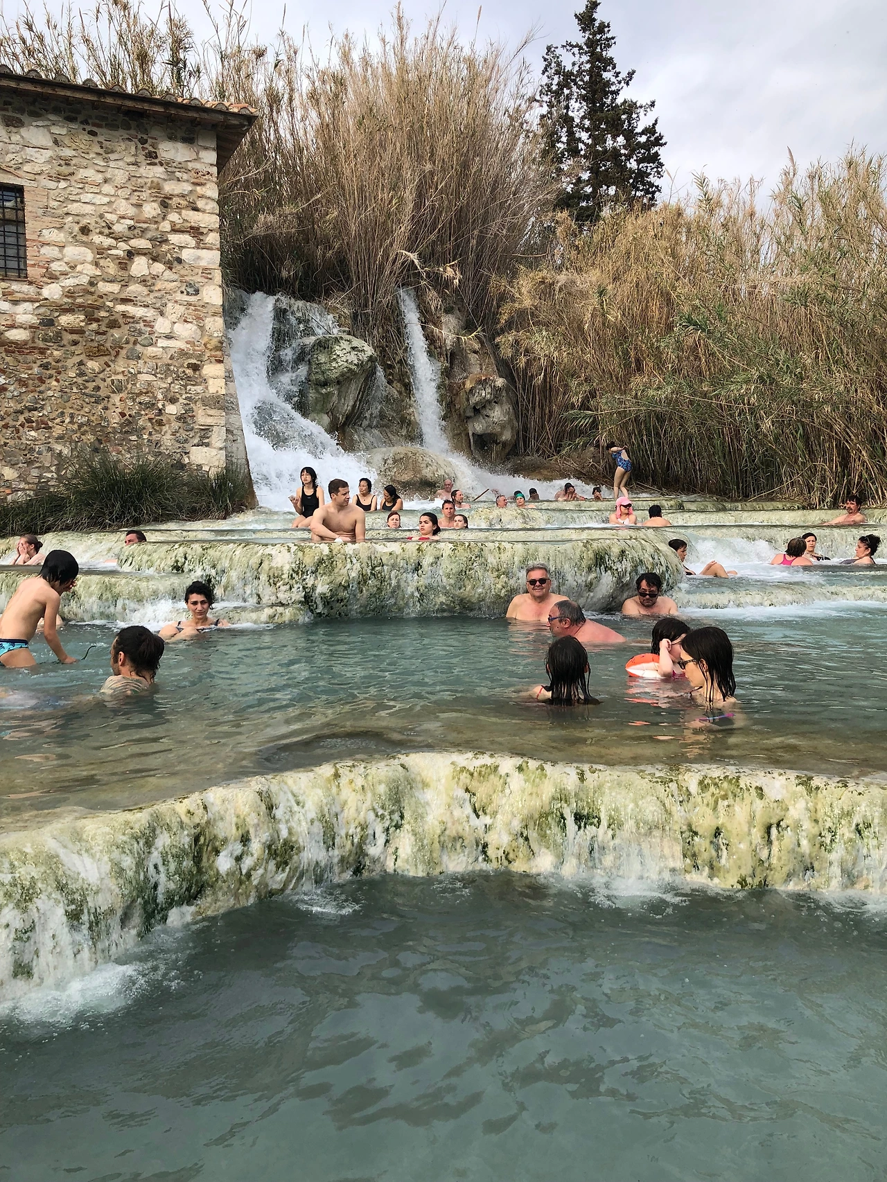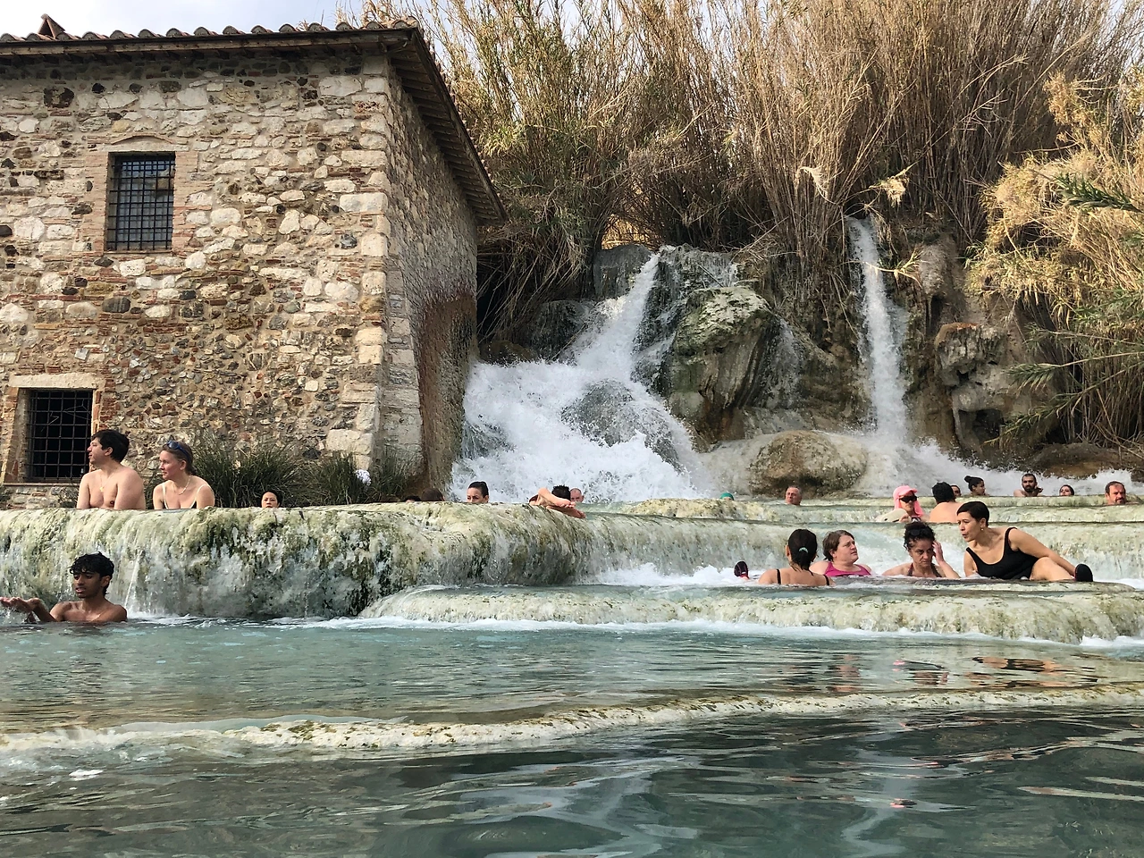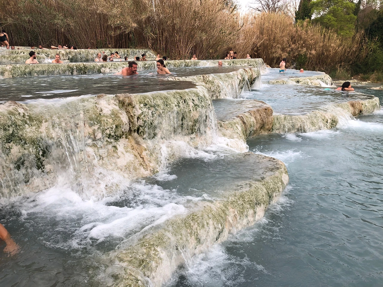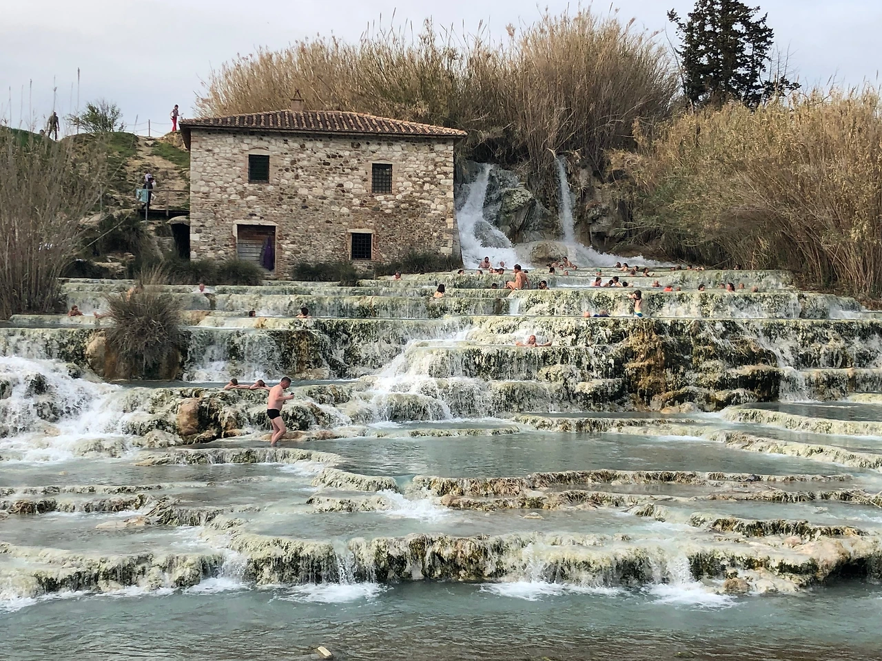 온천물은 석회수가 섞여 있어서 그런지 온천을 만드는 벽들이 미끌미끌했다. 그리고 물 자체도 아주 맑은데 유황 냄새가 코를 자극한다. 전체 풍광을 보면 알겠지만 오랜 시간에 걸쳐 계단형 온천들이 만들어져 있다. 굳이 옛날에 그랜드 캐년을 보면서 대자연의 조각 실력에 감탄하던 기억을 떠올리지 않더라도 이 사투르니아 온천만 봐도 저 건물 뒤에서 폭포처럼 떨어지는 물줄기가 어떻게 경사와 계단을 만들고 그 사이사이를 유황 물로 채우면서 온천을 만들었을까 하는 감탄을 자아내게 된다.