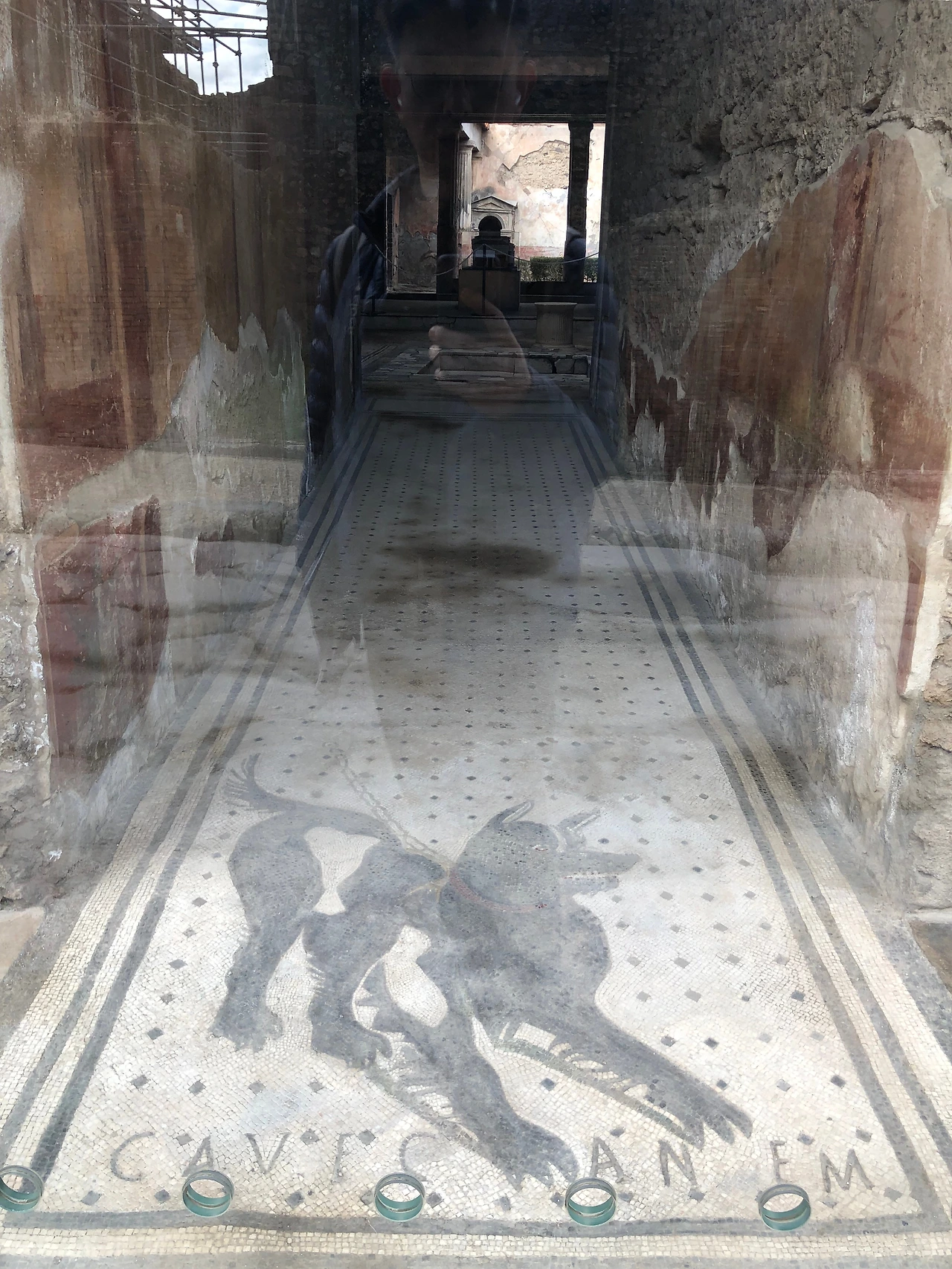 어릴 때 개를 키우던 집은 대문 앞에 '개조심'이라고 써 뒀던 기억이 있는데, 당시 폼페이에서도 그런 게 있었다고 하니 놀랍다. 누군가의 집 입구인데, 개가 그려져 있어 무엇일까 했더니 개조심 문구란다.