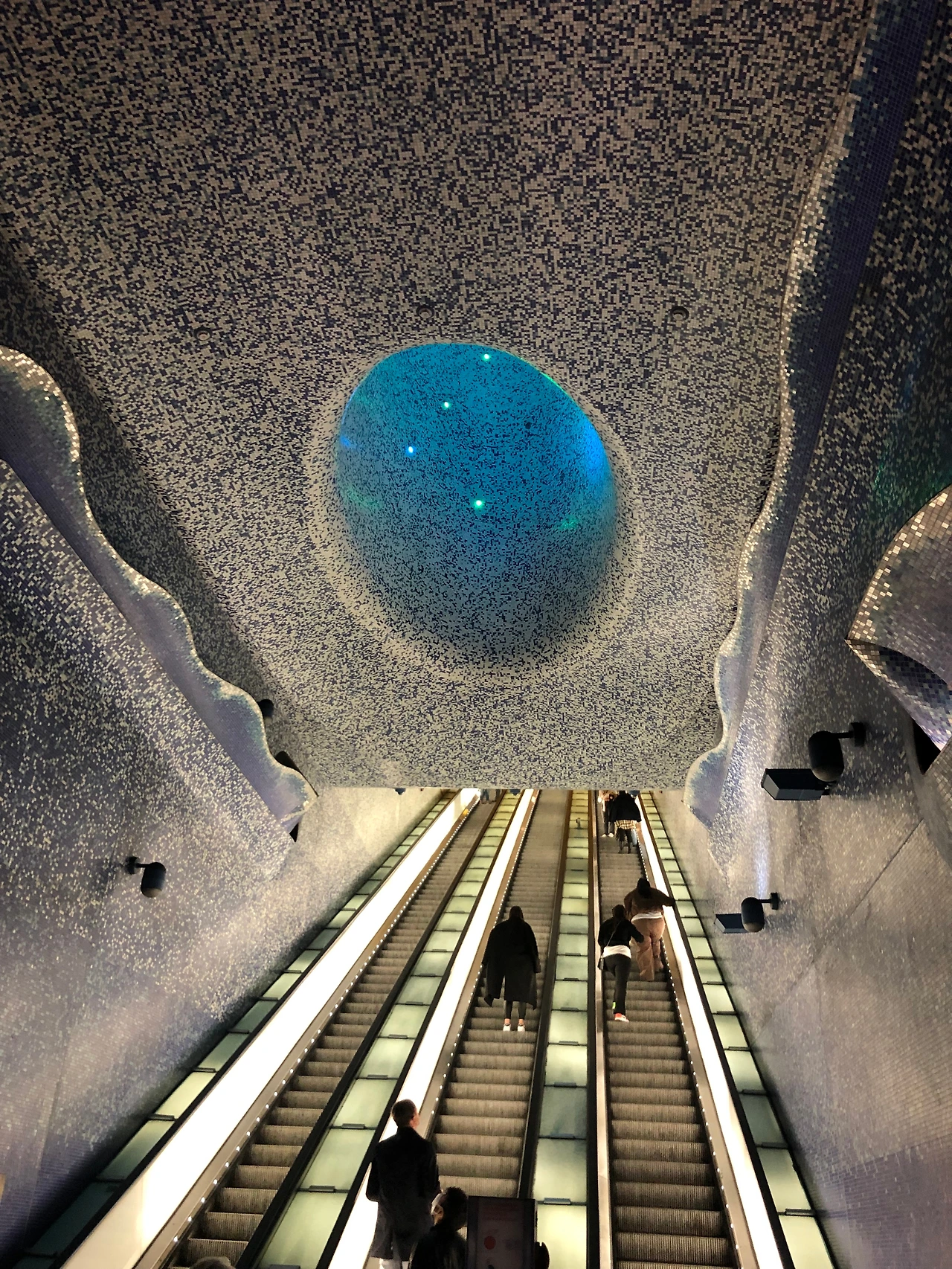 그 느낌을 오래 기억하려고 에스컬레이터로 오르락내리락하며 동영상도 담아본다. 이 역은 '빛과 물'이라는 주제로 2012년에 스페인의 건축회사가 디자인했다고 한다.