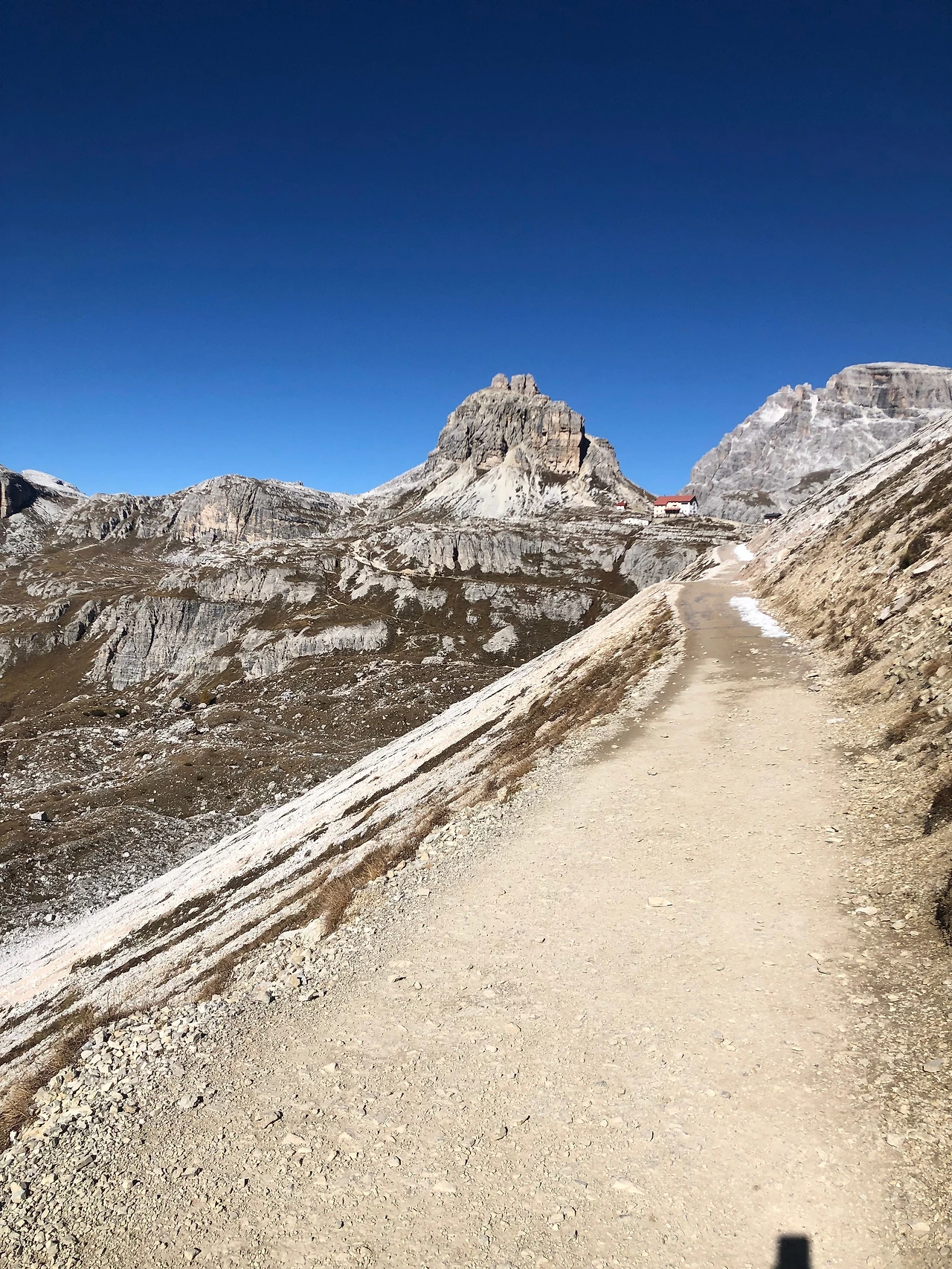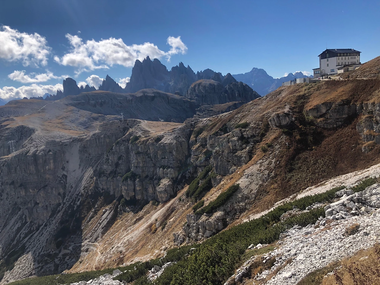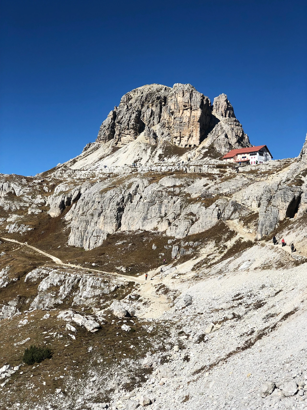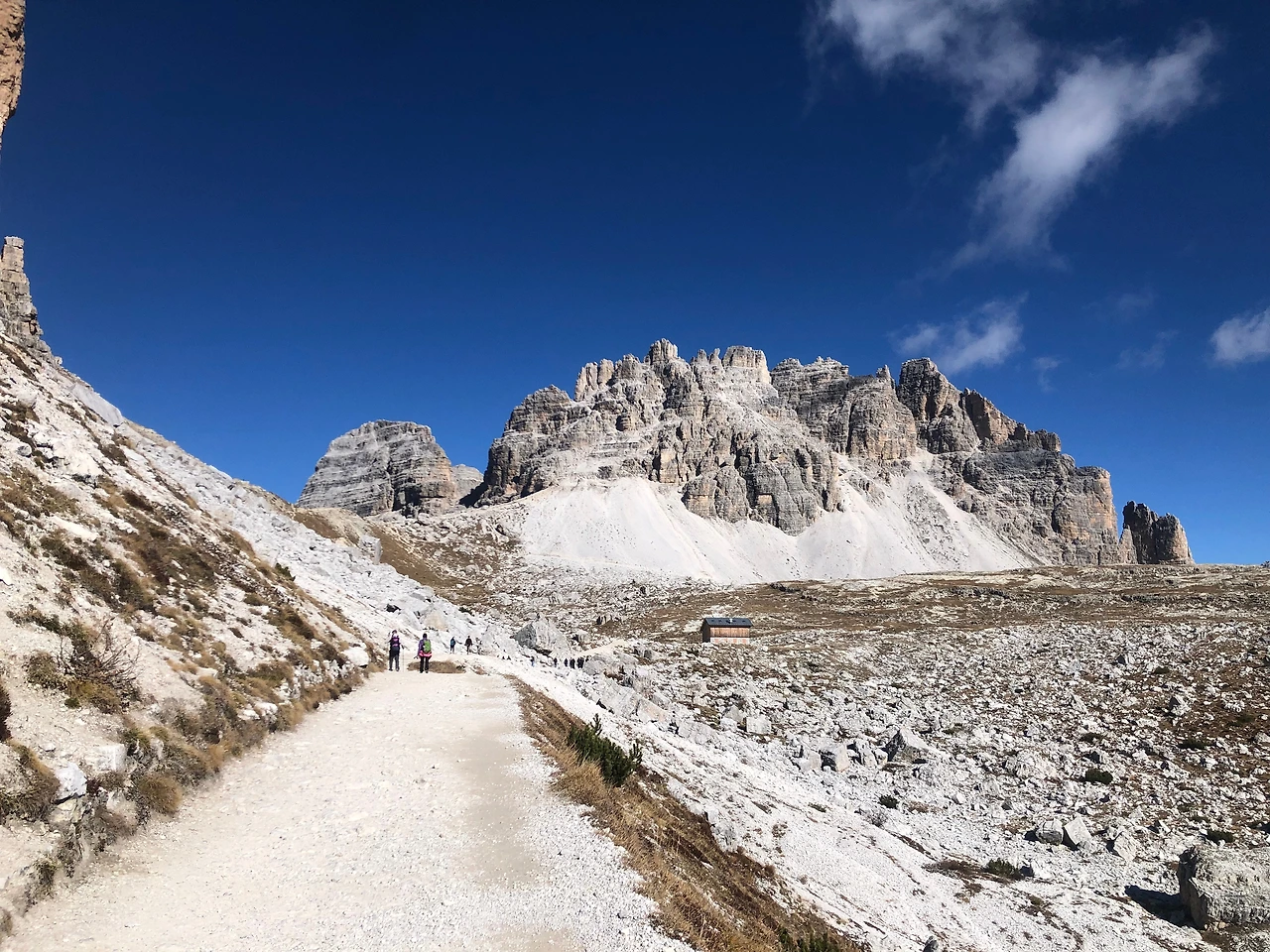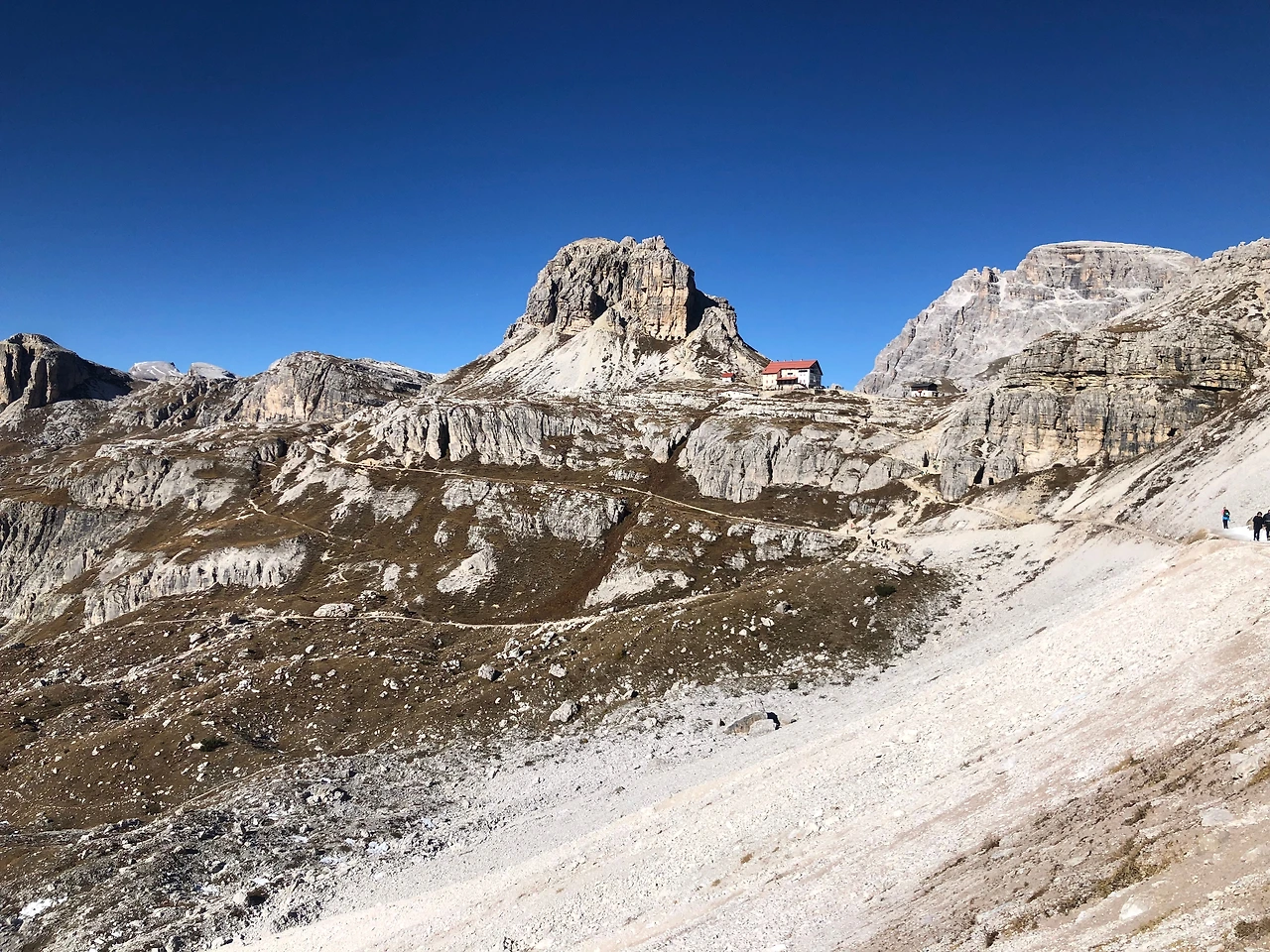멀리 로카델리 산장이 보인다. 그 왼쪽 바위 산 중턱에는 동굴이 하나 있는데, 여기가 바로 인생샷을 건질 수 있는 곳이니 꼭 들러야 한다. 동굴 안에서 본 트레치메를 담을 수 있는 곳이다.