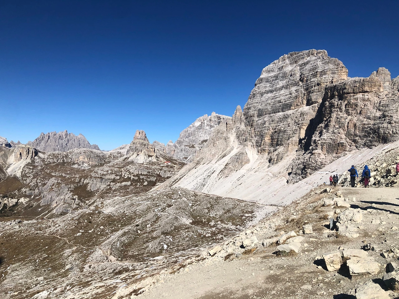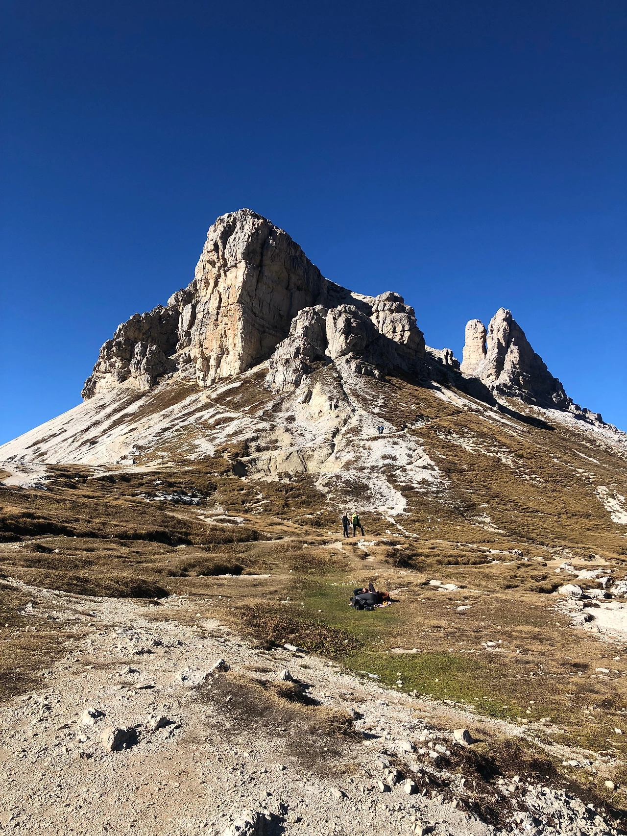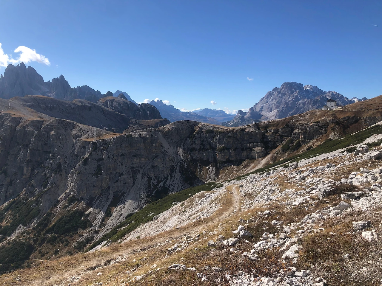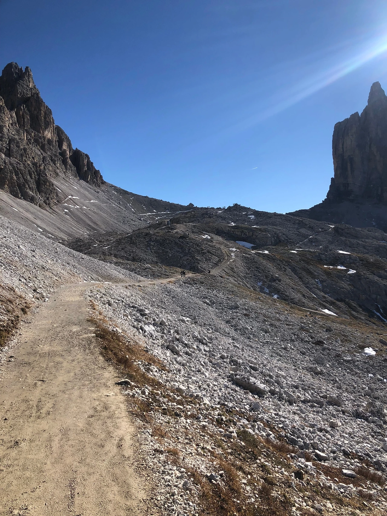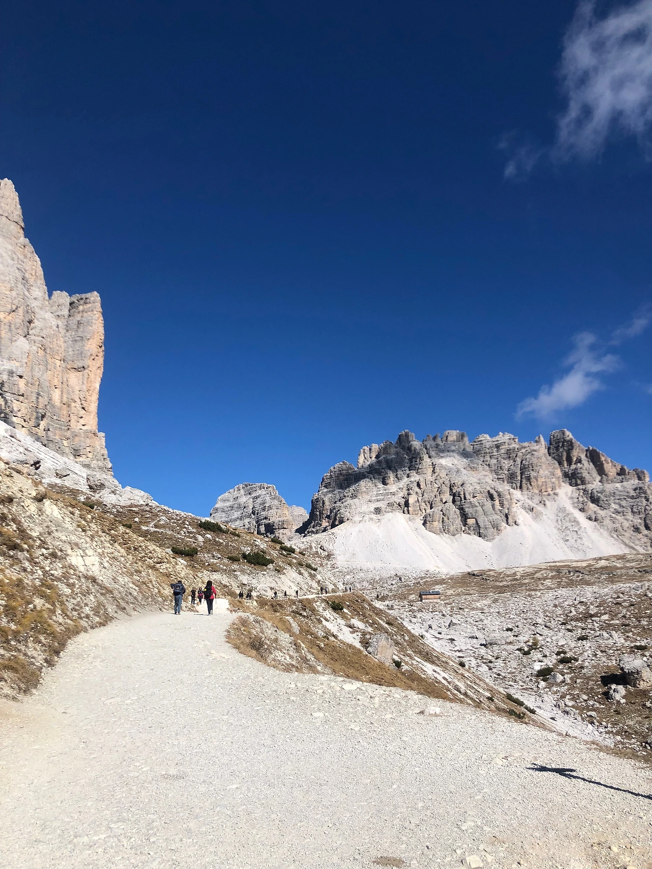 멀리 로카델리 산장이 보인다. 그 왼쪽 바위 산 중턱에는 동굴이 하나 있는데, 여기가 바로 인생샷을 건질 수 있는 곳이니 꼭 들러야 한다. 동굴 안에서 본 트레치메를 담을 수 있는 곳이다.
