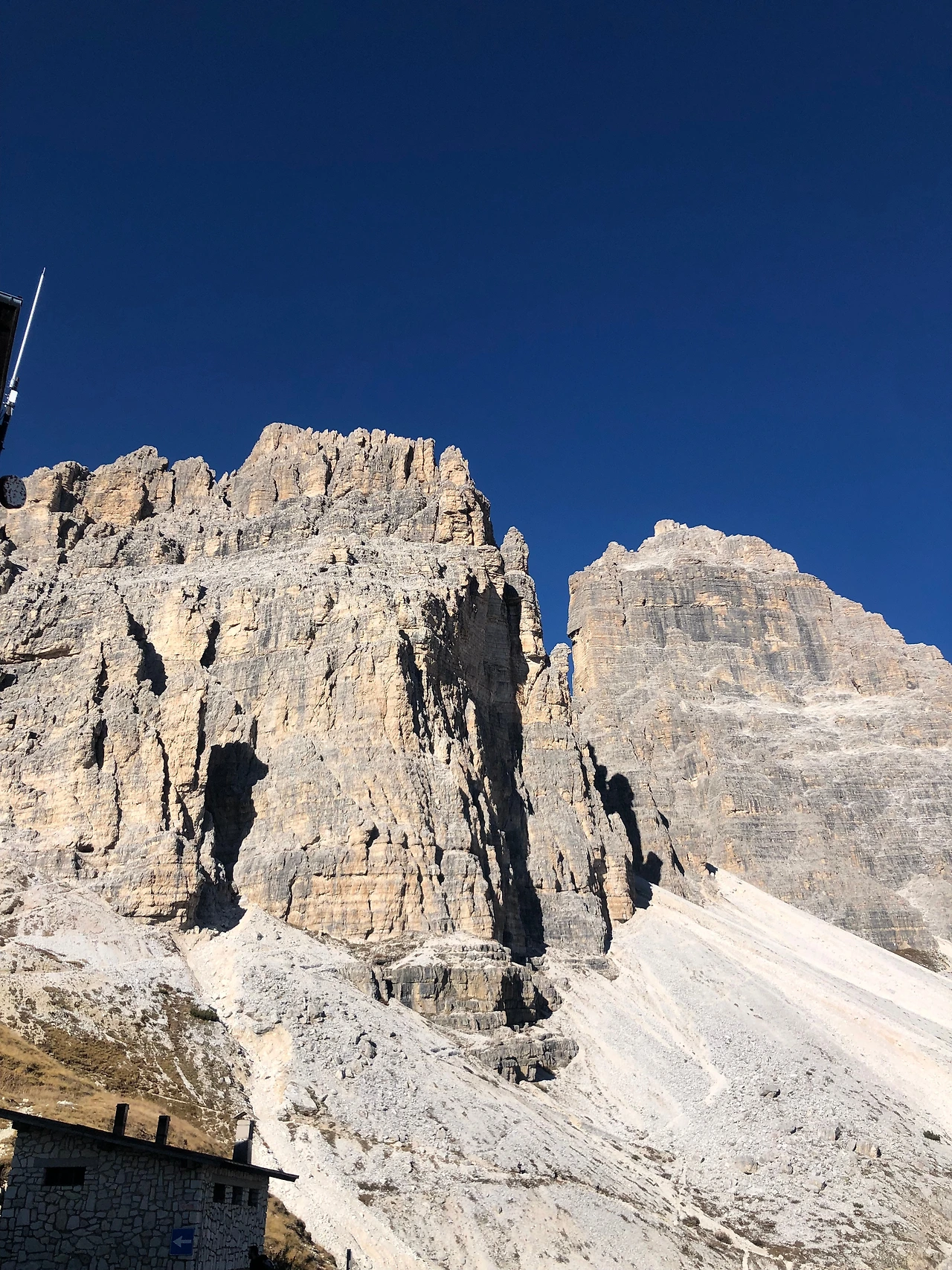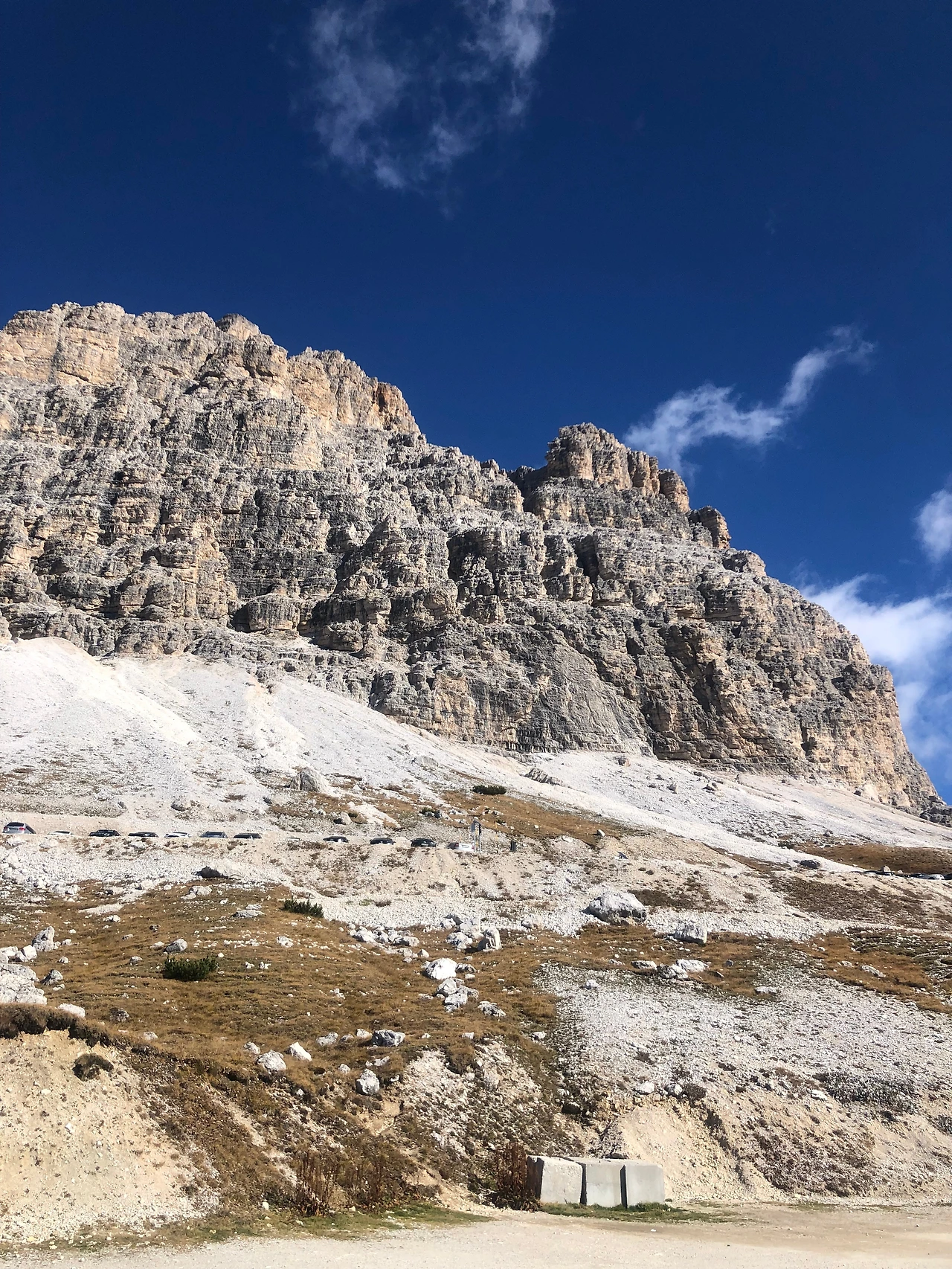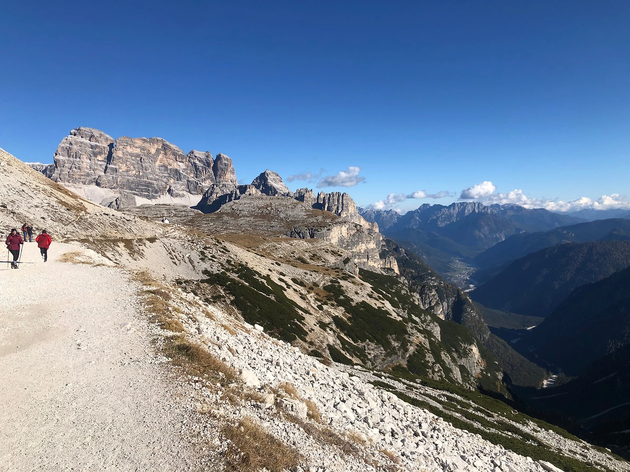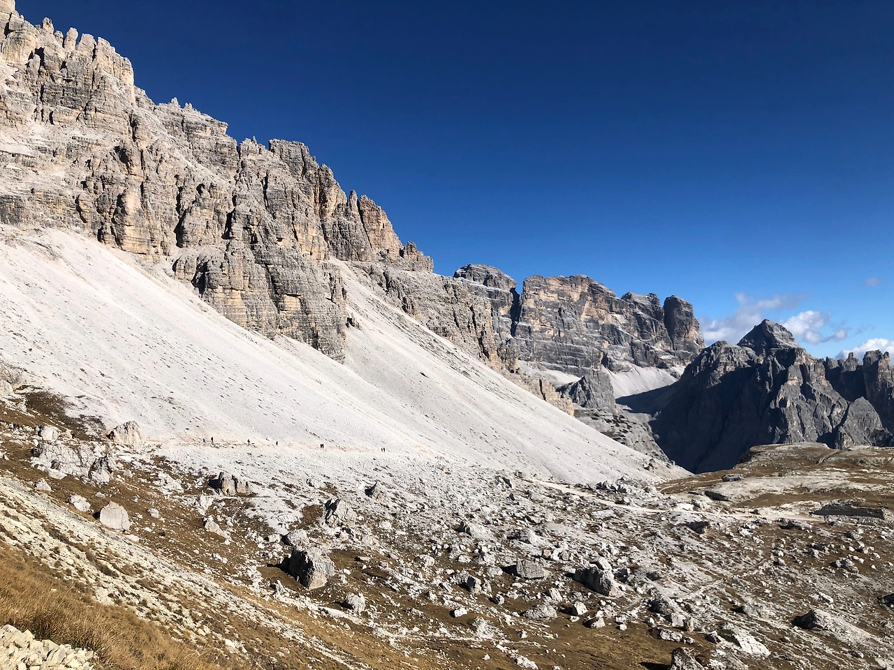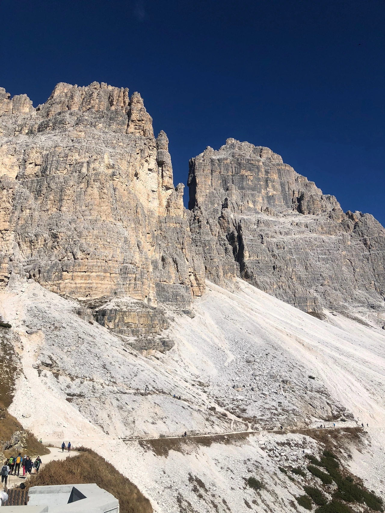 멀리 로카델리 산장이 보인다. 그 왼쪽 바위 산 중턱에는 동굴이 하나 있는데, 여기가 바로 인생샷을 건질 수 있는 곳이니 꼭 들러야 한다. 동굴 안에서 본 트레치메를 담을 수 있는 곳이다.