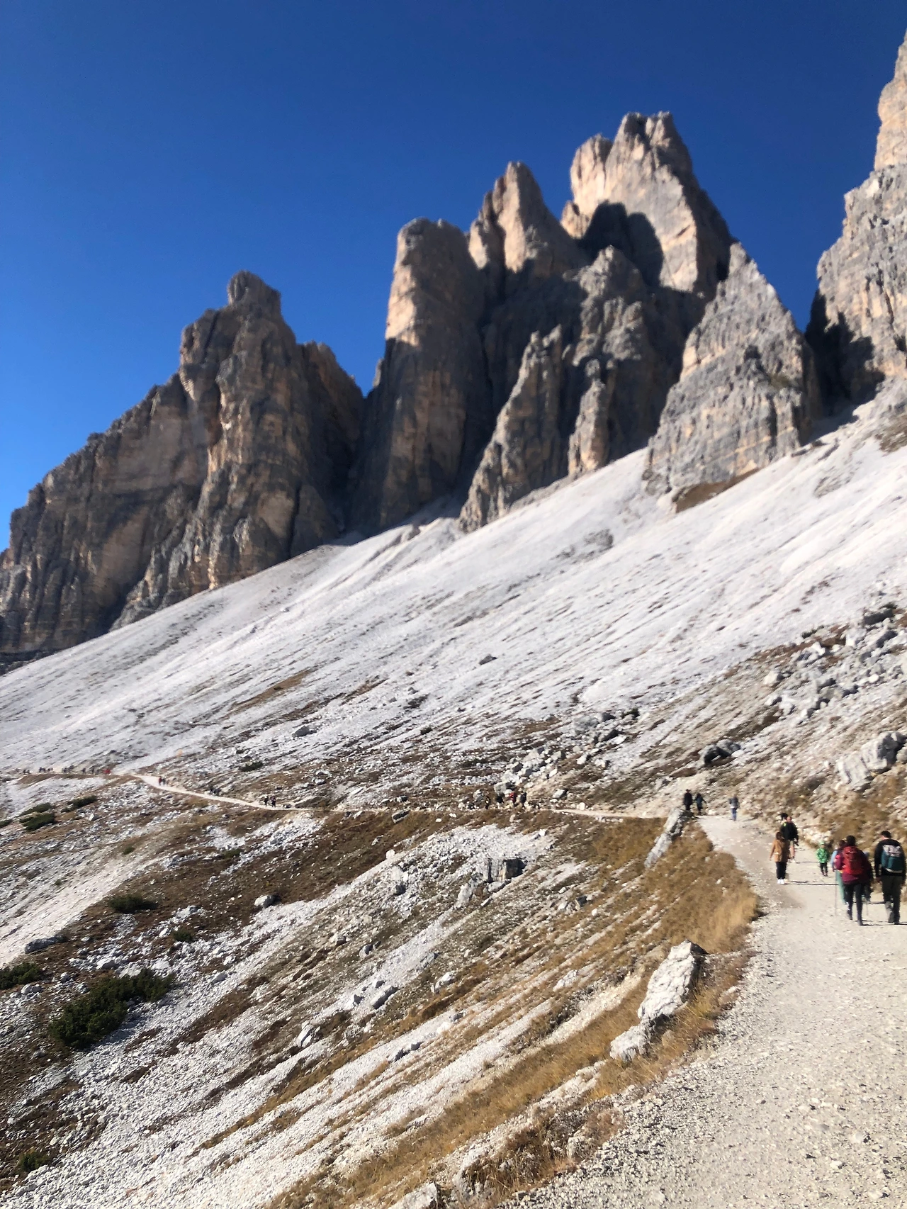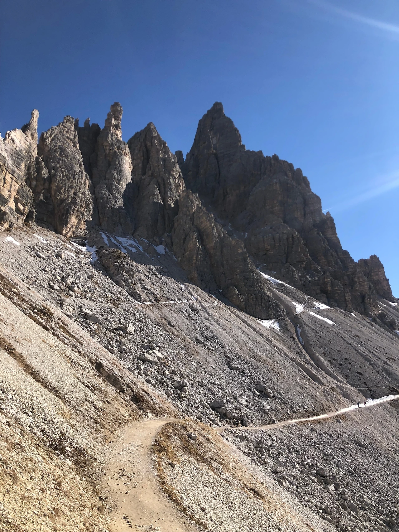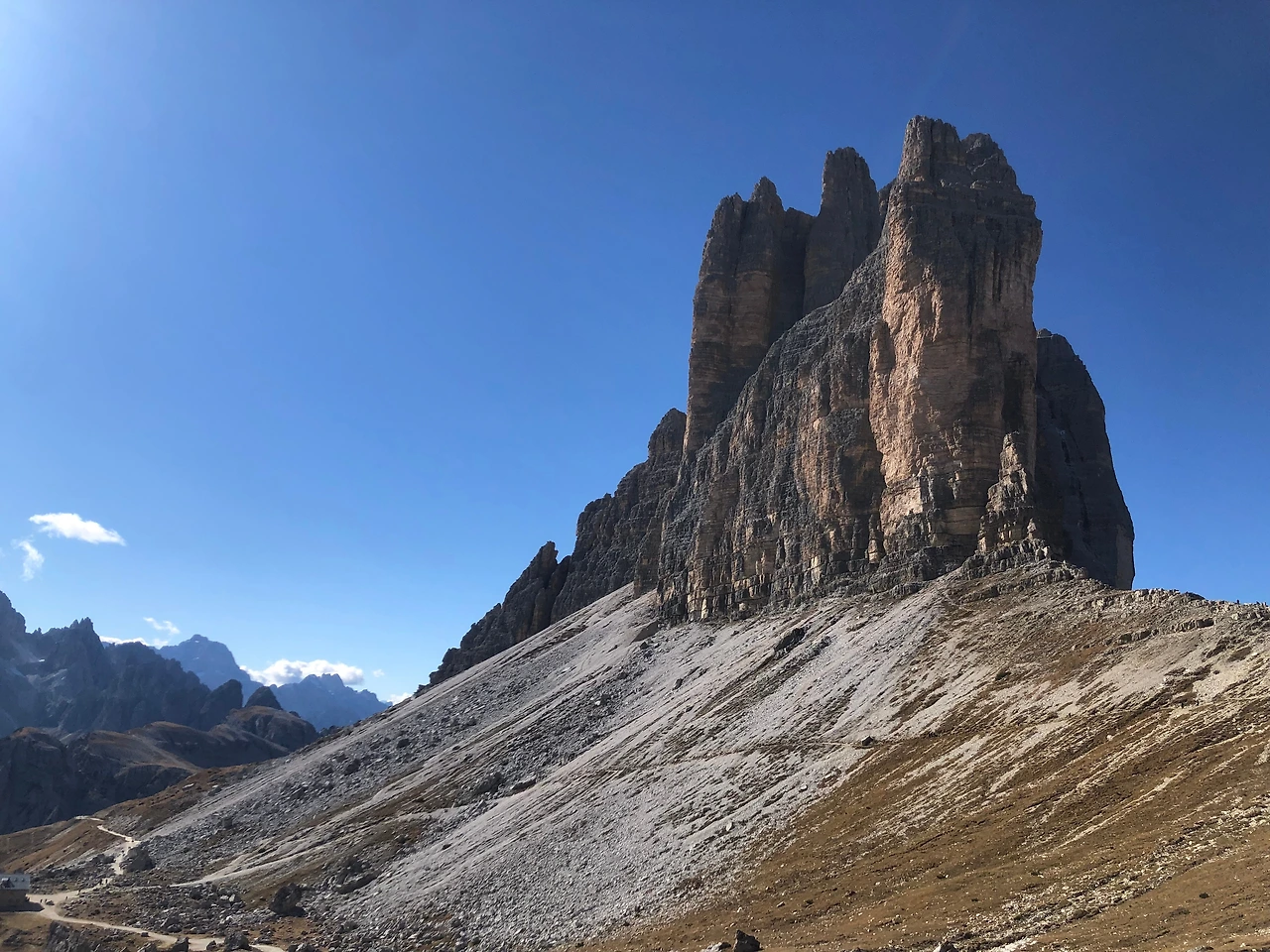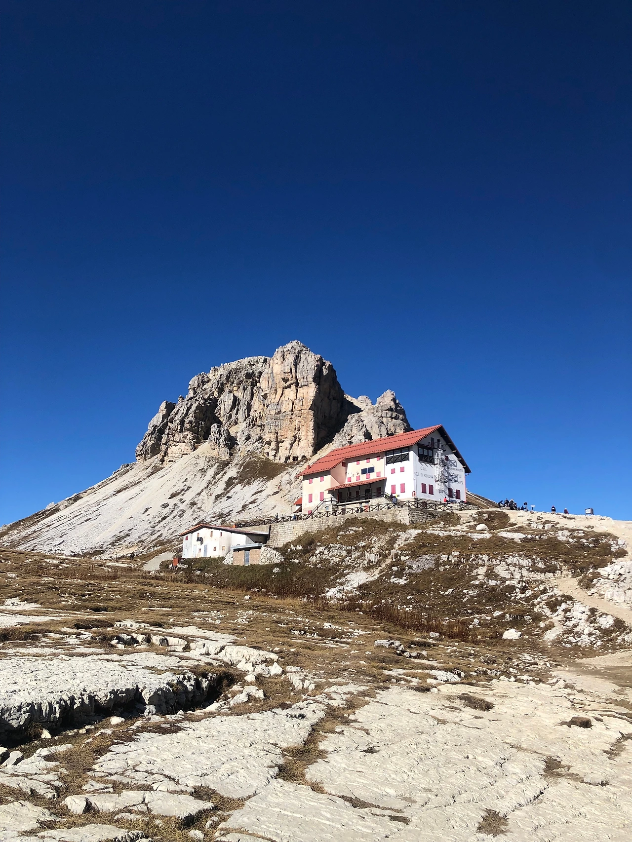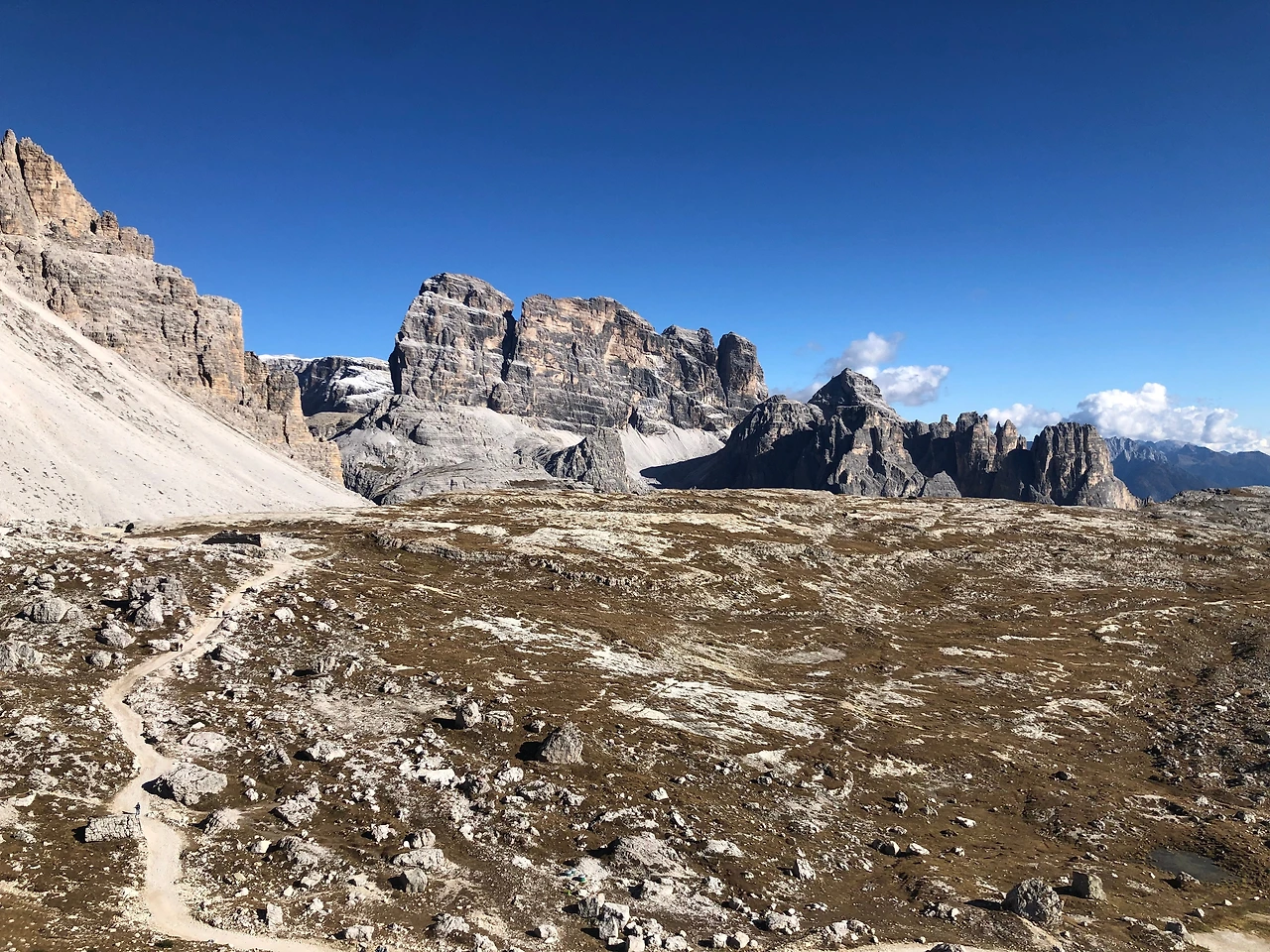 멀리 로카델리 산장이 보인다. 그 왼쪽 바위 산 중턱에는 동굴이 하나 있는데, 여기가 바로 인생샷을 건질 수 있는 곳이니 꼭 들러야 한다. 동굴 안에서 본 트레치메를 담을 수 있는 곳이다.