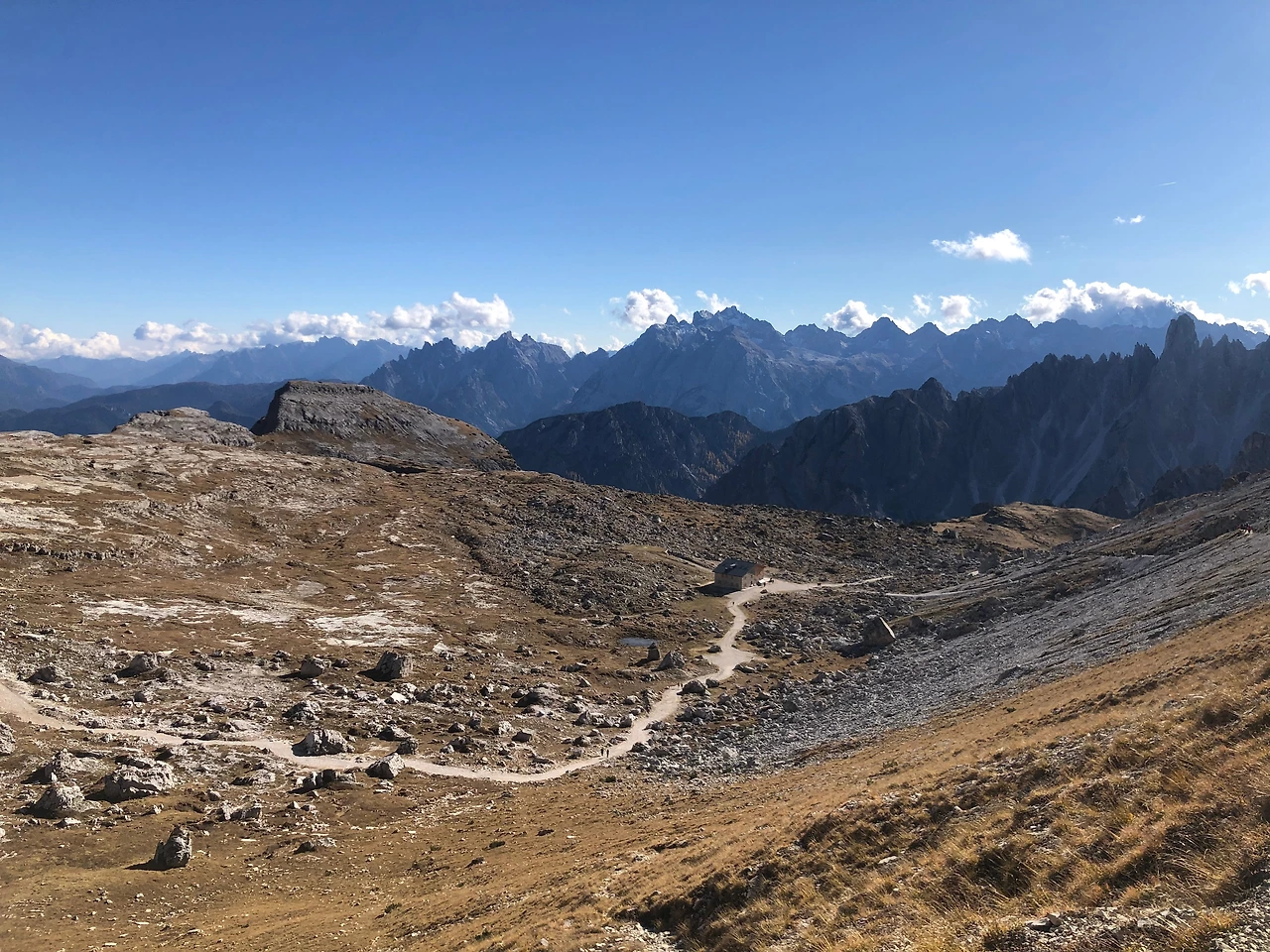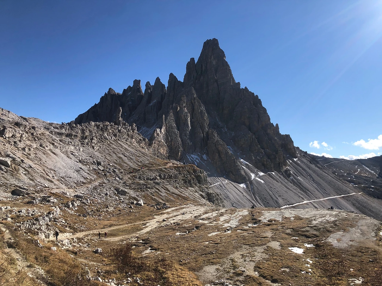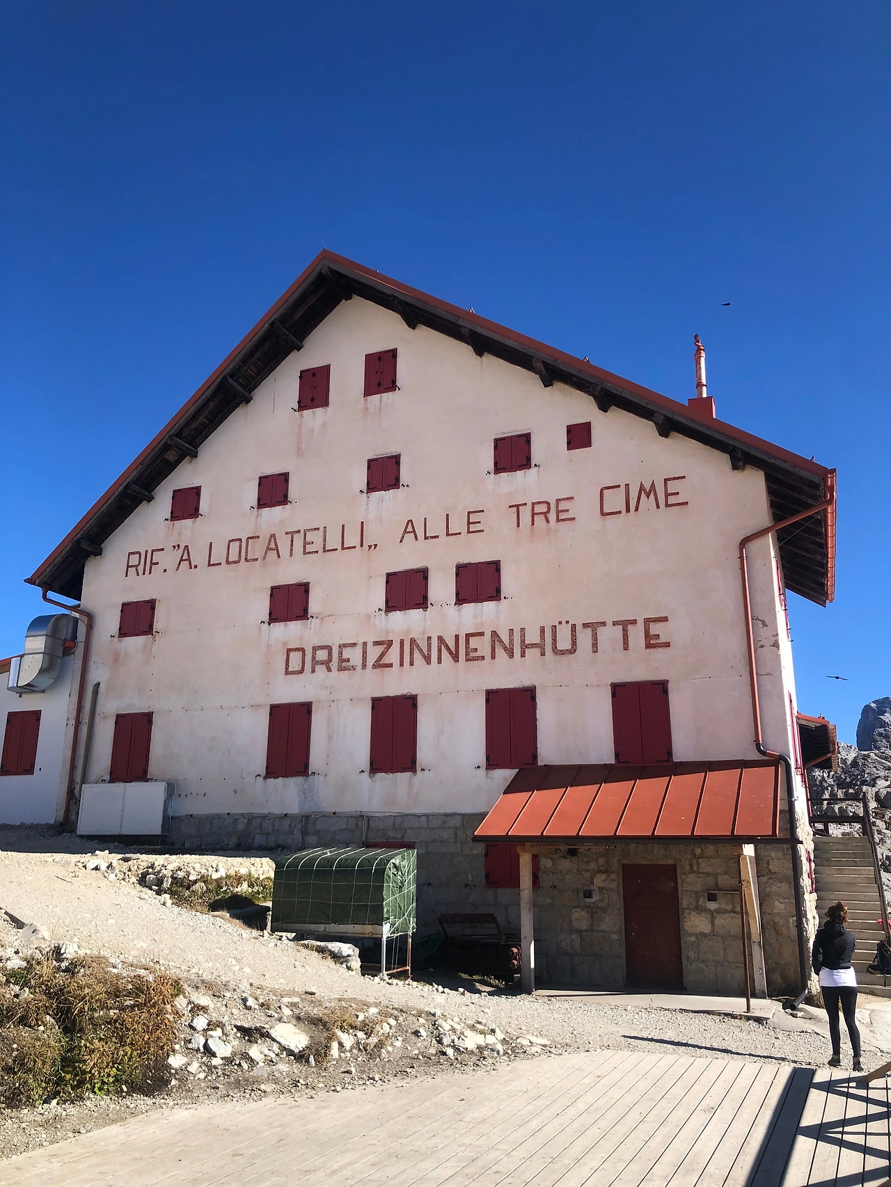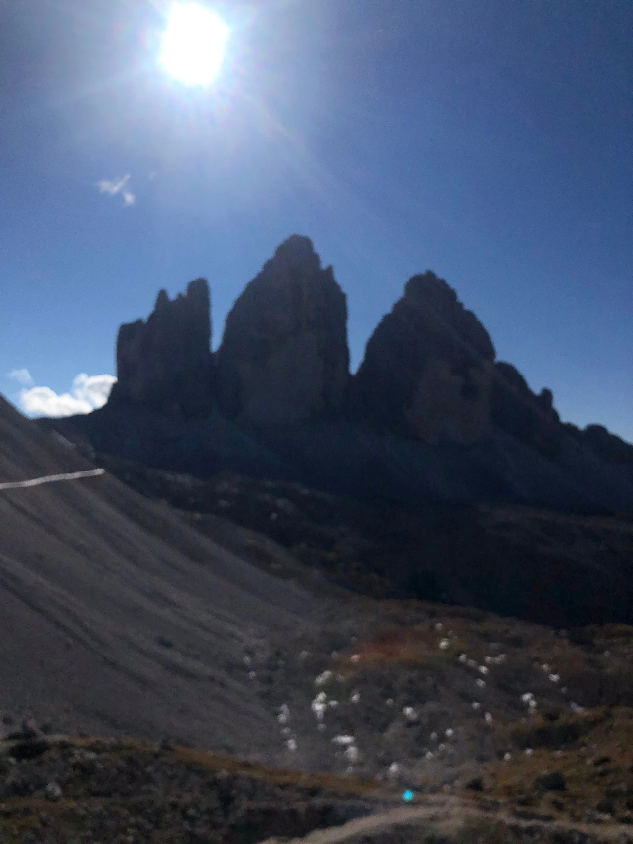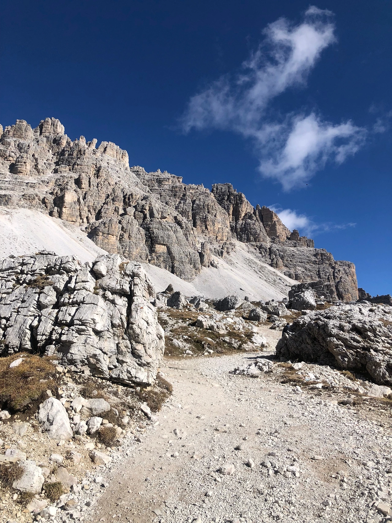 멀리 로카델리 산장이 보인다. 그 왼쪽 바위 산 중턱에는 동굴이 하나 있는데, 여기가 바로 인생샷을 건질 수 있는 곳이니 꼭 들러야 한다. 동굴 안에서 본 트레치메를 담을 수 있는 곳이다.