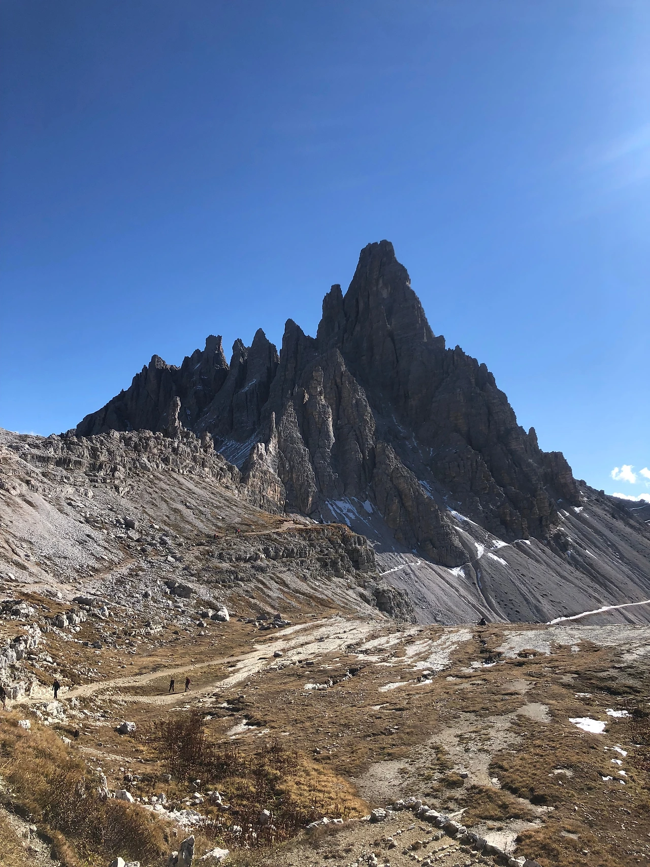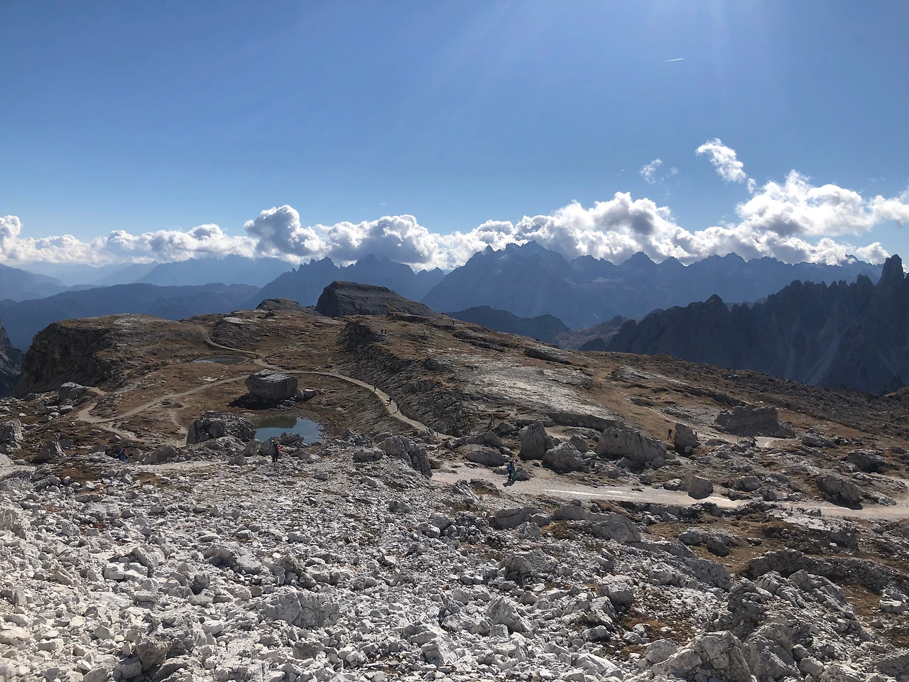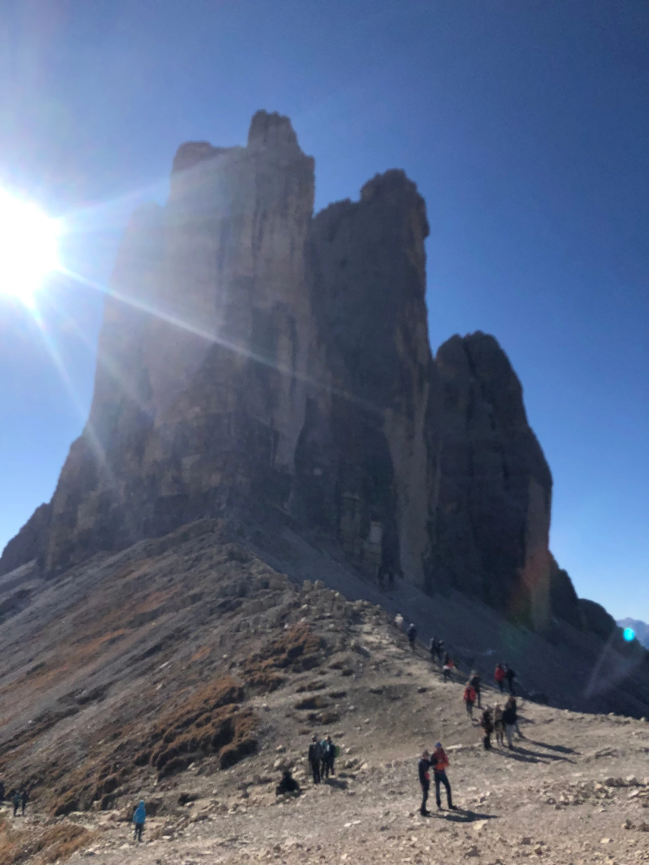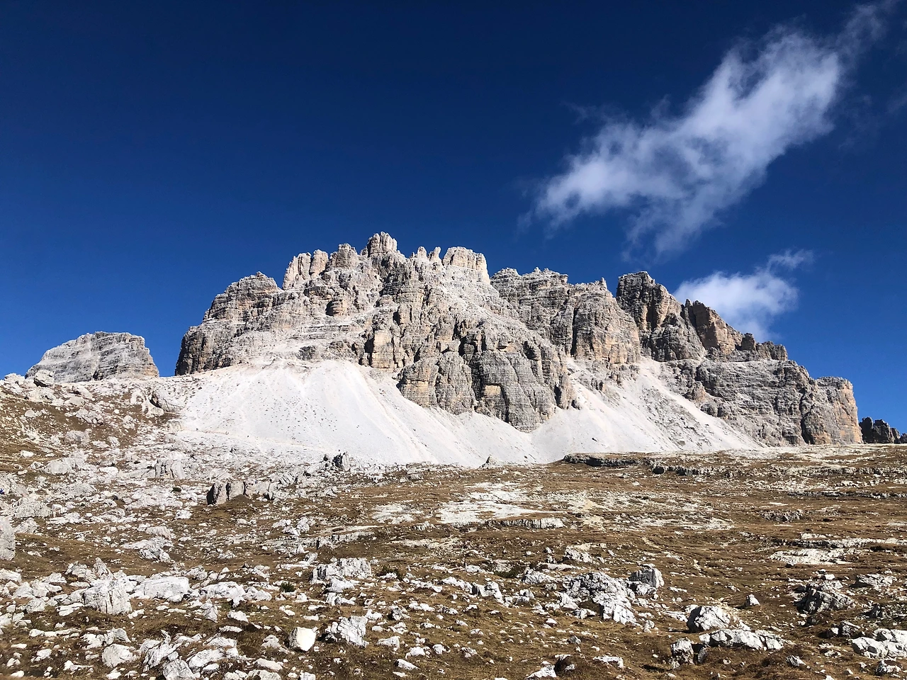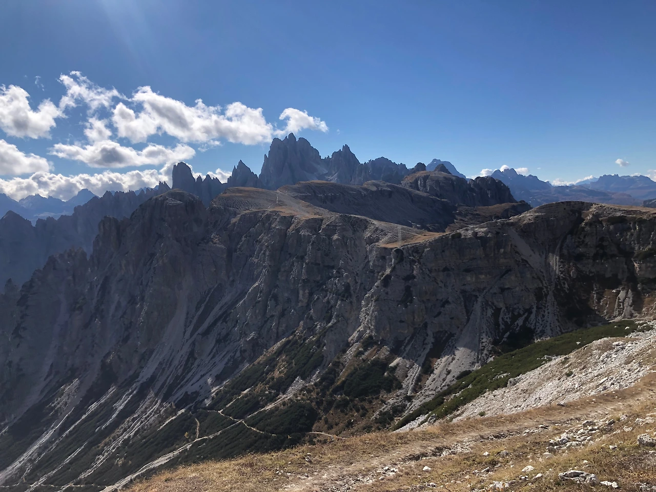 멀리 로카델리 산장이 보인다. 그 왼쪽 바위 산 중턱에는 동굴이 하나 있는데, 여기가 바로 인생샷을 건질 수 있는 곳이니 꼭 들러야 한다. 동굴 안에서 본 트레치메를 담을 수 있는 곳이다.