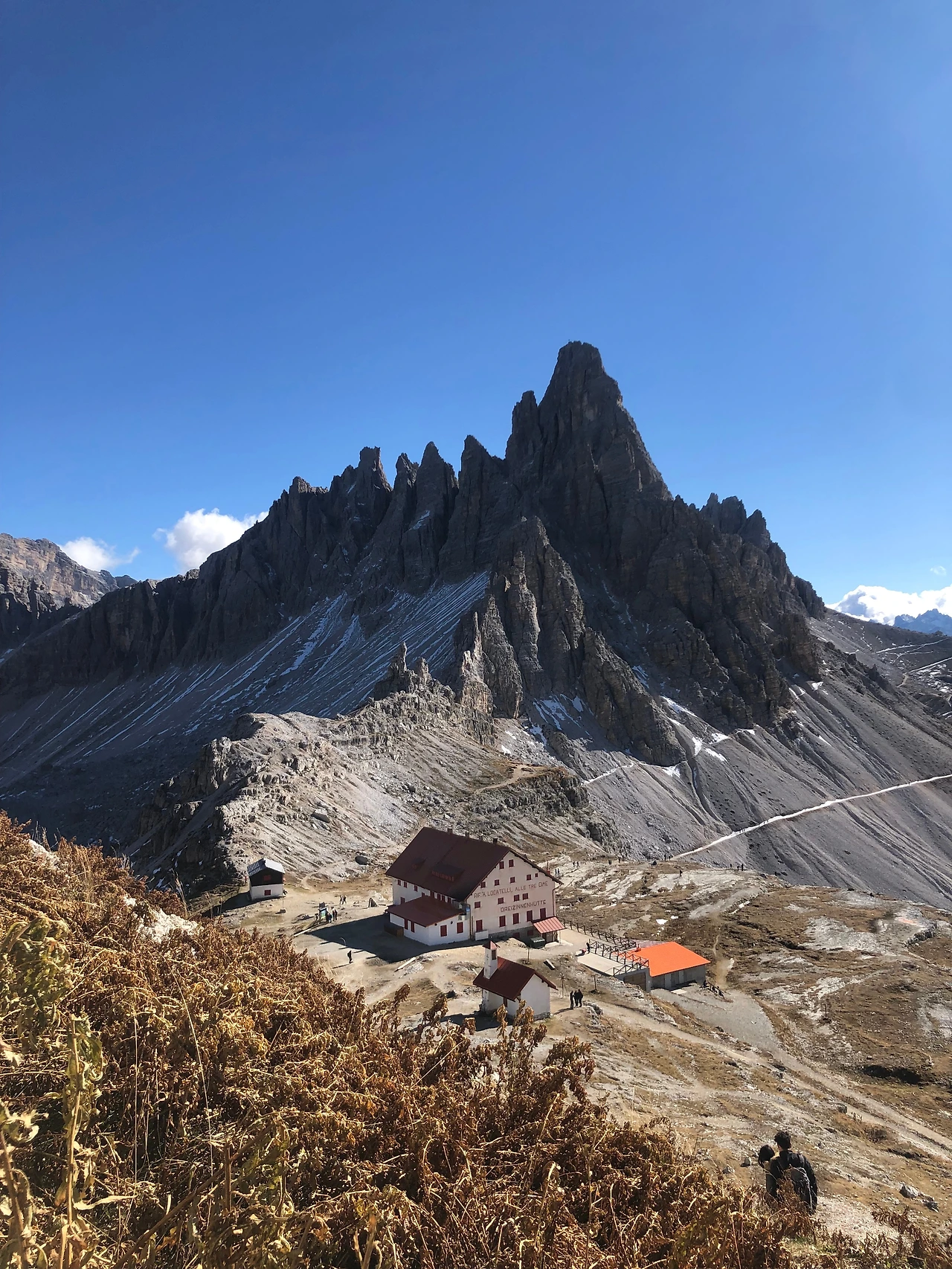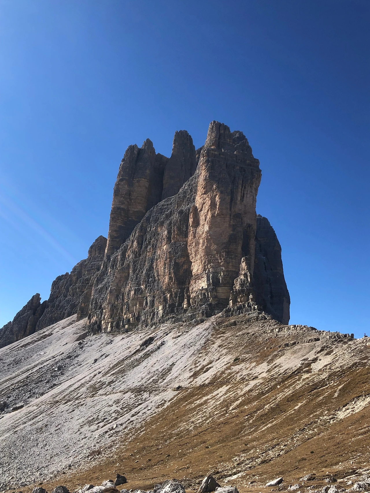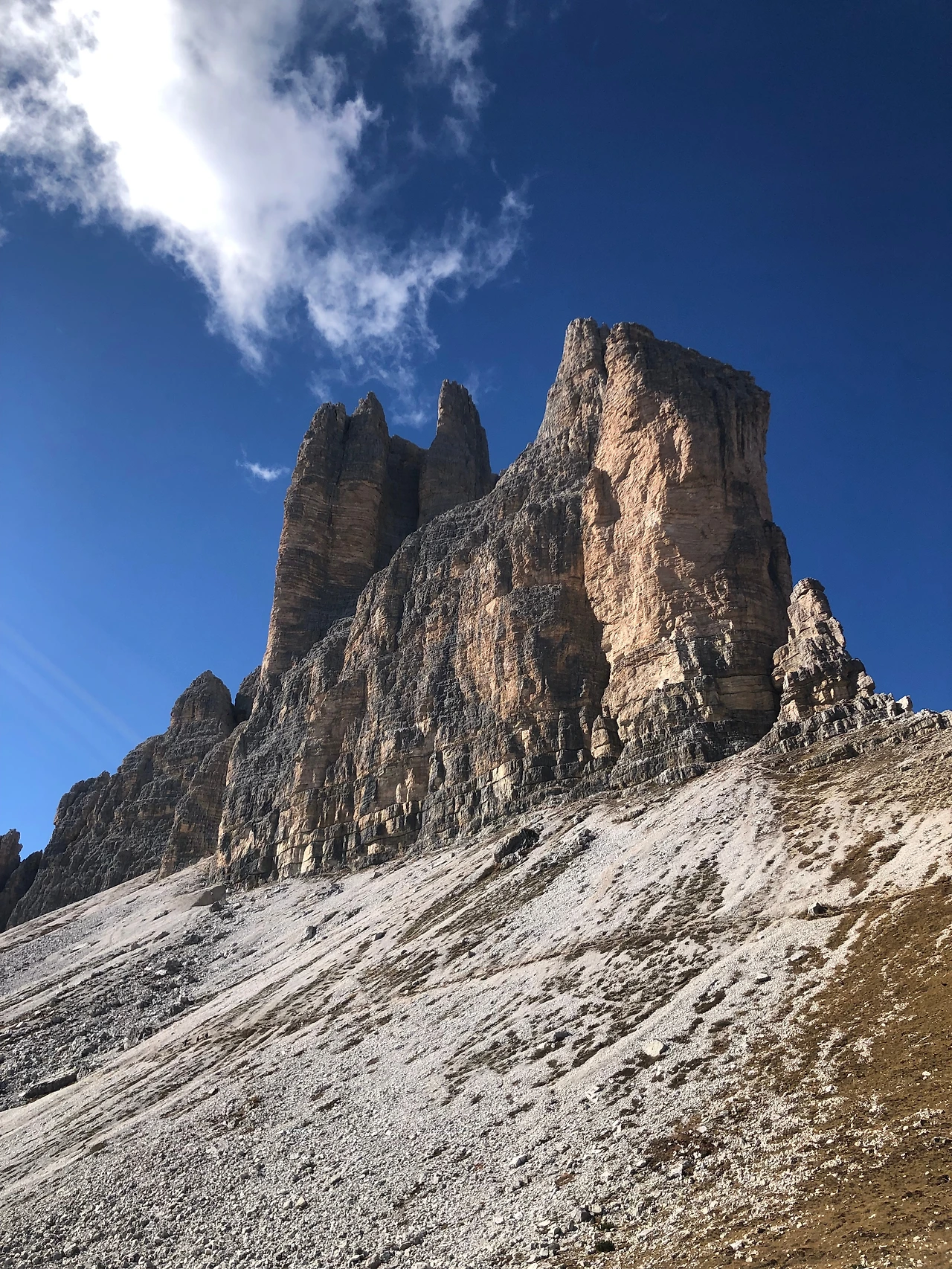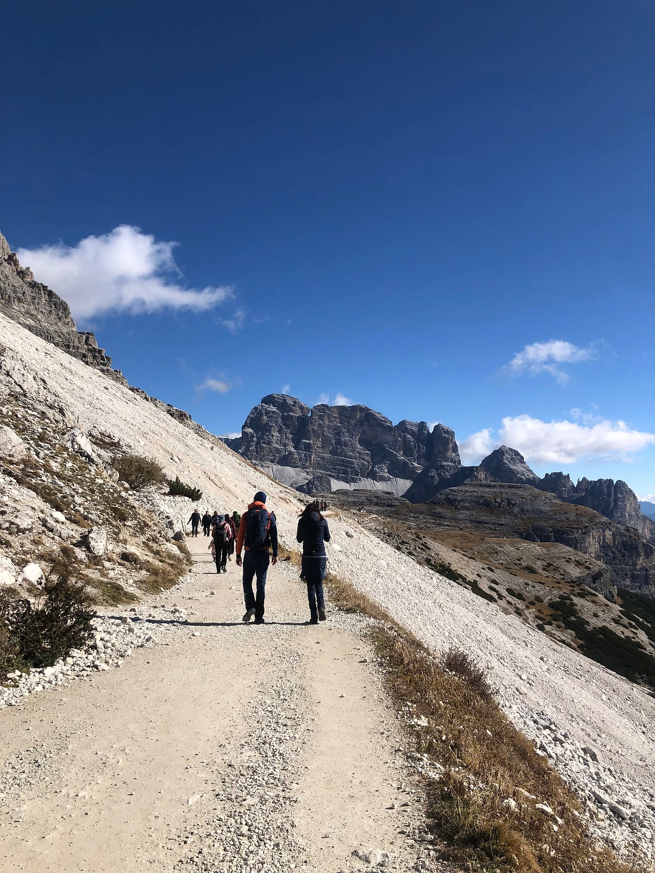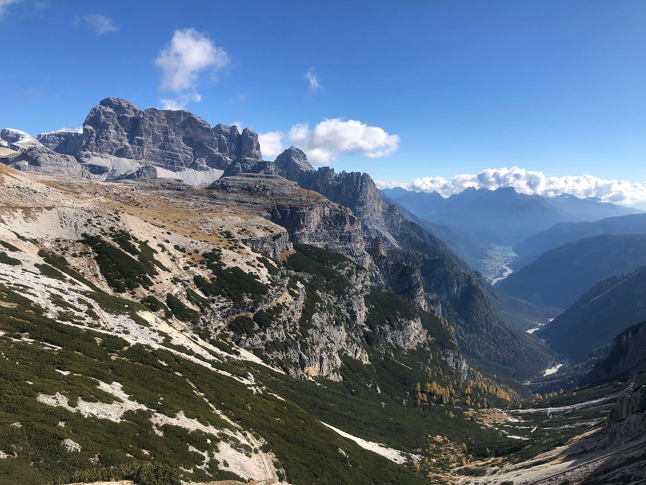 멀리 로카델리 산장이 보인다. 그 왼쪽 바위 산 중턱에는 동굴이 하나 있는데, 여기가 바로 인생샷을 건질 수 있는 곳이니 꼭 들러야 한다. 동굴 안에서 본 트레치메를 담을 수 있는 곳이다.