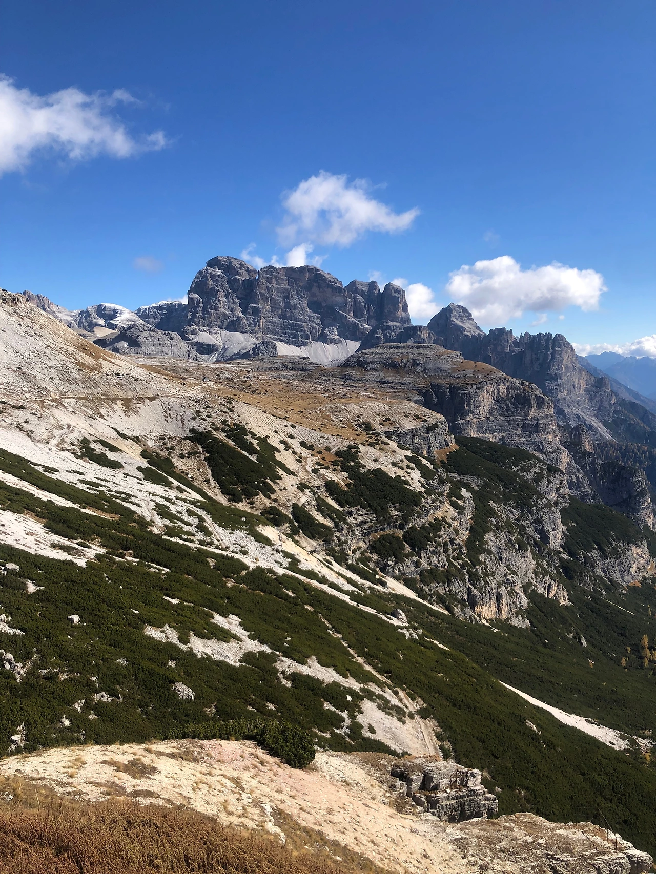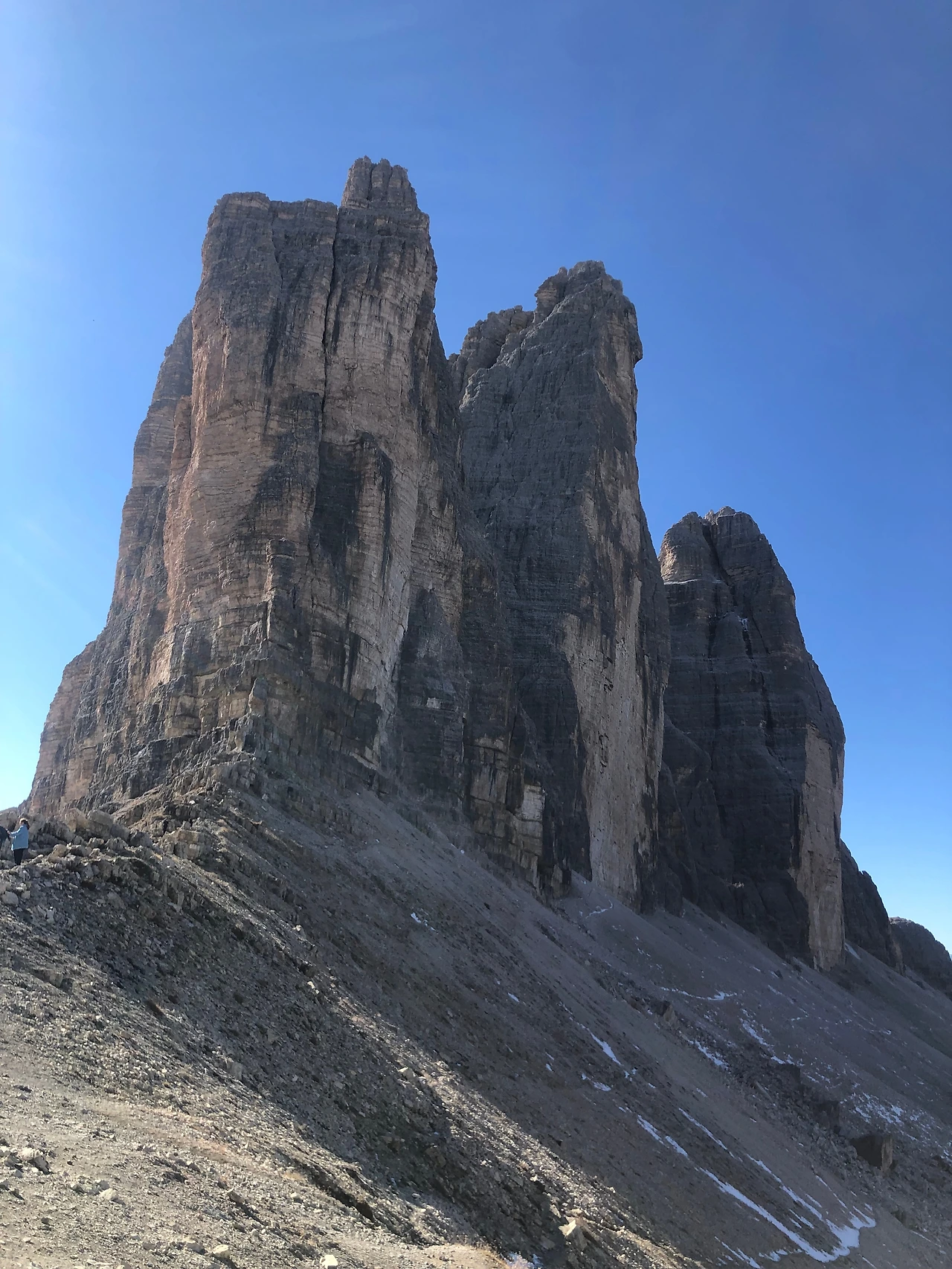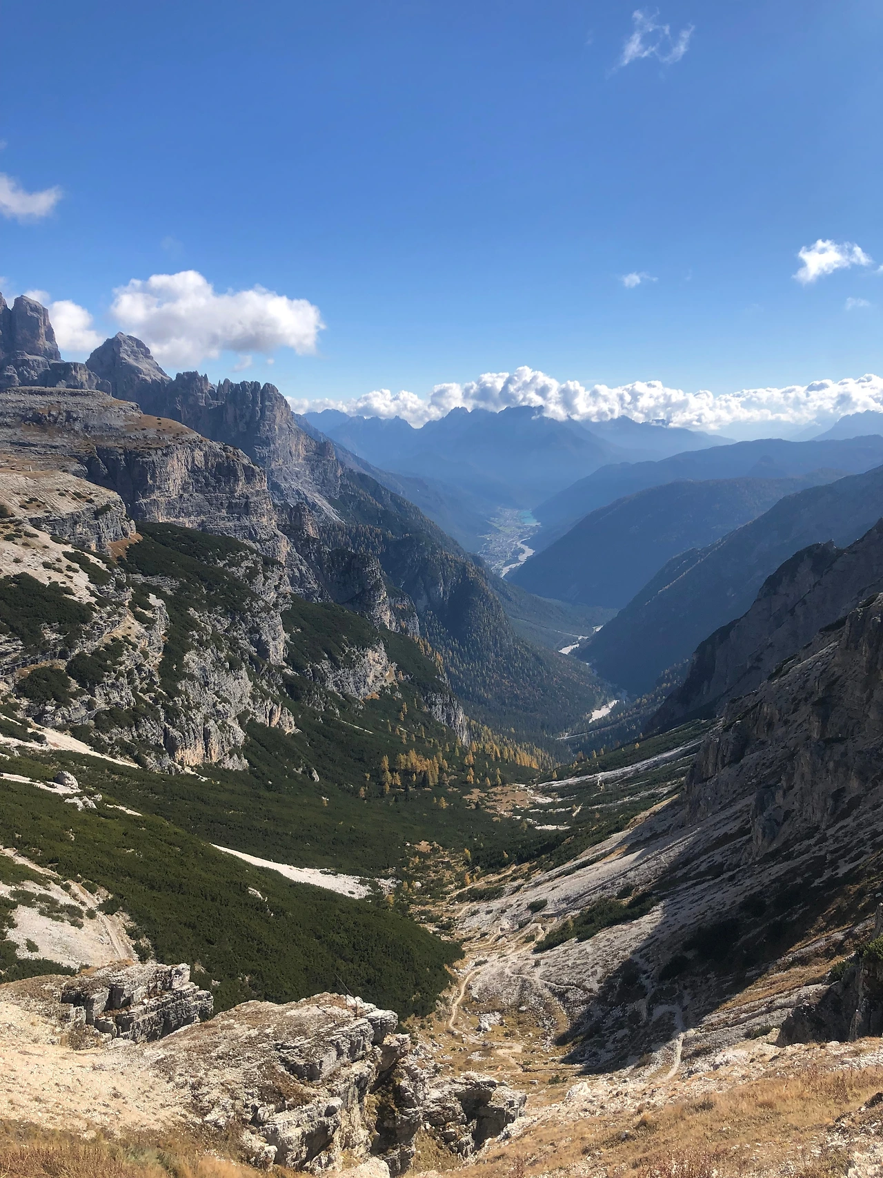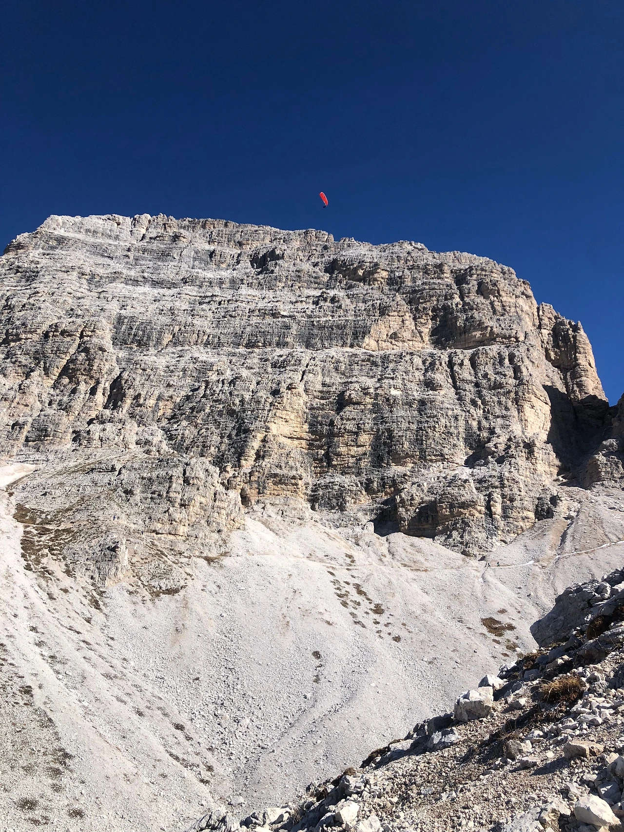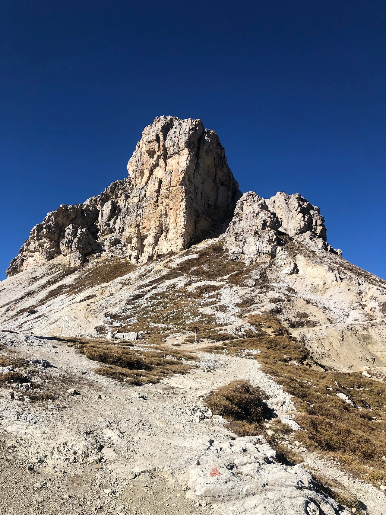 멀리 로카델리 산장이 보인다. 그 왼쪽 바위 산 중턱에는 동굴이 하나 있는데, 여기가 바로 인생샷을 건질 수 있는 곳이니 꼭 들러야 한다. 동굴 안에서 본 트레치메를 담을 수 있는 곳이다.