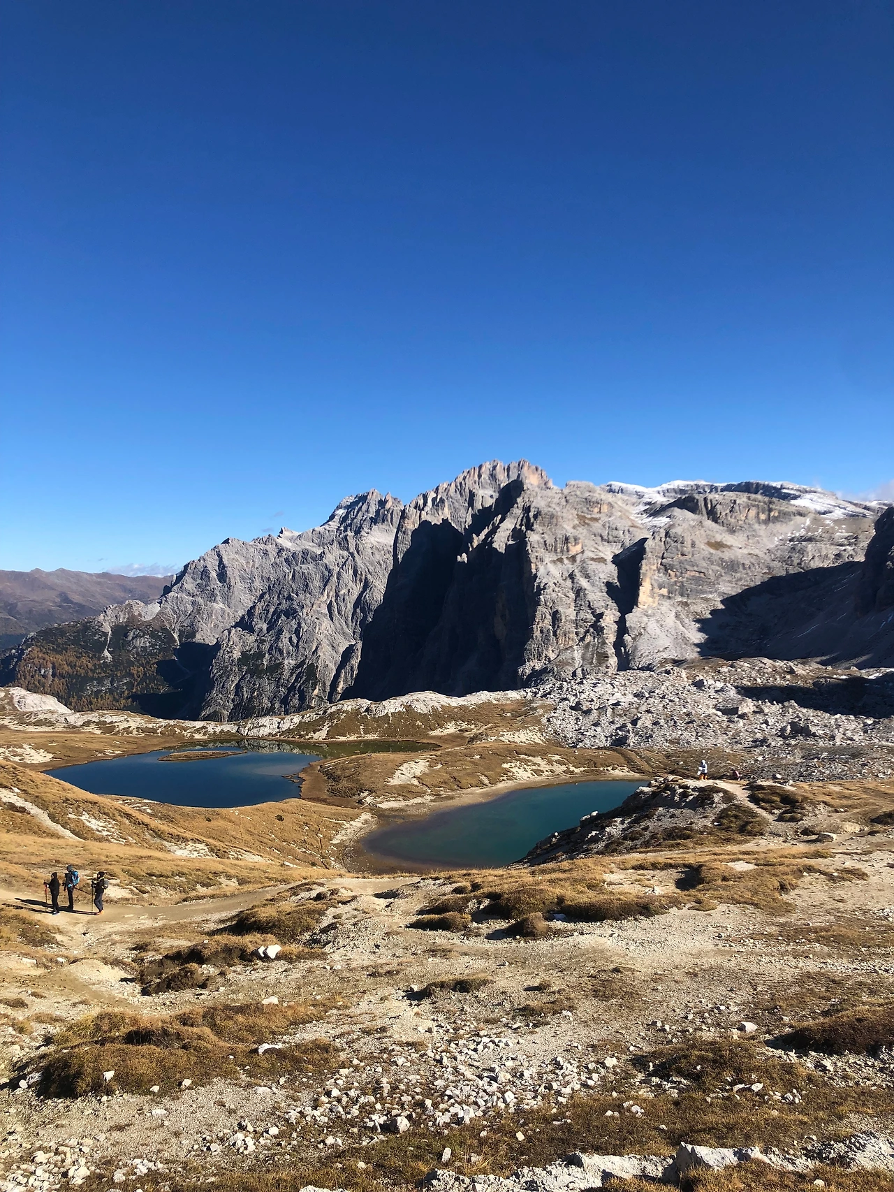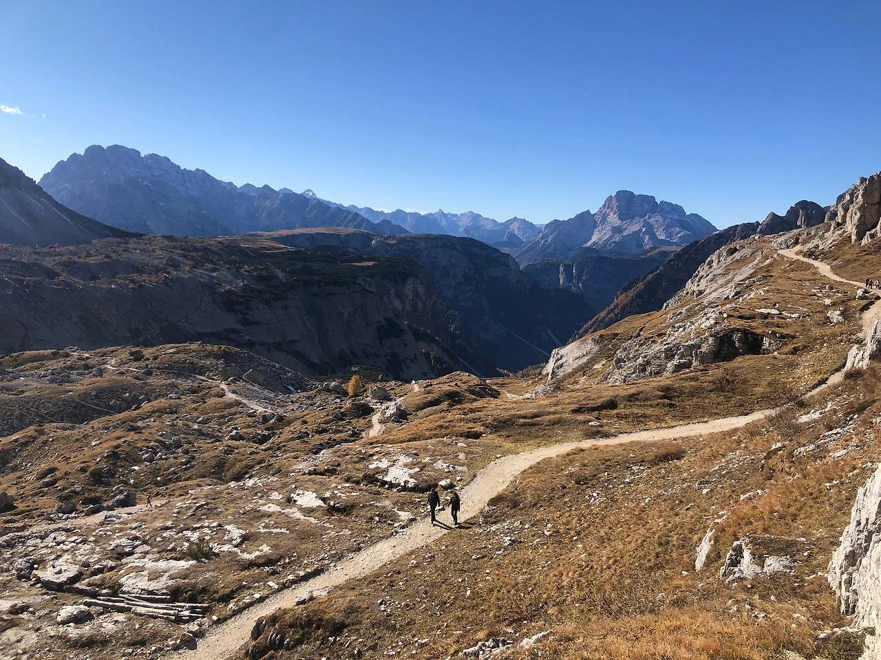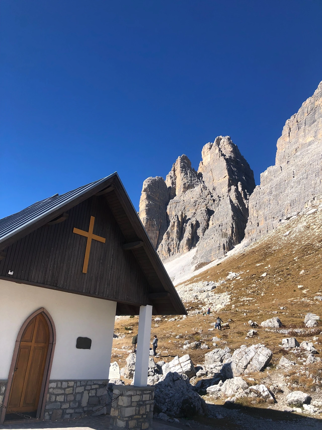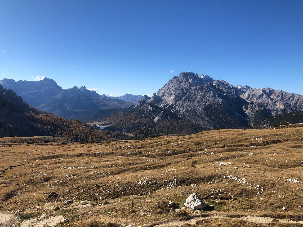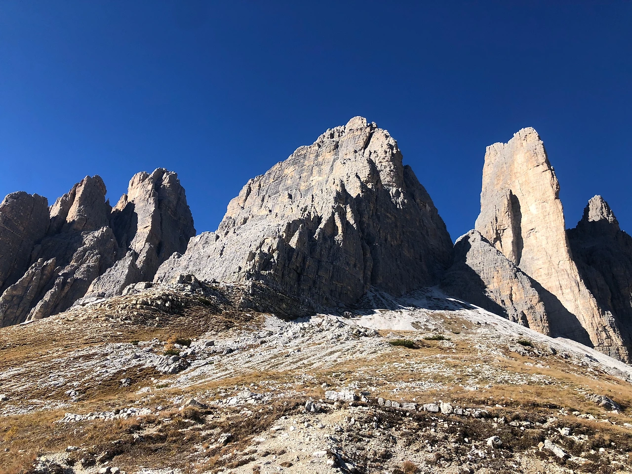 멀리 로카델리 산장이 보인다. 그 왼쪽 바위 산 중턱에는 동굴이 하나 있는데, 여기가 바로 인생샷을 건질 수 있는 곳이니 꼭 들러야 한다. 동굴 안에서 본 트레치메를 담을 수 있는 곳이다.