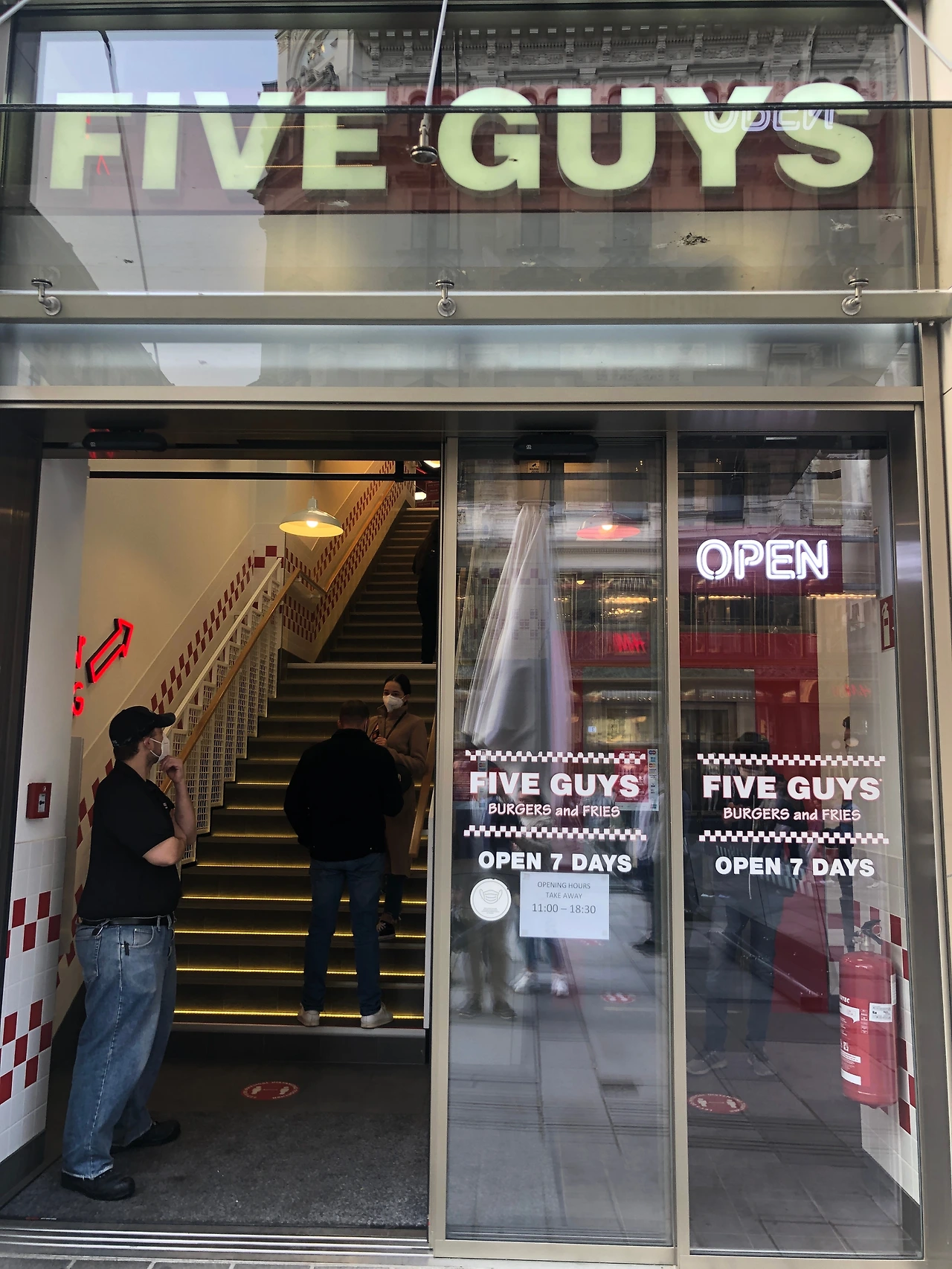 그러던 중 어떤 가게가 있었는지도 기억이 안나는 자리에 사람들이 눈대중으로도 30~40명이 길게 늘어선 가게가 눈에 띈다. Five Guys다. 처음에는 뭐하는 가게인지 궁금해하면서 줄이 늘어선 걸 보니 맛집인가 보네 하고 지나쳤다. 그 후로 또 지나가게 됐는데 여전히 대기하는 사람들의 줄이 만만치 않았다. 그래서 오기가 생겼다. "먹어 보리라".
