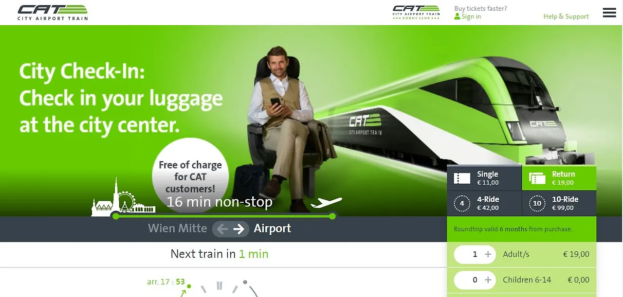 공항에 내리면 짐 찾는 곳 언저리에 밝은 초록색의 CAT를 볼 수 있다. CAT는 City Airport Train의 약자이다. 광고는 비엔나 공항에서 빈 미테(Wien Mitte)역까지 16분 만에 아주 빠르게 갈 수 있다고 뽐을 낸다. 요금은 성인 1인 기준 19유로이다. 그러나 비엔나에서 CAT를 타고 공항을 오가는 사람을 본 적도 들어본 적도 없다. 과연 이용자가 있어서 저 노선을 유지할 수 있는지도 의문이 들 정도이다.