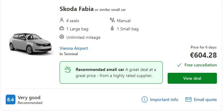 Rentalcars.com은 6일간 렌트 비용만 총 604.28유로이다. 그런데 슬로바키아 Abrix 회사의 비용은 6일이면 하루 세금 포함 25.20유로니까 총 6일이면 151.20 유로면 된다. 차이가 거의 450유로 차이가 나는 것을 알 수 있다. 그러나 슬로바키아 차는 숨어 있는 비용이 있다. 비엔나 공항으로 차를 가져다주고 공항에서 반납하기 위해서는 배송료를 내야 한다. 한 번에 35유로를 받는다. 그러니 비엔나 공항에서 차를 받고 쓰고 나서 다시 반납하려면 도합 70유로가 더 든다. 참고로 비엔나 시내까지 가져다주고 시내에서 차를 가져가는 비용은 편도 50유로, 왕복 100유로이다. 그리고 6일이면 오스트리아 고속도로 통행권(vignet)을 사야 한다. 10유로이다. 그리고 여름 피크 시즌에는 20% 정도 추가 요금을 청구한다고 한다.(나는 10월, 2월에 이용해서 추가 요금은 낸 적이 없다). 그래서 동일한 기간에 동일한 조건으로 슬로바키아 렌터카 비용을 계산해 보면 151.20*1.2 + 70 + 10 = 261.44유로가 된다. 그래도 Rentalcars.com에 비해 340유로 정도 저렴한 결과가 나온다. 이 정도면 충분히 슬로바키아 렌터카를 이용할 만한 이유가 되지 않을까 생각한다. 다만 차 종류가 많지는 않아 선택지가 다양하지 않다는 점은 저렴하게 빌리는 대신 감안해야 할 포인트이다. 그리고 각각 차 보험은 별도로 들어야 한다.