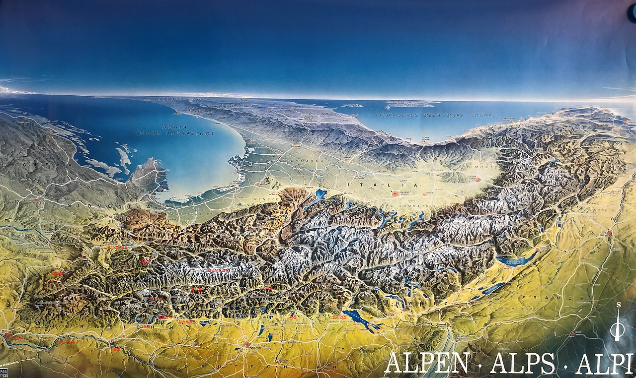 출근한 지 며칠 안돼서 미국 동료가 있는 방에 차를 한잔 마시러 초대받아 갔다. 그 친구 사무실은 아주 깔끔했고 단독 소유지만 섹션 동료들이 카페인이 필요할 때는 언제나 찾는 커피 머신이 있었다. 그런데 내 눈에 띈 건 오스트리아 지도였다. 오스트리아 지형이 한눈에 들어오는 아날로그 감성이 충만한 지도. 손쉽게 아이패드를 열어 구글맵을 띄우면 기본값 대신 지형(terrain) 옵션을 선택하면 지형을 볼 수 있다. 그런데도 난 아직은 아날로그 감성의 지도가 좋다.