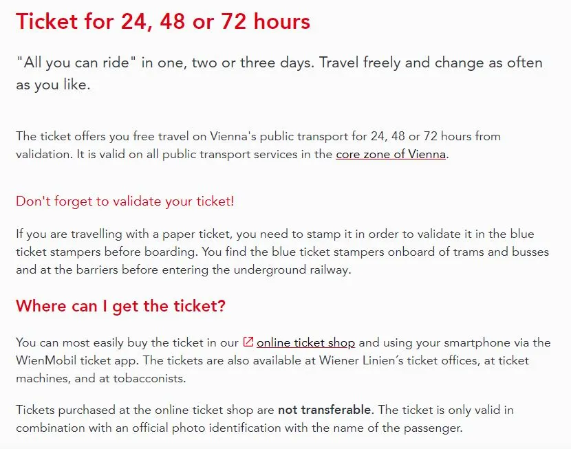 1 day 티켓과 24시간 티켓은 비엔나에 머무는 시간에 따라 같을 수도 있고 다를 수도 있다. 1 day 티켓은 5.80유로이며 펀칭한 날 하루 종일 쓸 수 있고, 다음 날 밤 1시까지만 유효하다. 그런데 24시간 티켓은 이보다 좀 더 비싼 장당 8유로인데 반해 날짜와 상관없이 펀칭한 시간으로부터 24시간 동안 쓸 수 있다. 따라서 비엔나에 머무는 시간과 사용 패턴을 보고 그에 맞는 티켓을 사는 지혜를 발휘하면 경제적인 여행을 할 수 있을 것 같다. 지인 J와 같은 억울한 벌금 사례를 방지하려면 1 day 티켓은 그날 밤 1시까지만 쓸 수 있음을 꼭 기억하자.