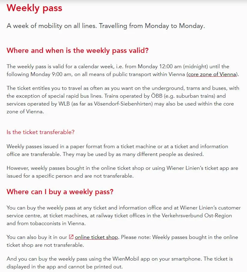한 가지 유의할 점이 있다. 일주일 권과 72시간(3일권) 티켓 가격이 같다. 주간 티켓(weekly ticket)은 월요일 00시(자정)부터 그다음 주 월요일 오전 9시까지 유효하다. 즉, 7일 동안 쓸 수 있다. 그런데 72시간권과 가격이 같은 점은 이상하다고 생각할 수 있다. 이론상으로는 이런 경우가 있다. 토요일 오전 9시에 비엔나로 여행을 오는 경우를 가정하면, 주간 티켓은 월요일 오전 9시까지 밖에 못 쓰므로 사실상 48시간권과 같아지는데도 가격은 여전히 17.10유로이다. 이 때는 그냥 48시간권을 사는 것이 저 경제적이다. 따라서 자기의 여행 패턴에 따라 적절한 요금 플랜을 찾는 것도 여행 경비 절감을 위해서는 필요한 스킬이다.