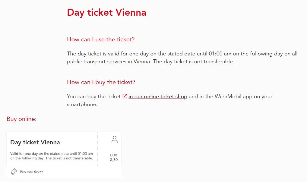 2022년 9월 현재, Wiener Linien에서 정한 대중교통 요금은 플랜별로 다양하다. 1회권은 2.40유로, 오늘자 환율로 계산하면 3,250원 정도이다. 우리나라 지하철 요금이 1,250원임을 감안하면 약 3배쯤이지만 유럽의 물가와 무제한 환승까지 포함된 금액이라 그다지 비싸게 느껴지지는 않는다. 어린이는 50% 할인이고, 6세 미만은 무료다.